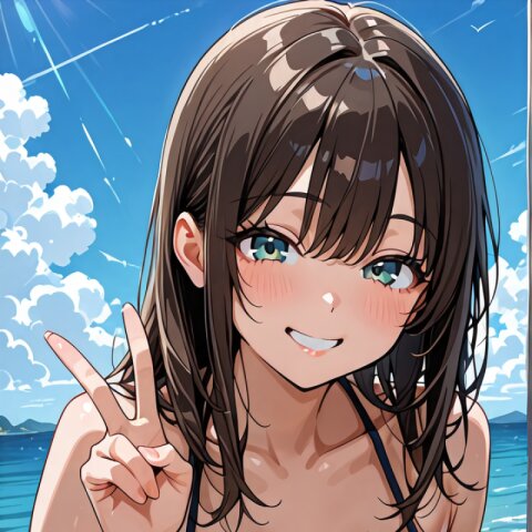 1girl, huge breasts, swimsuit, leaning forward, beach, smiling, v sign