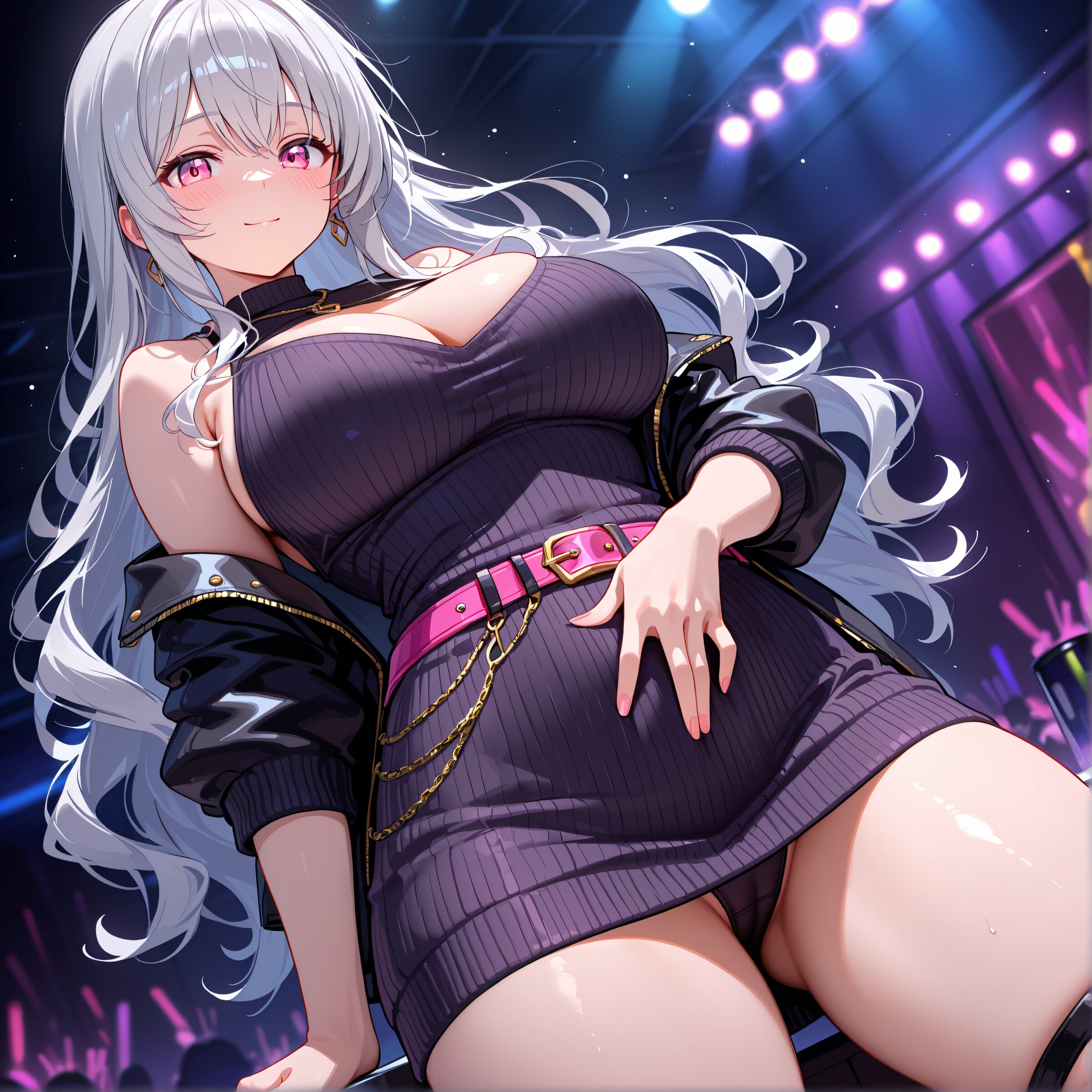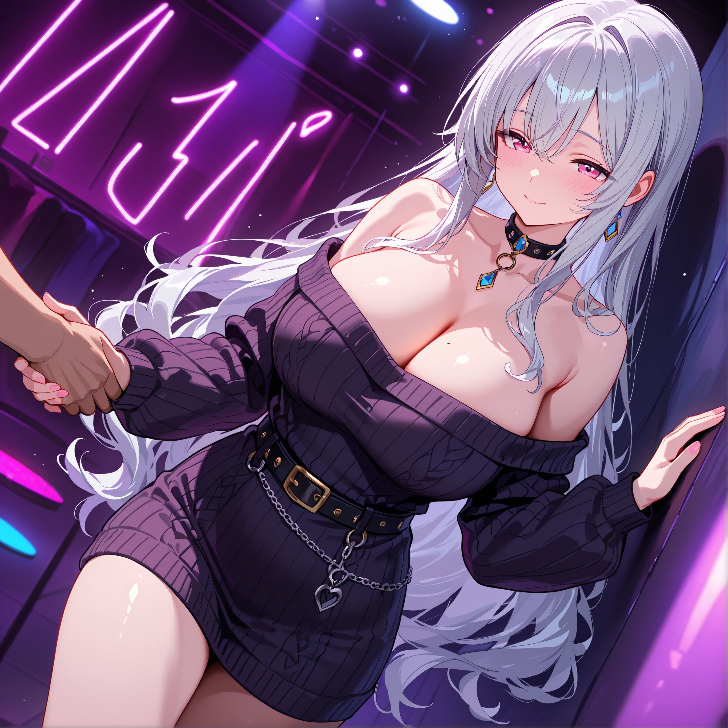 rating explicit, large breasts,silver hair,long sidelocks,long hair,,wavy hair,pink eyes,tareme,, sweater dress,off shoulder,belt, nightclub, dynamic angle, guided breast grab, cute face,anime style,,masterpiece,best quality,ultra detail,intricate detail,absolutely resolution,8k, newest,digital-cel,