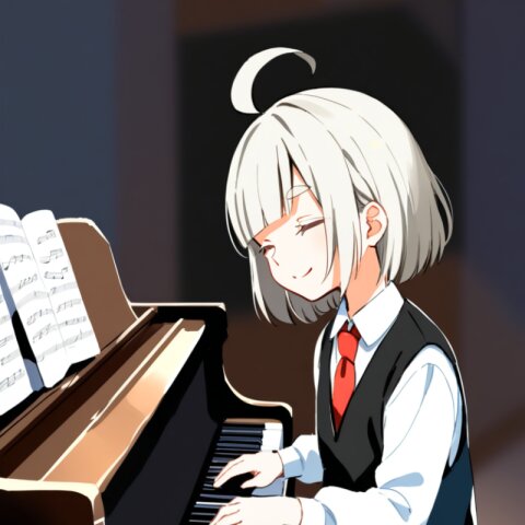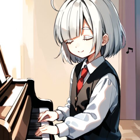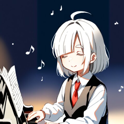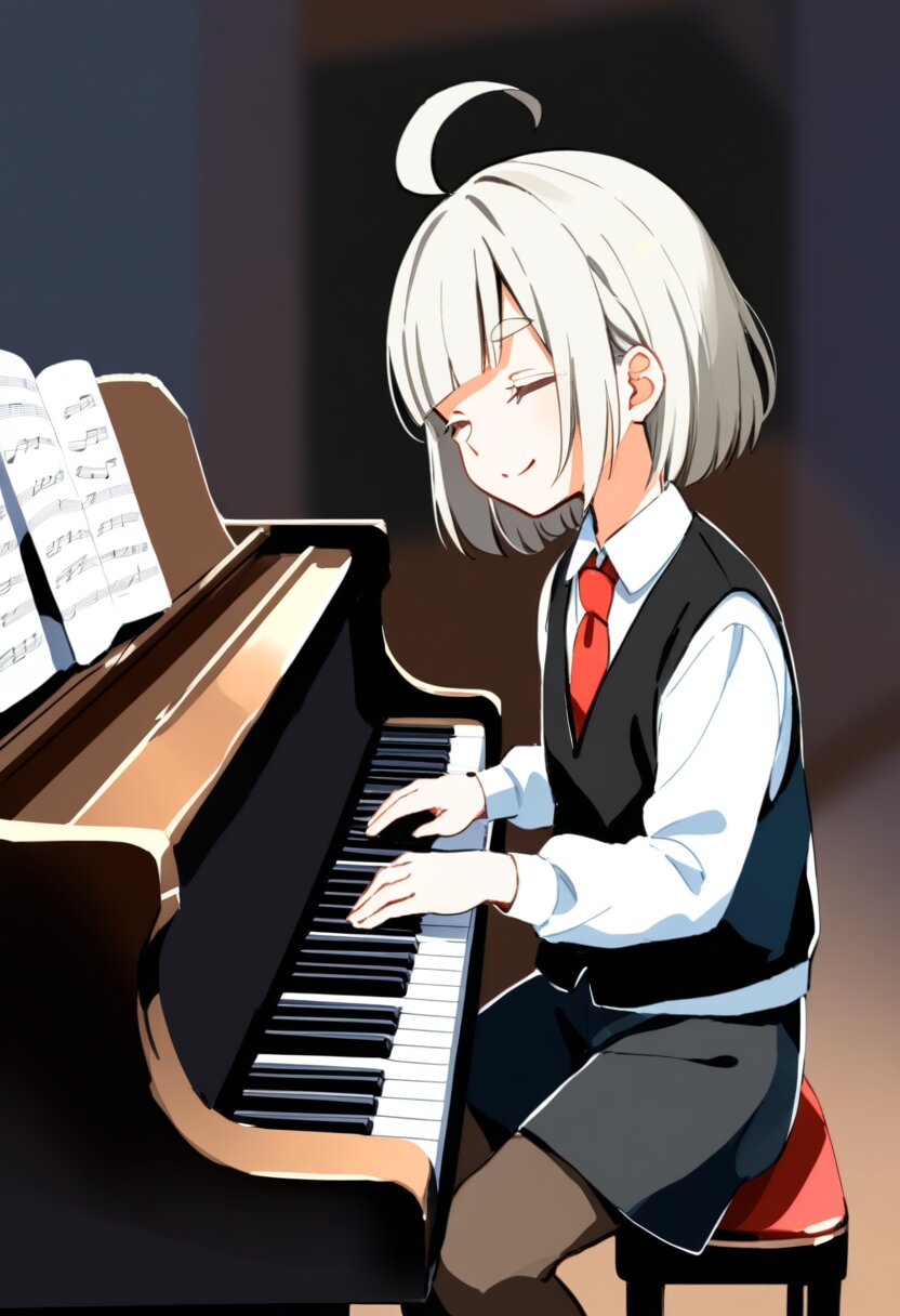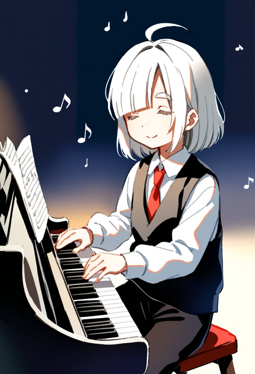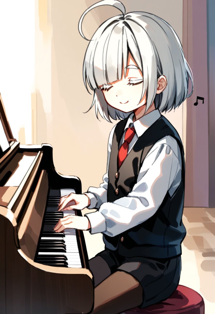 <lora:inmnstylexl:1>, best quality, masterpiece, very aesthetic, watercolor painting, general, 1girl, 10 years old, (bright white hair), short hair, blunt bangs, white thick eyebrow, white colored eyelashes, (hair over one eye), ahoge, black vest, red ribbon tie, longsleeves white shirt, black shorts, brown tights, playing piano, gentle smile, closed eyes, musical notes