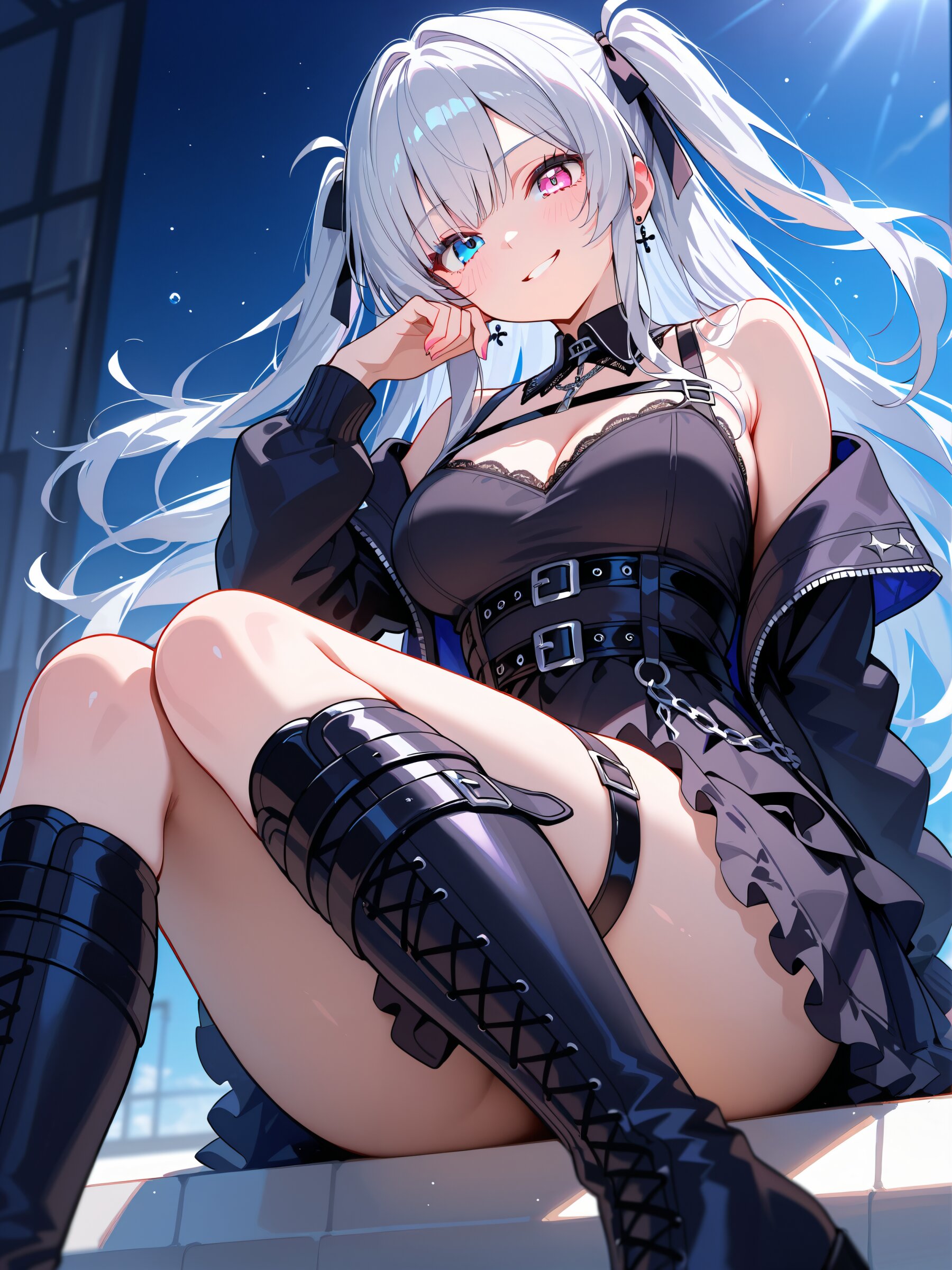 rating explicit, medium large breasts,silver hair,long hair,two side up,pink eyes,blue eyes,heterochromia,, face focus, smirk, goth fashion,off shoulder,frilled skirt,thigh strap,knee boots, sketch,,masterpiece,best quality,ultra detail,intricate detail,absolutely resolution,8k, newest,digital-cel,