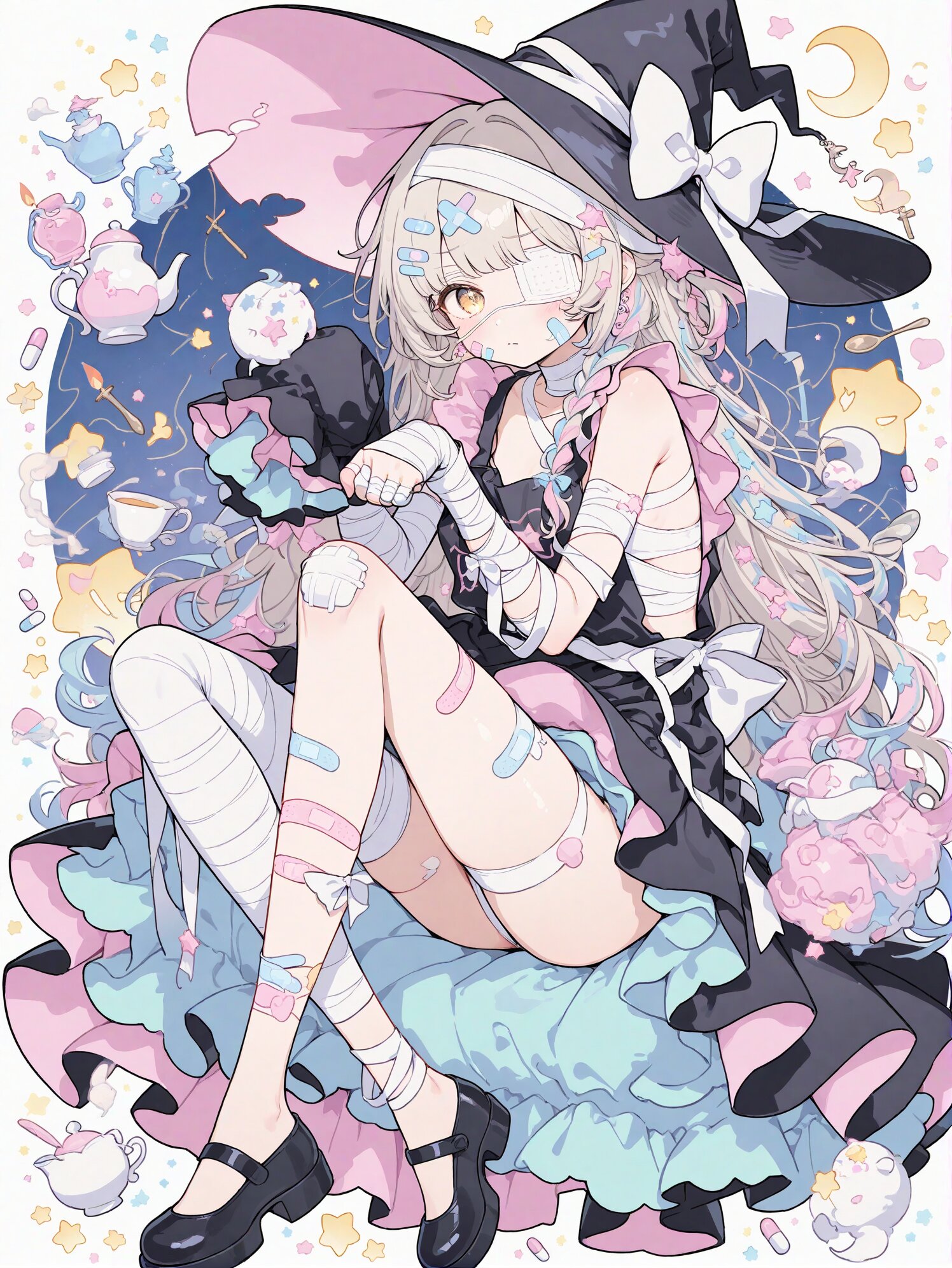 masterpiece,best quality,highres,absurdres,newest,aesthetic,(perfect anatomy),(4fingers and 1thumb on hand,perfect hand), CandyFlatPop,1girl,arm wrap,bandage on face,bandage over one eye,bandaged arm,bandated hand,bandaged head,bandaged leg,bandaged neck,bandages,bandaid,bandaid on arm,bandaid on cheek,bandaid on face,bandaid on hand,bandaid on knee,bandaid on leg,black footwear, bow,braid,candle,cast,closed mouth,crescent,cup, dress,earrings,food,frills,fuits,full body,hat,hat bow,intravenous drip,leg wrap,long hair,long sleeves,looking at viewer,medical eyepatch, mummy,mummy costume,naked bandage,pill,ribbon,sarashi,shoes,single thighhigh,sleeves past fingers,sleeves past wrists,spoon,star \(symbol\),star hair ornament,star print,starry background,striped,teacup,teapot,top hat,white bow,white headwear,witch hat,yellow eyes,