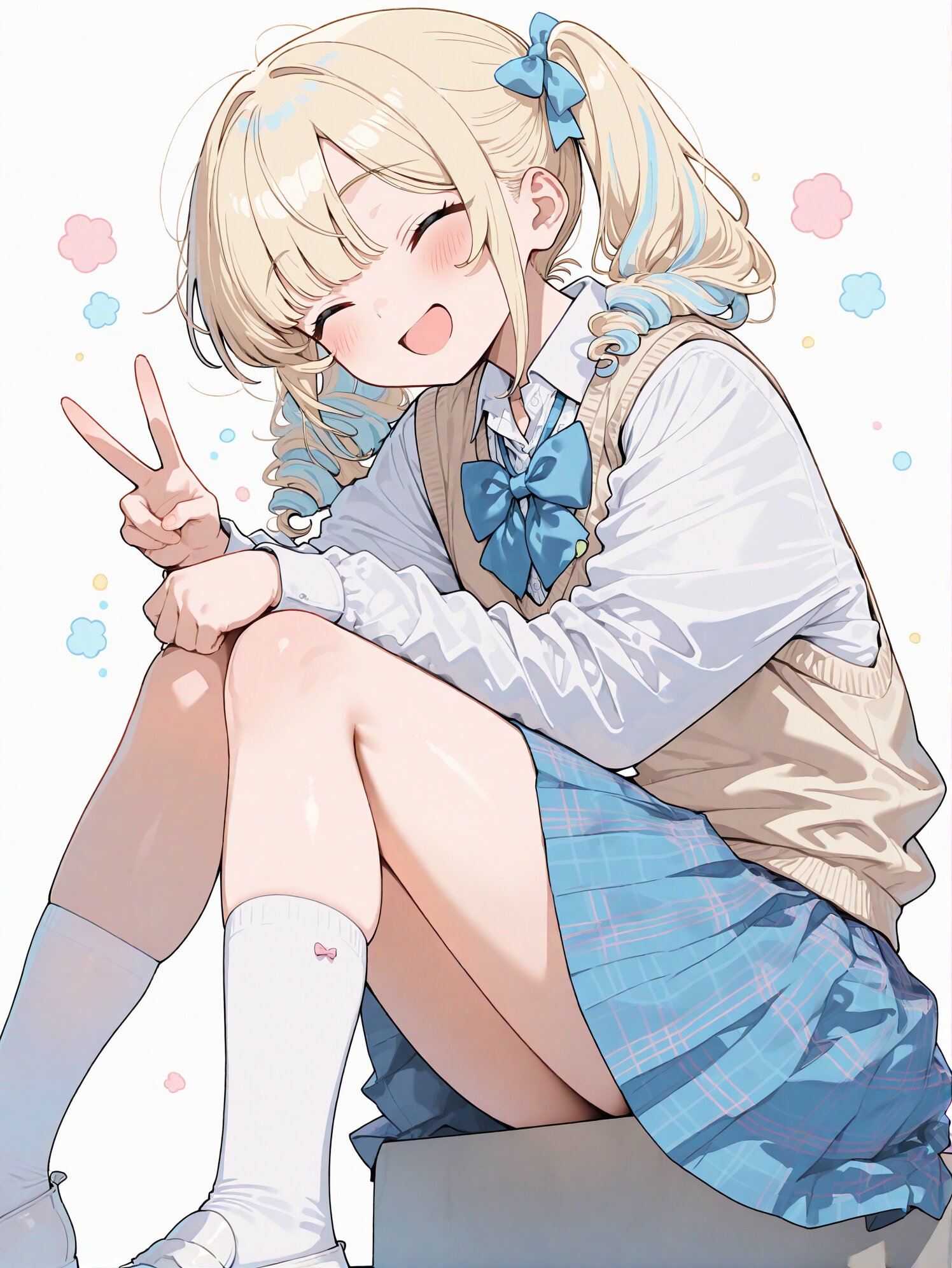 masterpiece,best quality,highres,absurdres,newest,aesthetic,(perfect anatomy),(4fingers and 1thumb on hand), 1girl,solo, skirt, sweater, long hair tied low, blonde hair, original, blue skirt, pleated skirt, long_sleeves, bowtie, open mouth, twindrills, closed mouth, eyebrows visible through hair, white footwear, long hair over shoulder, bangs, white shirt, bowtie, shirt, collared shirt, v, long hair, twintails, bow, long sleeves, closed eyes, blush, sfw, plaid, solo, blue bow, sitting, school uniform, smile, plaid skirt,