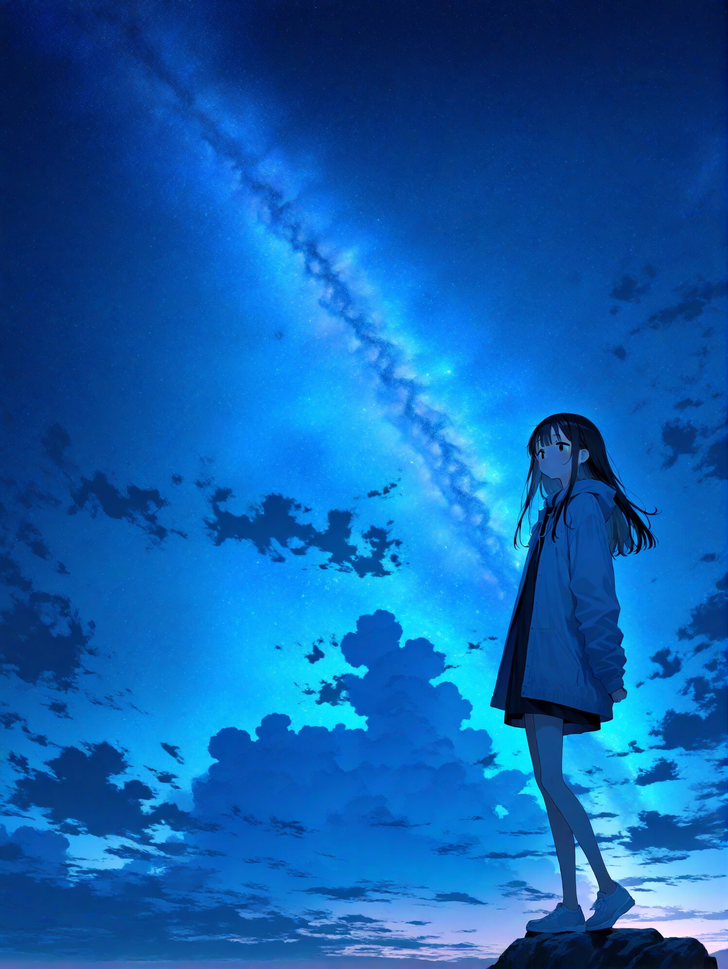 masterpiece,best quality,highres,absurdres,newest,aesthetic,(perfect anatomy), SilhouetteSerenity,1girl,kawaii,solo,long hair,black hair,black eyes,long sleeves,Stand on one foot with your arms extended horizontally,Standing on a rock, sfw,starry background,hooded jacket,hood down,night sky,original,outdoors,clouds,starry sky,night,blue theme,from front,