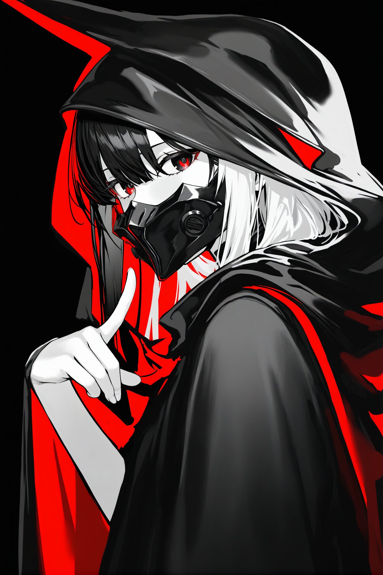 masterpiece,best quality,highres,absurdres,newest,aesthetic,(perfect anatomy),(4fingers and 1thumb on hand), sfw,solo,mask,red background,black hair,white hair,red eyes,black eyes,hood,hooded cloak,1boy,cloak,upper body,black cloak,red theme,male focus,black_hair_with_white_tips,white skin,looking at viewer,monochrome,original,finger to mouth,white skin,long hair,looking to the side,simple background,hand up,black background,white hair with black tips,