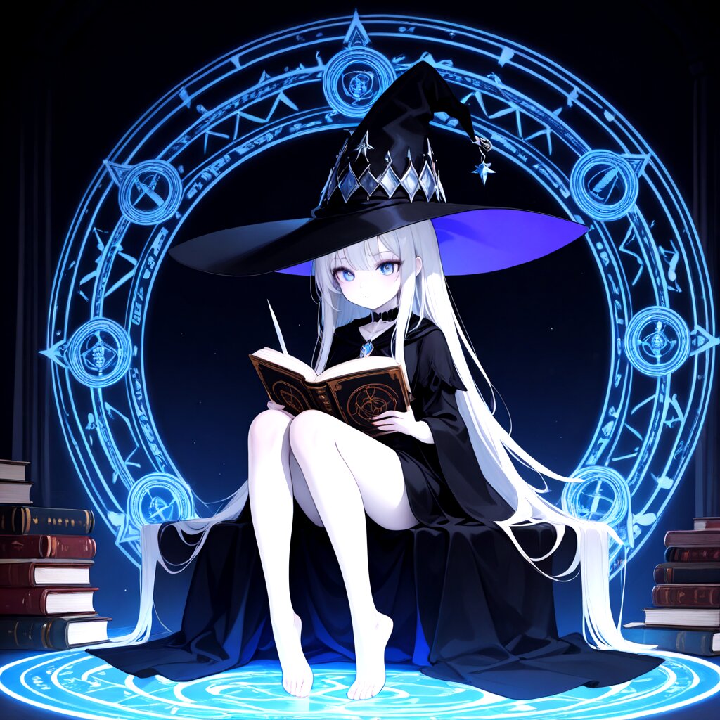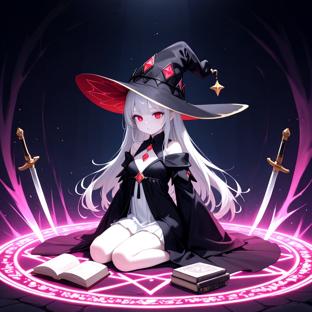 (best quality, high resolution:1.2), (solo:1.2), (pale skin:0.8), Sitting in the middle of the magic circle, dark room, silver hair, witch, read books, witch hat, magic decorated knife