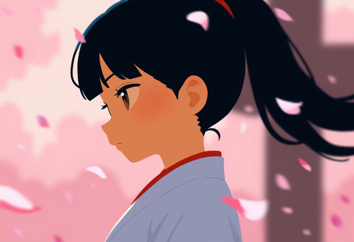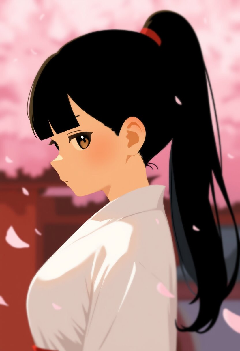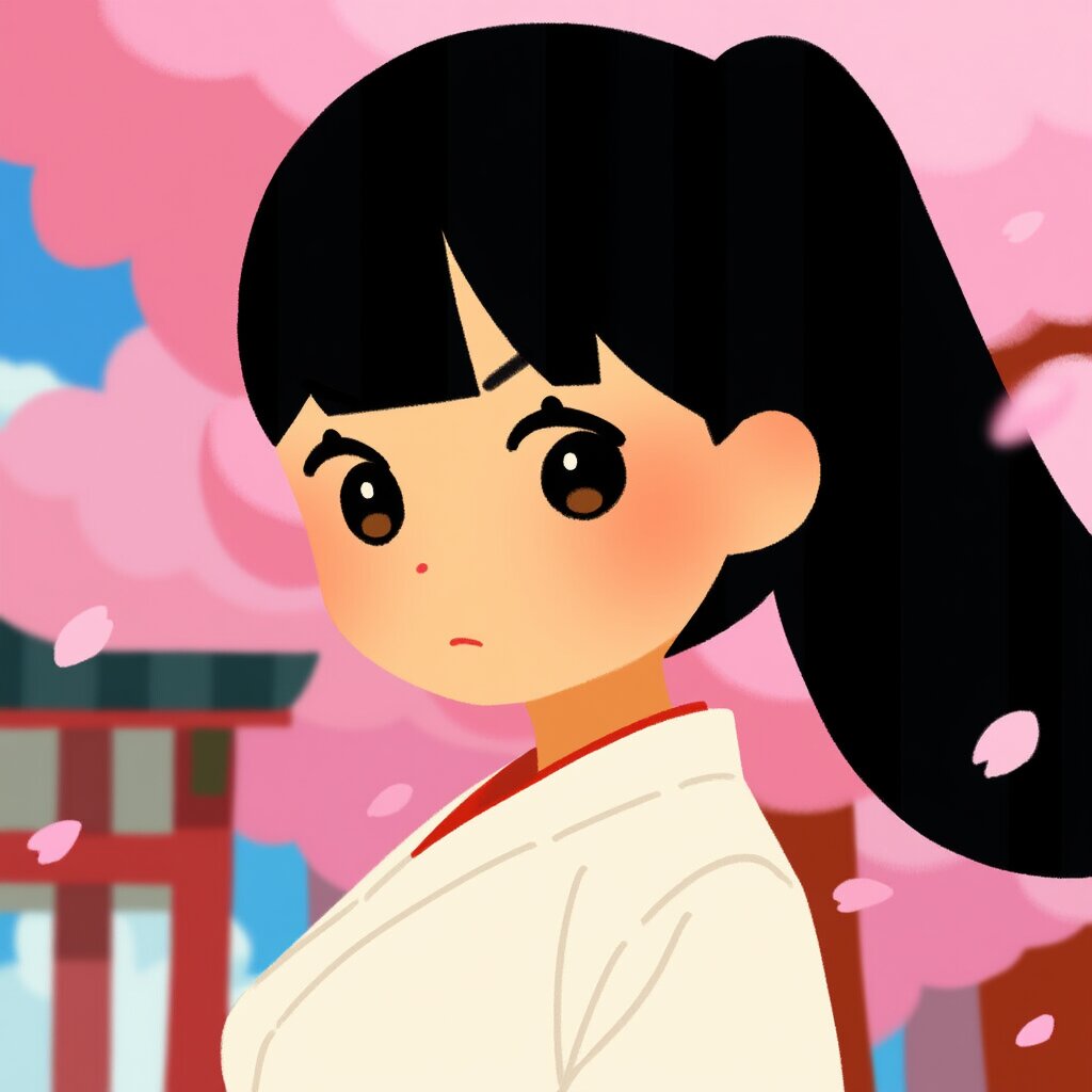 {{{masterpiece}}}, {{{best quality}}}, {{ultra-detailed}}, {illustration}, {{an extremely delicate and beautiful}}, {{{{{irasutoya}}}}}, {{{{chibi, child}}}}, {{flat collar}}, 1girl, solo, {{serious}}, black hair, brown eyes, straight hair, long hair, blunt bangs, high ponytail, medium breasts, close mouth, miko, cherry blossoms, shrines, flurry of falling cherry blossoms, floating hair, wind, from side, close to viewer, upper body, solo focus