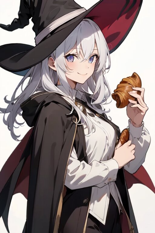1 lady, smile (holding croissant), cowboy shot, black cape, white shirt, (witch),, elaina, solo,Art Style 2.0