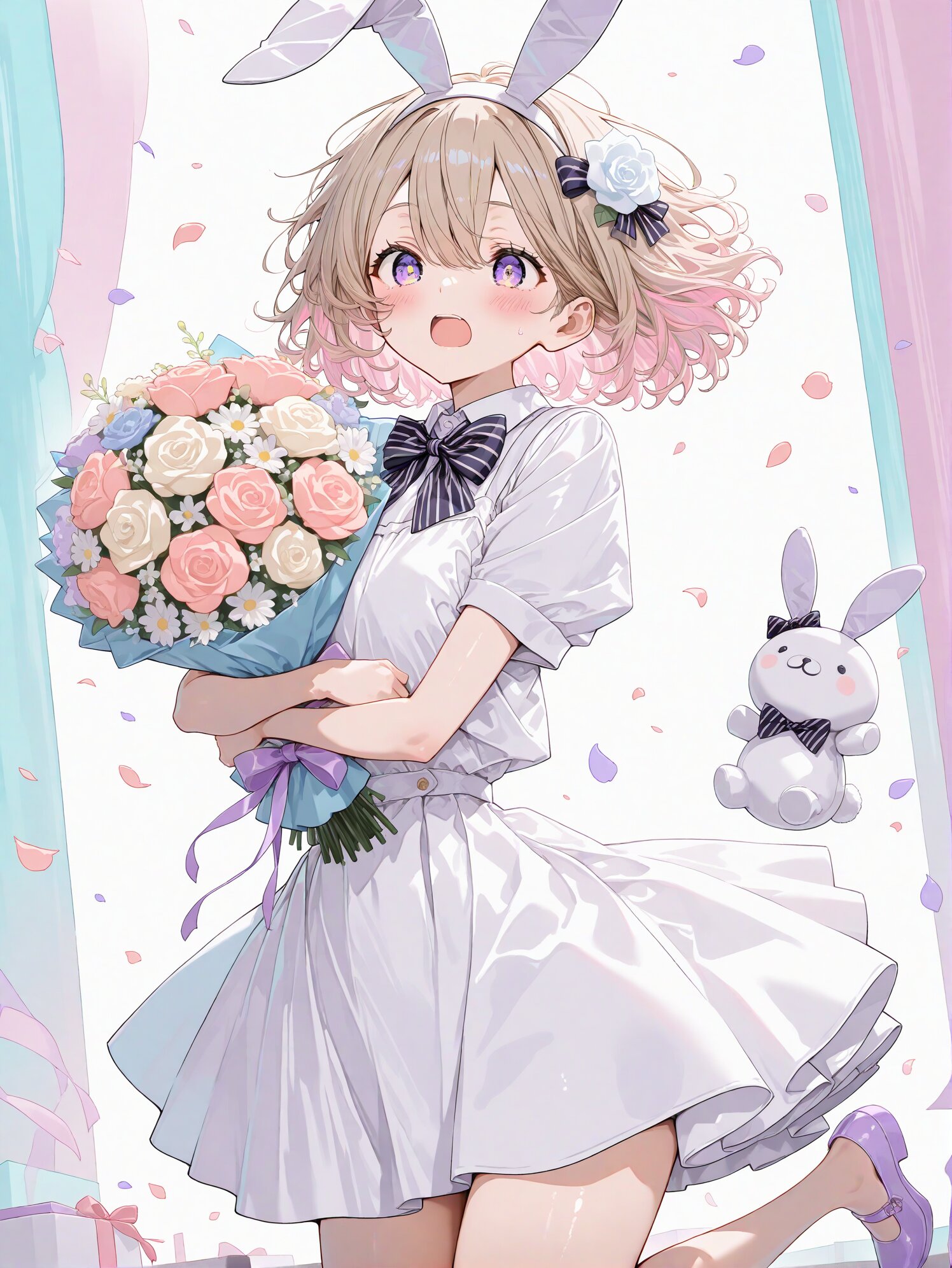 masterpiece,best quality,highres,absurdres,newest,aesthetic, CandyFlatPop,1girl,solo,hair between eyes,short hair,light brown hair,shiny hair,hair flower,fake rabbit ears,white hairband,purple eyes,blush,open mouth,white dress,short sleeves,ribbon,striped bow,holding,bouquet,stuffed animal,shoes,petals,gift box,floating hair,cowboy shot,Do not display anything except 'Thank you,'