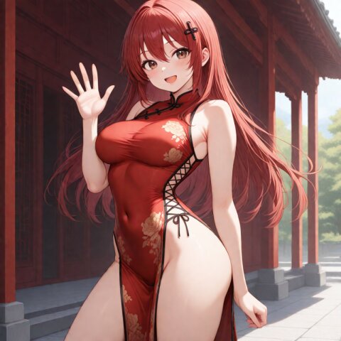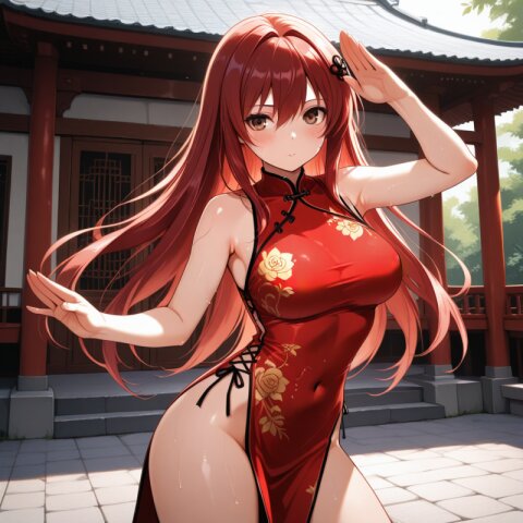 masterpiece,best quality,amazing quality,very aesthetic,absurdres,newest,okashirastyle,highres, 1girl,long_hair,brown_hair,red_eyes,hair_between_eyes,very_long_hair,brown_eyes,red_hair,floating_hair,hair_intakes,straight_hair,shiny_skin, police_officer_uniform, selfie, v-sign, peace sign, intersection, dj police