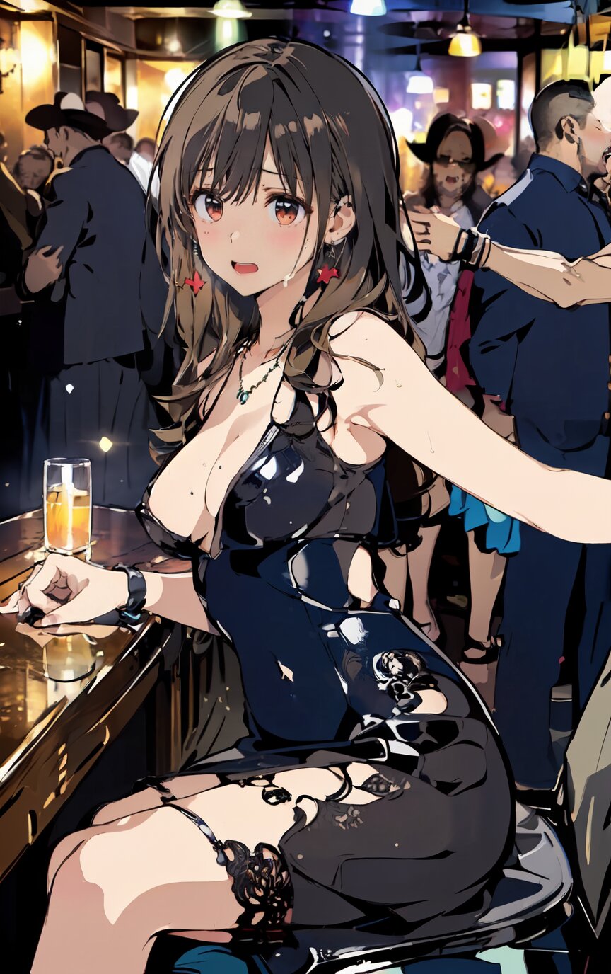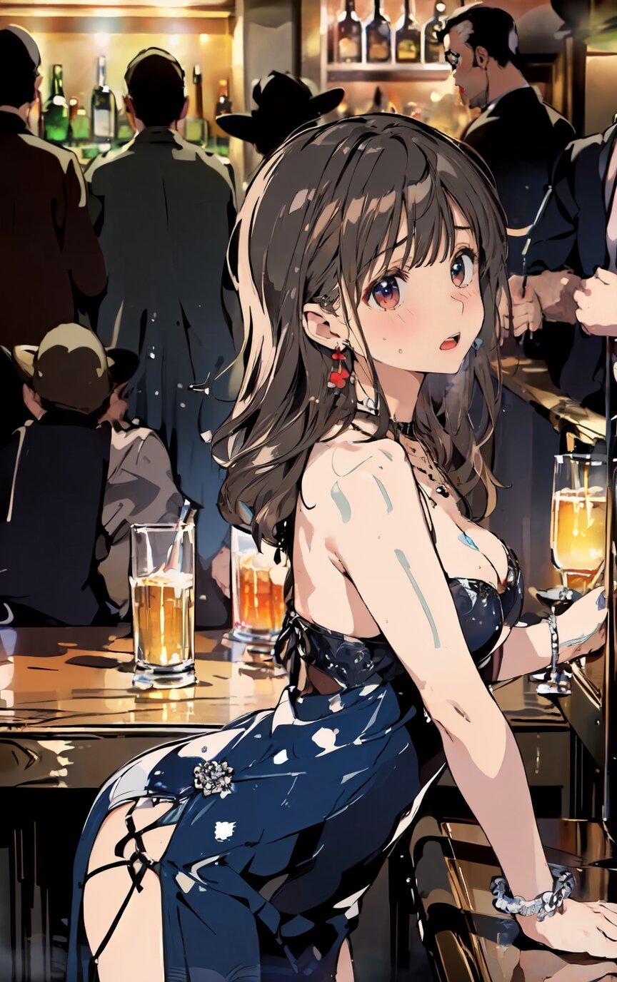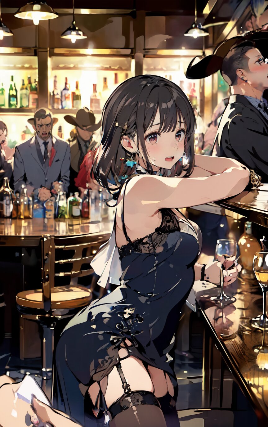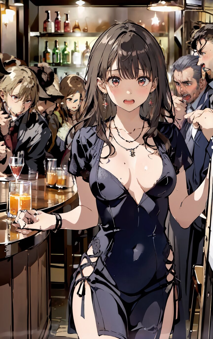 nsfw, (nude: 1.4), (8k, best quality, masterpiece:1.4), (realistic, photo-realistic:1.6), ultra-detailed, (sexy pose, random angle: 1.6), (1girl surrounded by men: 1.8), (1girl and men having sex, man fucking 1girl from behind, men rape 1girl: 1.8), doggystyle, 18 years old, straight long hair, (necklace, earrings: 1.2), (cowboy shot: 1.4), huge breast, perfect body, highly detailed, shiny skin, shiny hair, looking away, (party dress: 1.6), (inside of bar: 1.4), <lora:ymitsuki_v01:1>