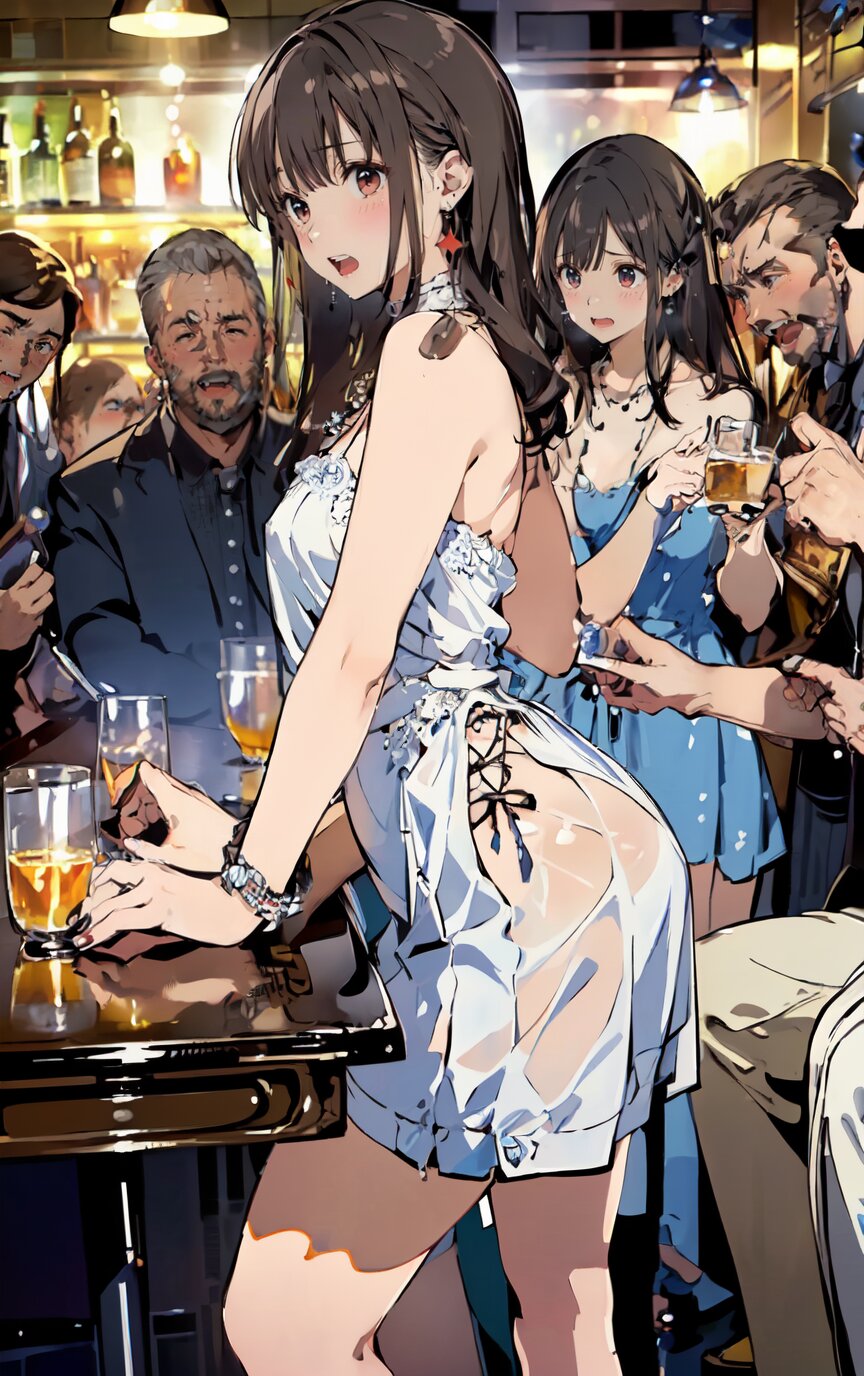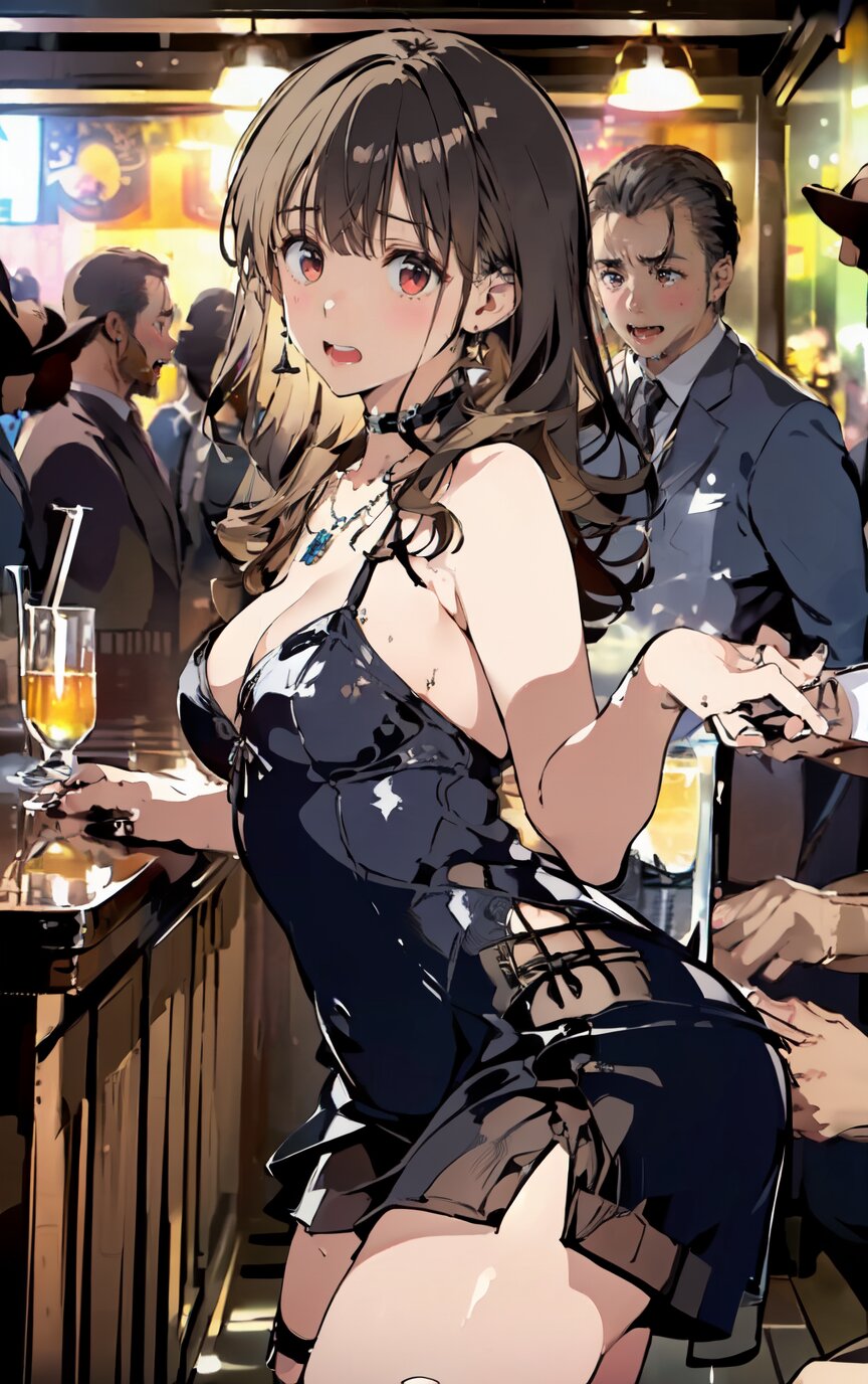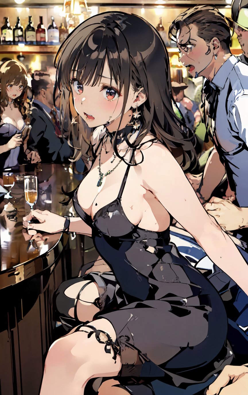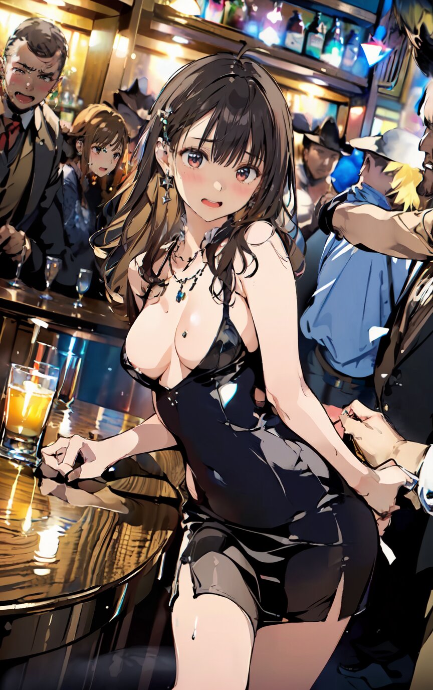 (8k, best quality, masterpiece:1.4), (realistic, photo-realistic:1.6), ultra-detailed, (sexy pose, random angle: 1.6), (1girl surrounded by men: 1.8), 18 years old, straight long hair, (necklace, earrings: 1.2), (cowboy shot: 1.4), huge breast, perfect body, highly detailed, shiny skin, shiny hair, looking away, sitting on chair, (party dress: 1.6), (inside of bar: 1.4),<lora:ymitsuki_v01:1>