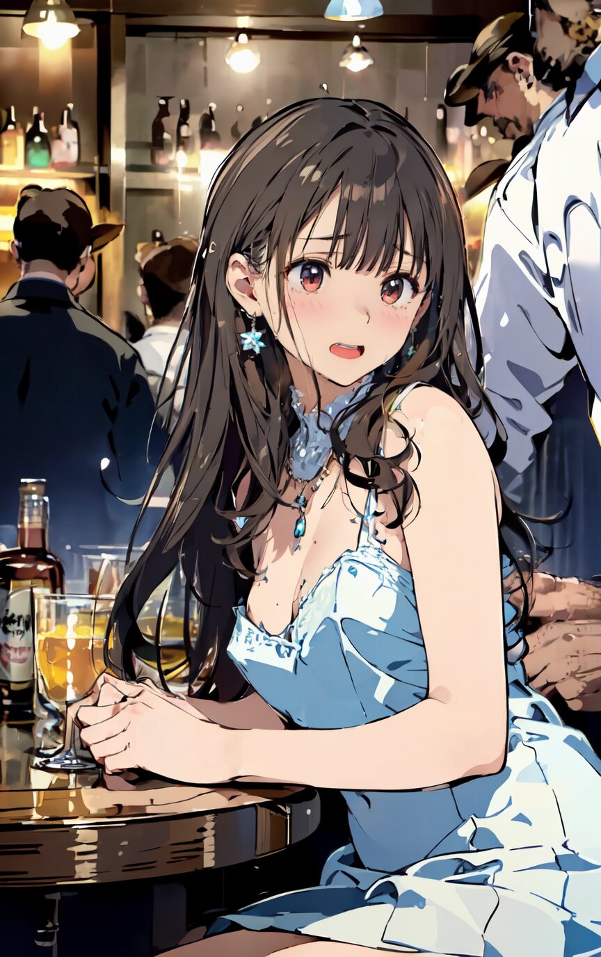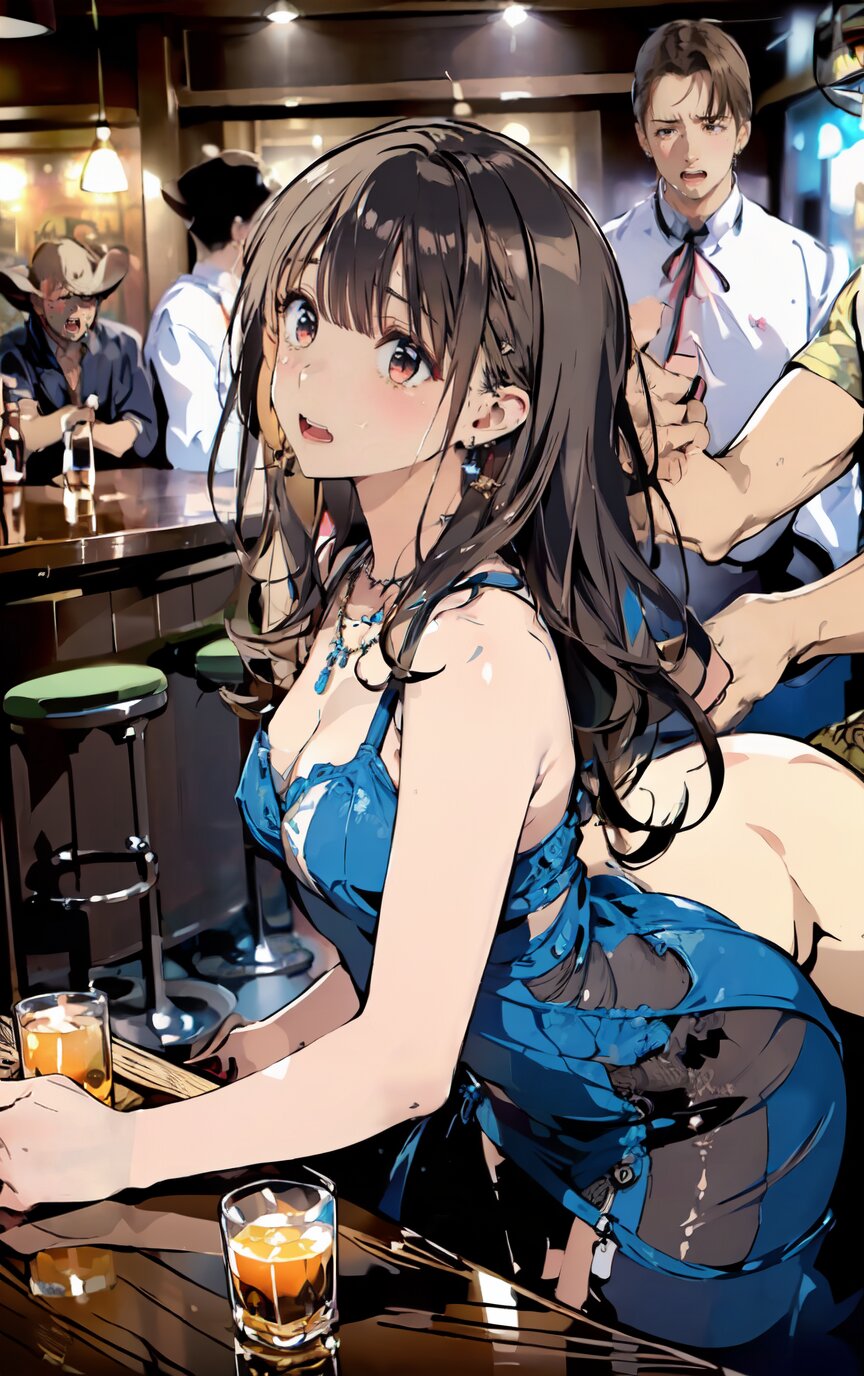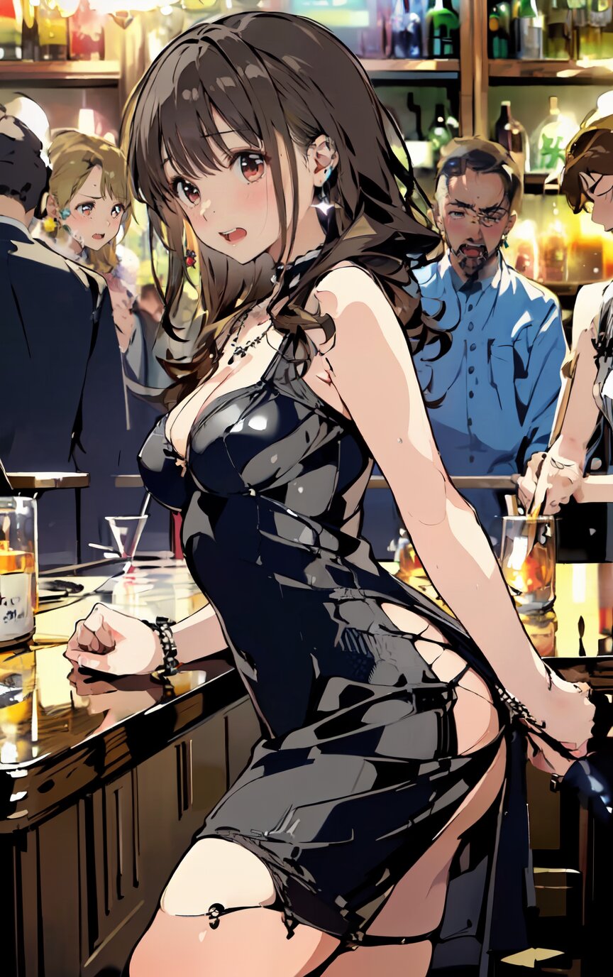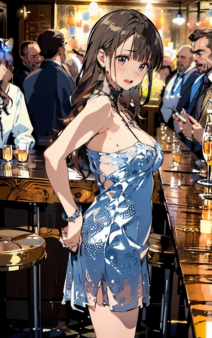 (8k, best quality, masterpiece:1.4), (realistic, photo-realistic:1.6), ultra-detailed, (sexy pose, random angle: 1.6), (1girl surrounded by men: 1.8), 18 years old, straight long hair, (necklace, earrings: 1.2), (cowboy shot: 1.4), huge breast, perfect body, highly detailed, shiny skin, shiny hair, looking away, sitting on chair, (party dress: 1.6), (inside of bar: 1.4),<lora:ymitsuki_v01:1>