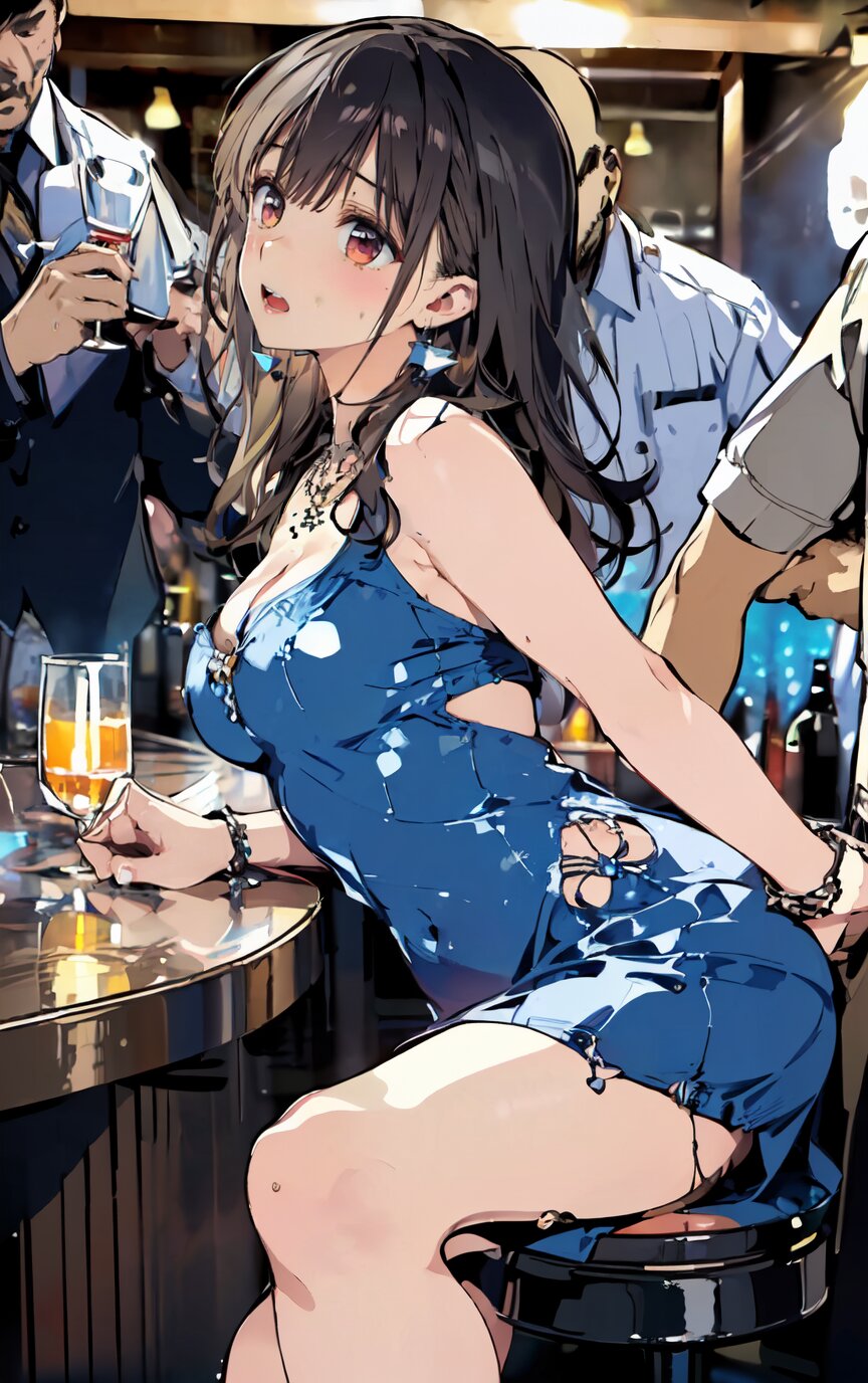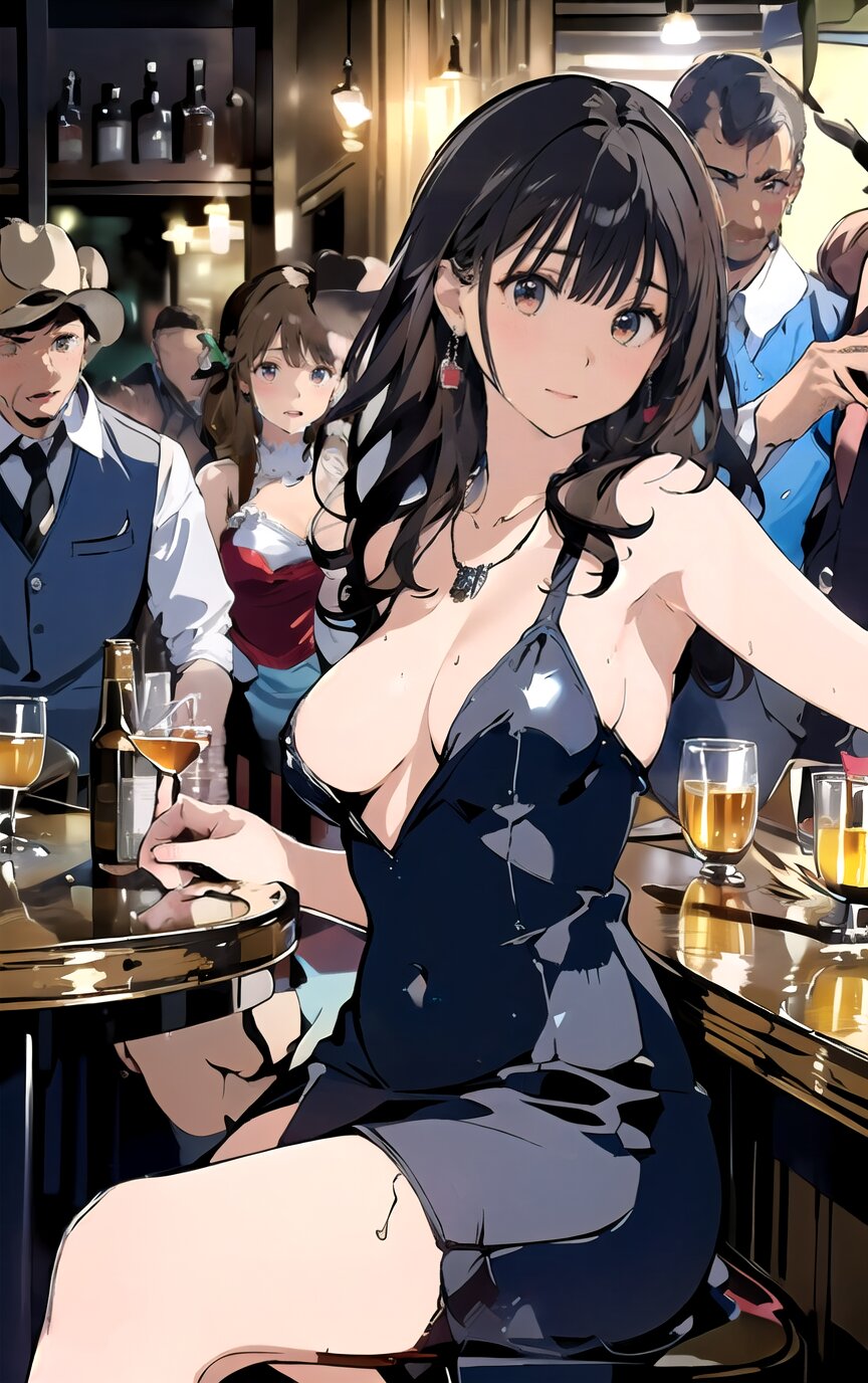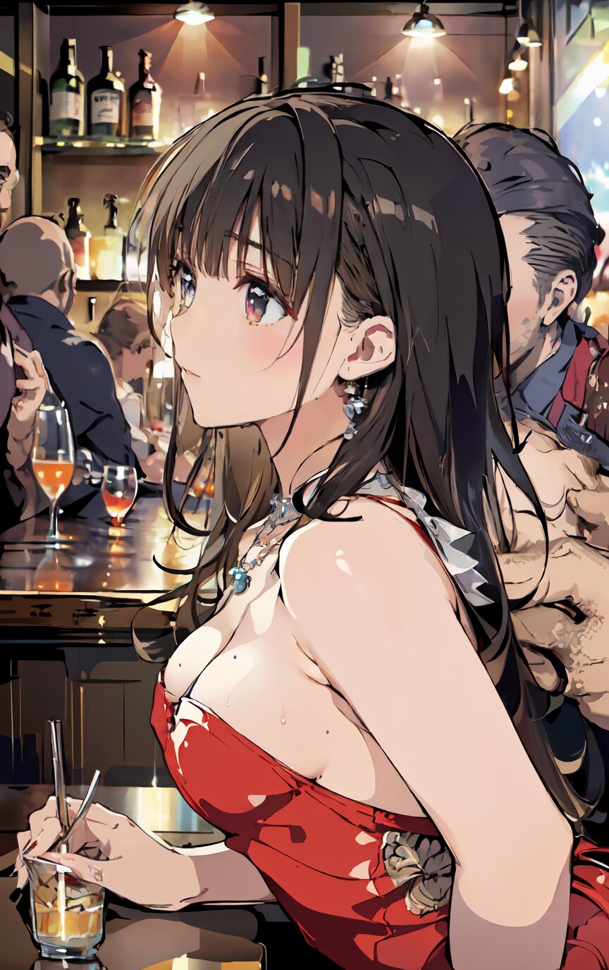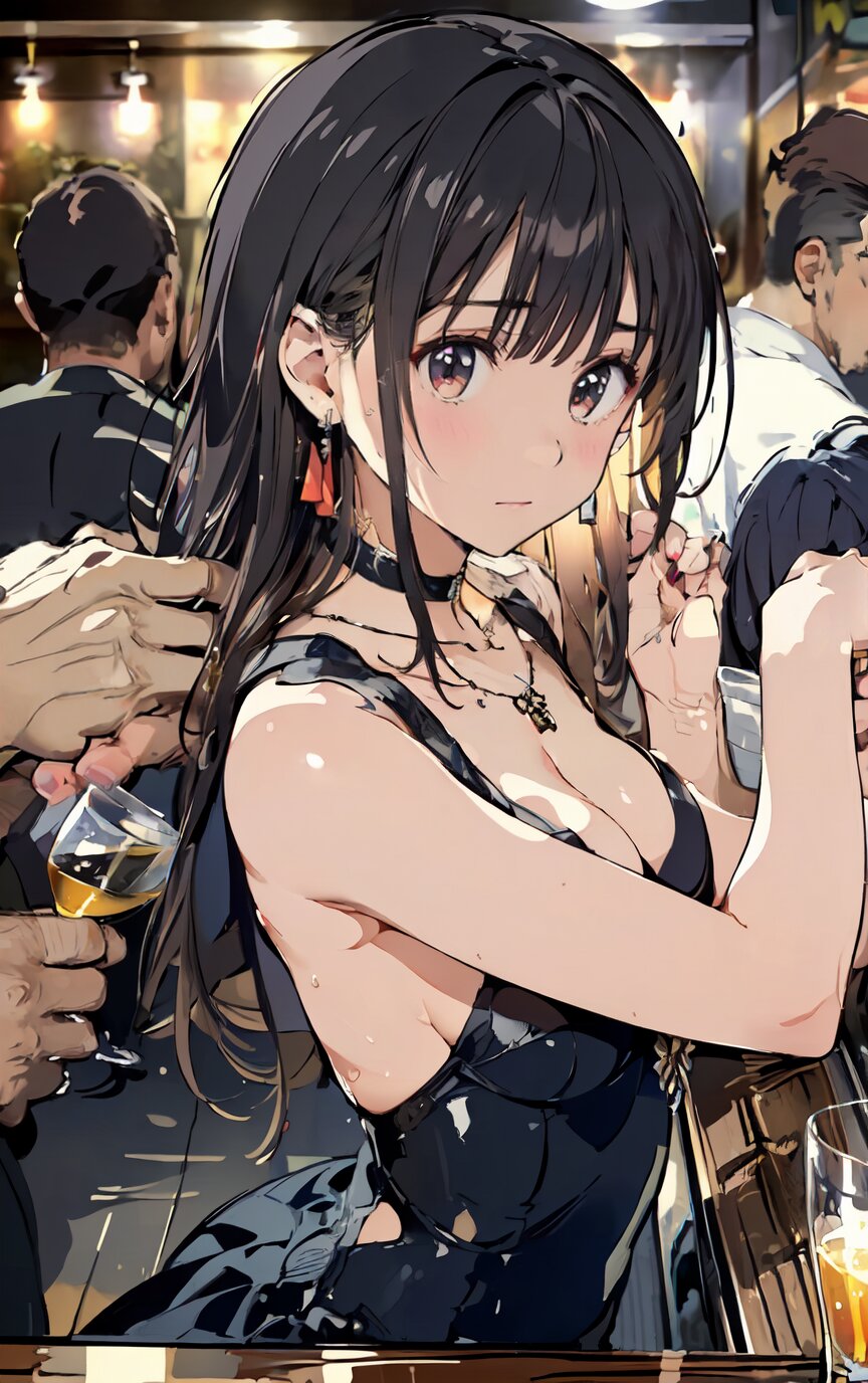 (8k, best quality, masterpiece:1.4), (realistic, photo-realistic:1.6), ultra-detailed, (sexy pose, random angle: 1.6), (1girl surrounded by men: 1.8), 18 years old, straight long hair, (necklace, earrings: 1.2), (upper body: 1.4), huge breast, perfect body, highly detailed, shiny skin, shiny hair, looking away, sitting on chair, (party dress: 1.6), (inside of bar: 1.4),<lora:ymitsuki_v01:1>