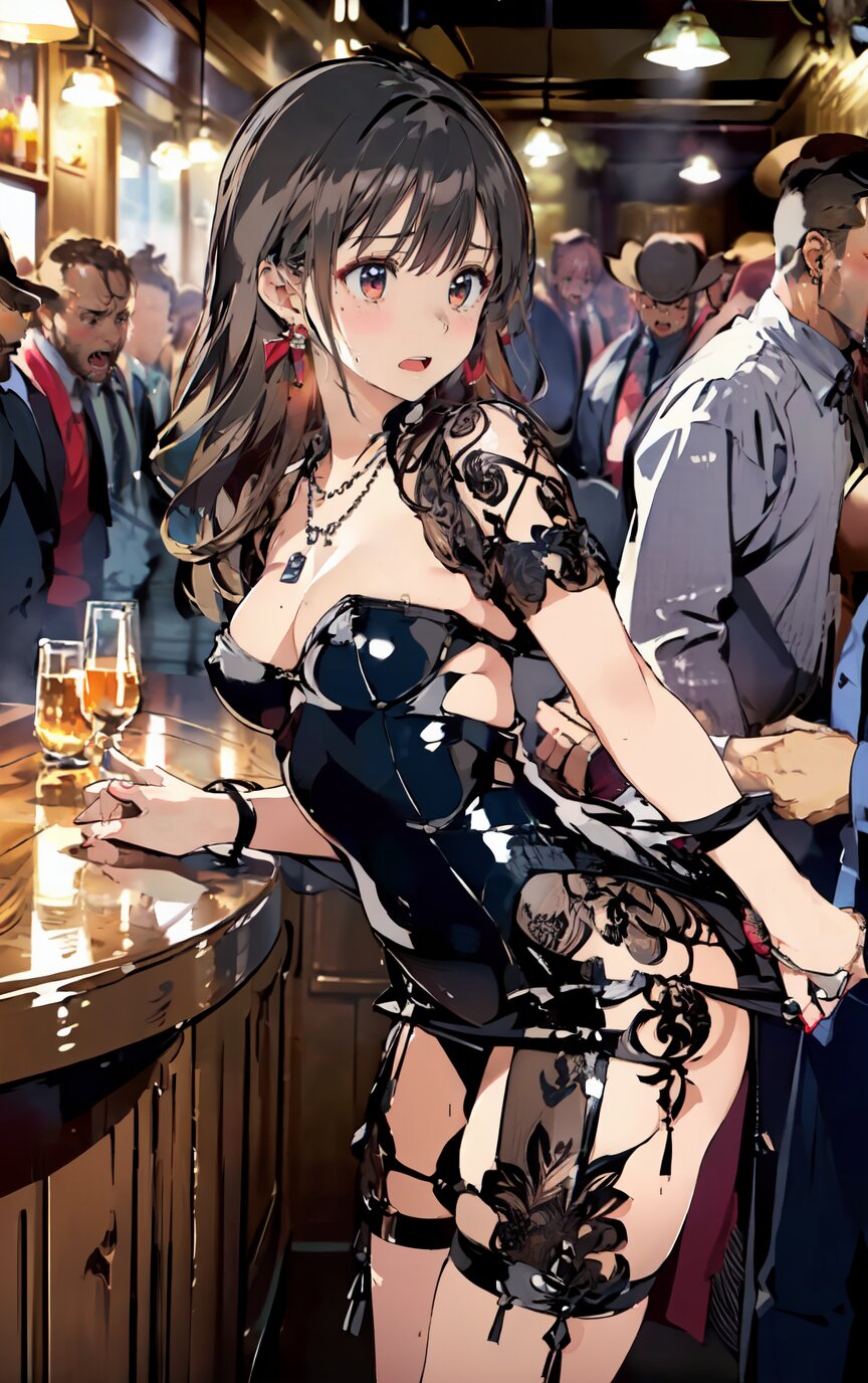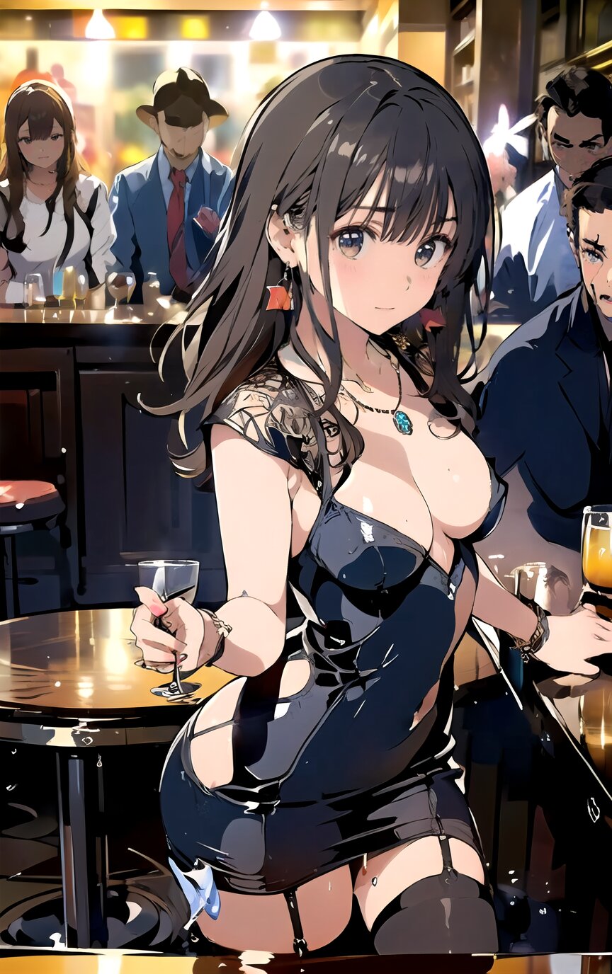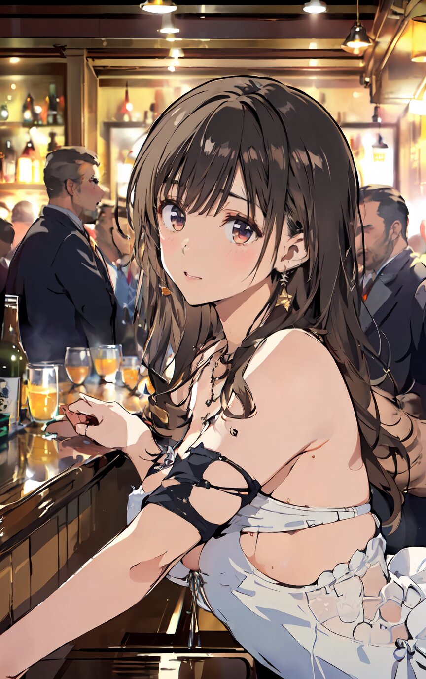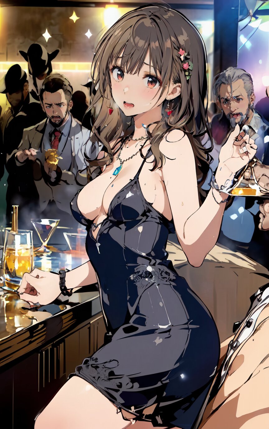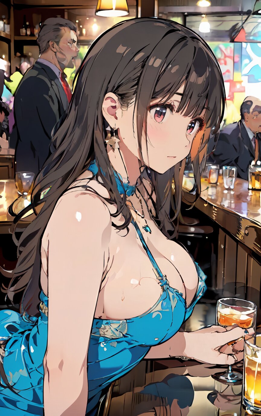 (8k, best quality, masterpiece:1.4), (realistic, photo-realistic:1.6), ultra-detailed, (sexy pose, random angle: 1.6), (1girl surrounded by men: 1.8), 18 years old, straight long hair, (necklace, earrings: 1.2), (upper body: 1.4), huge breast, perfect body, highly detailed, shiny skin, shiny hair, looking away, sitting on chair, (party dress: 1.6), (inside of bar: 1.4),<lora:ymitsuki_v01:1>