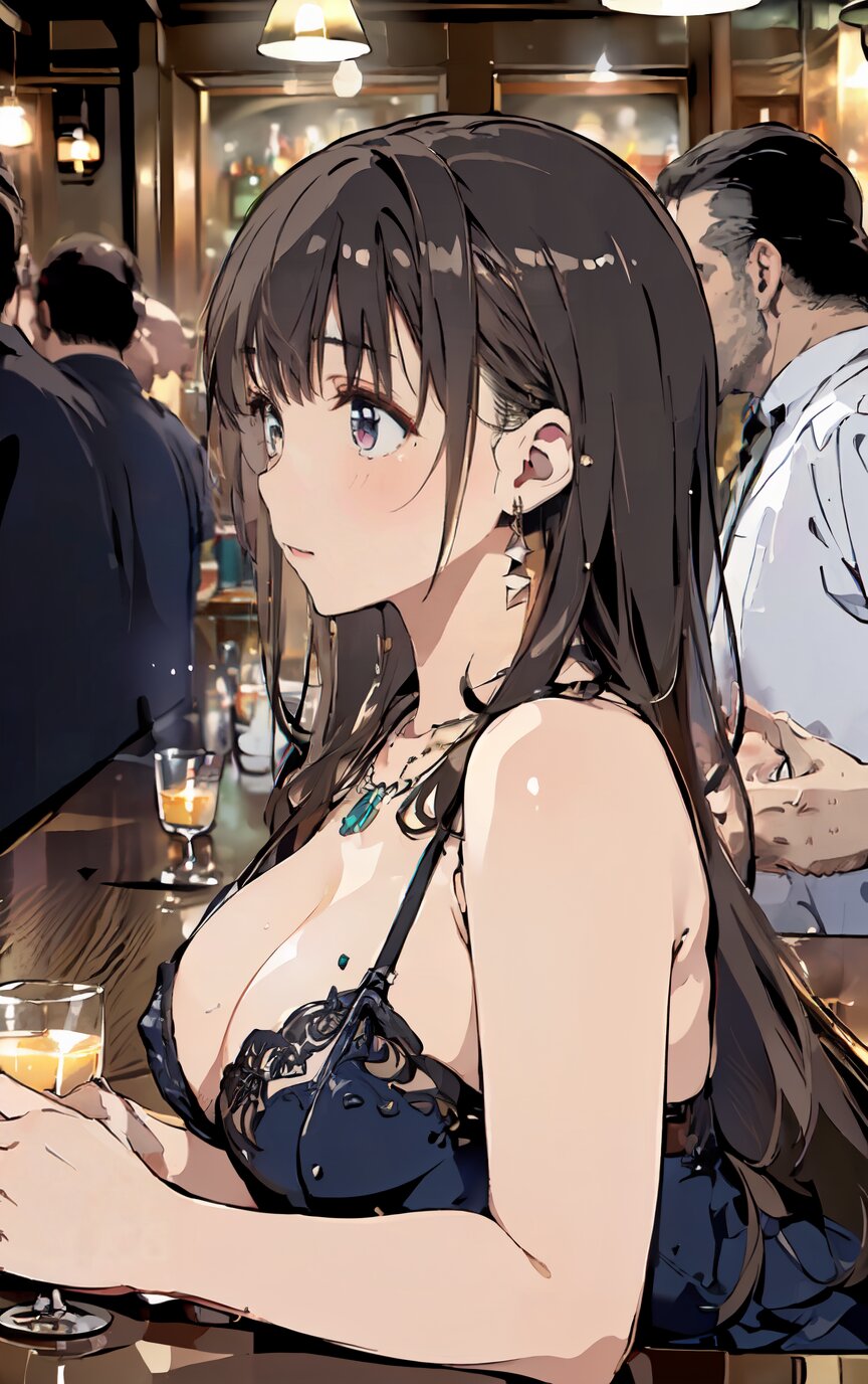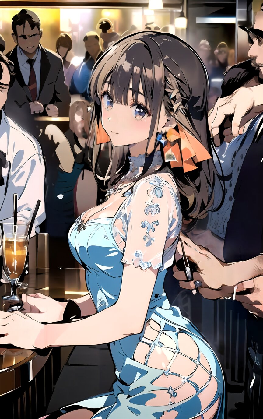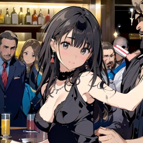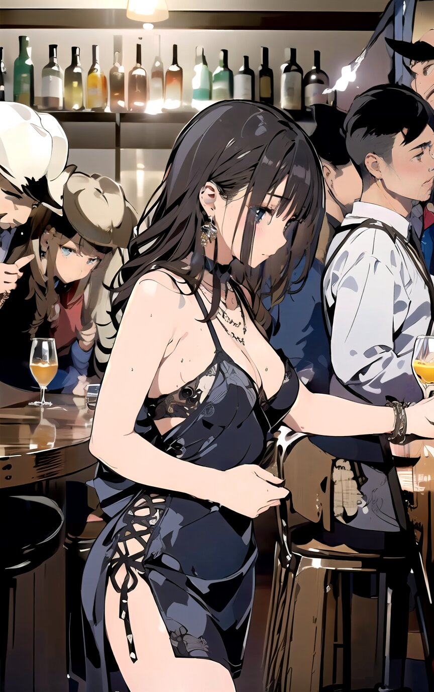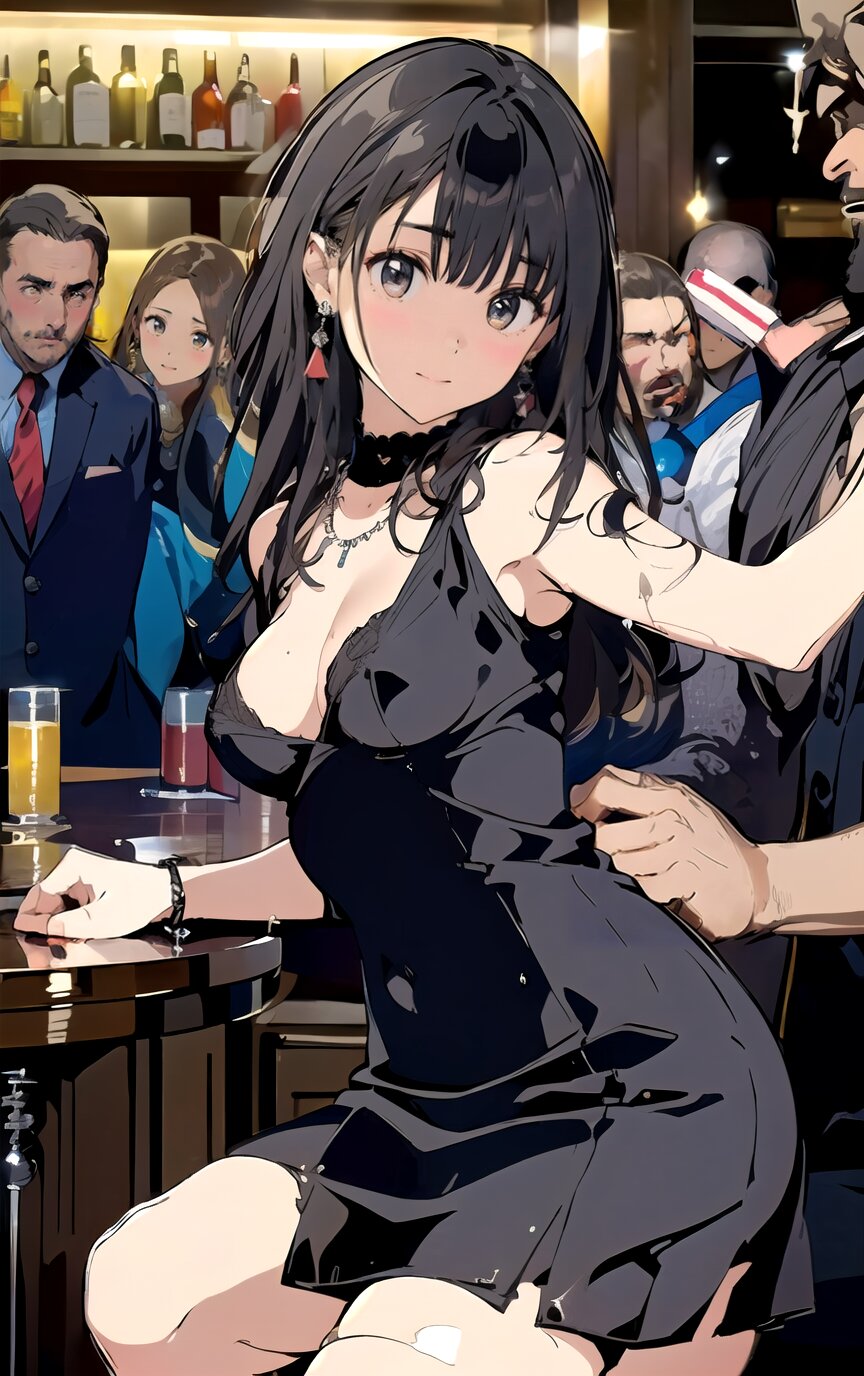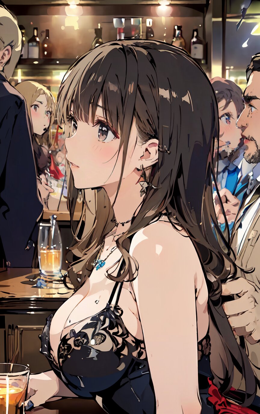 (8k, best quality, masterpiece:1.4), (realistic, photo-realistic:1.6), ultra-detailed, (sexy pose, random angle: 1.6), (1girl surrounded by men: 1.8), 18 years old, straight long hair, (necklace, earrings: 1.2), (upper body: 1.4), huge breast, perfect body, highly detailed, shiny skin, shiny hair, looking away, sitting on chair, (party dress: 1.6), (inside of bar: 1.4),<lora:ymitsuki_v01:1>
