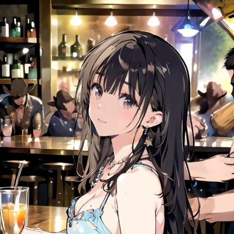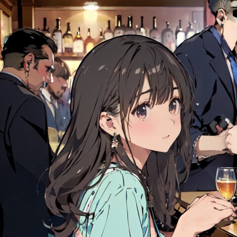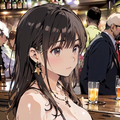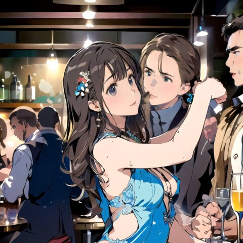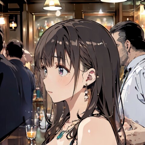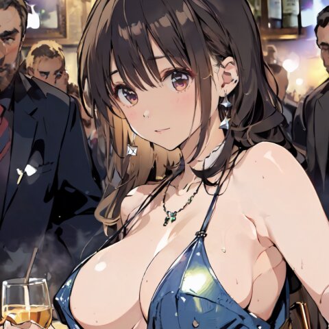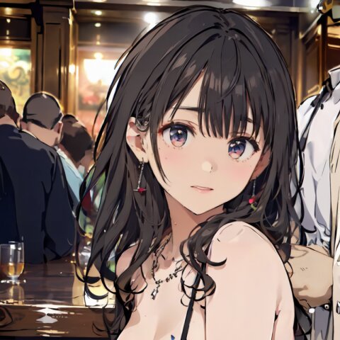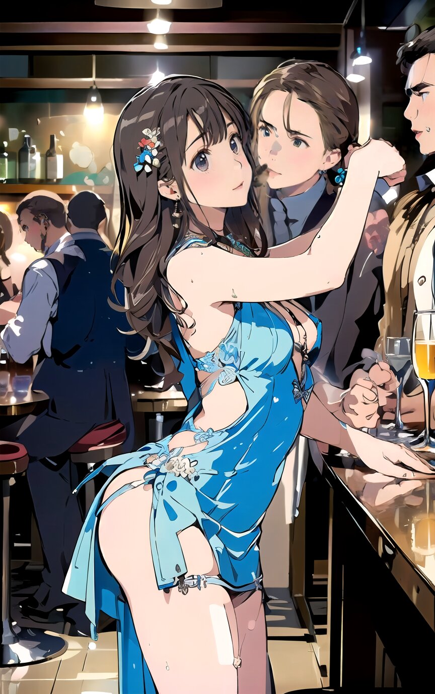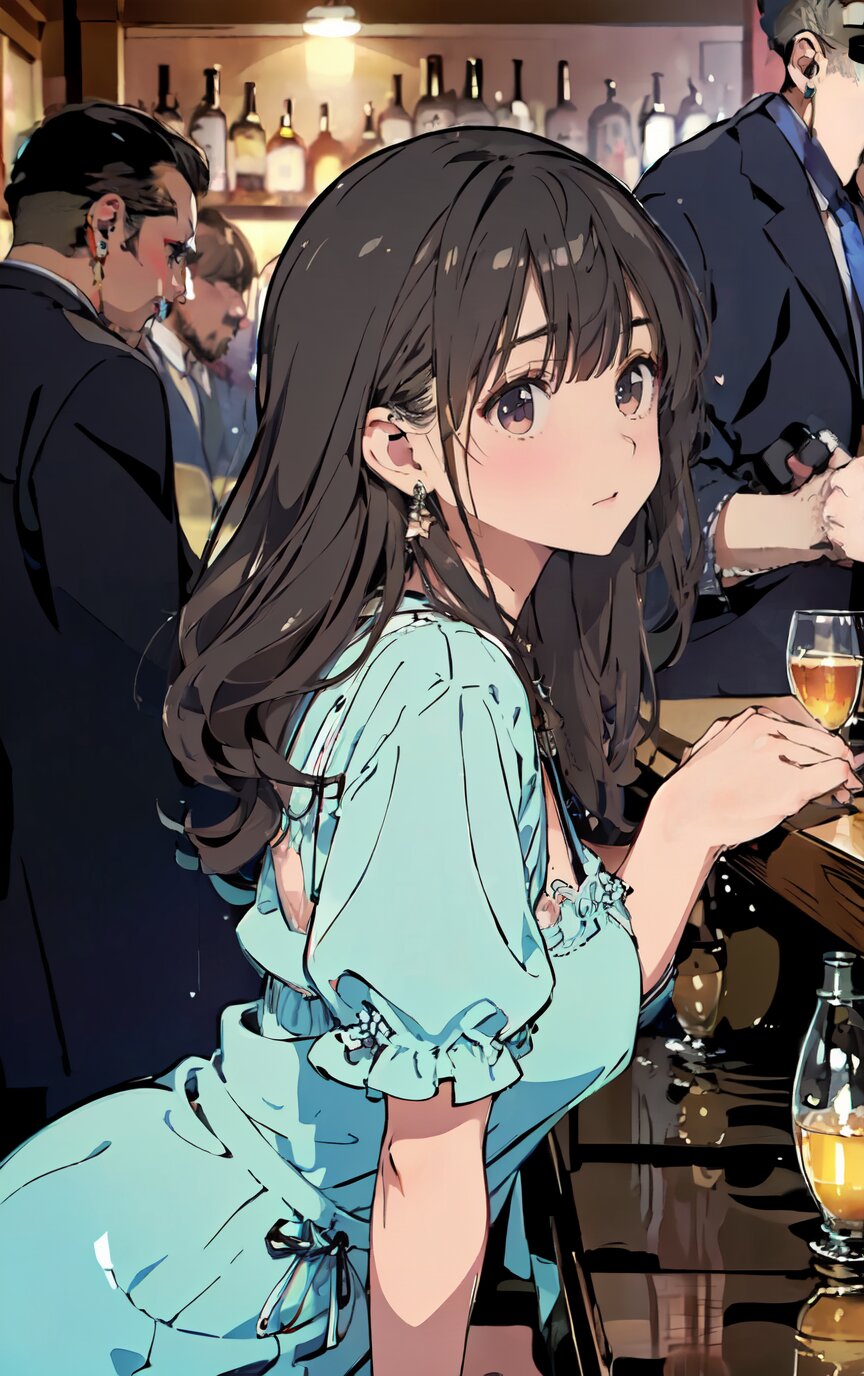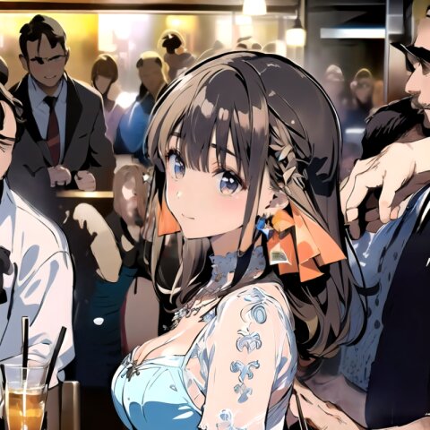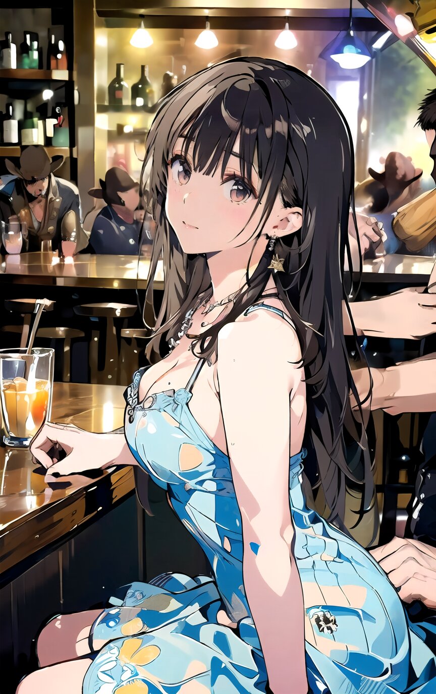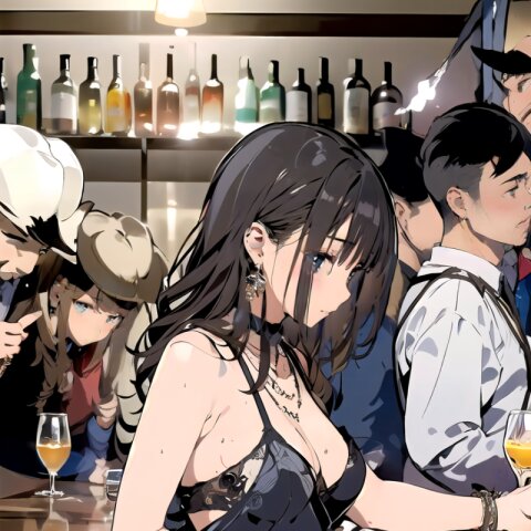 (8k, best quality, masterpiece:1.4), (realistic, photo-realistic:1.6), ultra-detailed, (sexy pose, random angle: 1.6), (1girl surrounded by men: 1.8), 18 years old, straight long hair, (necklace, earrings: 1.2), (upper body: 1.4), huge breast, perfect body, highly detailed, shiny skin, shiny hair, looking away, sitting on chair, (party dress: 1.6), (inside of bar: 1.4),<lora:ymitsuki_v01:1>
