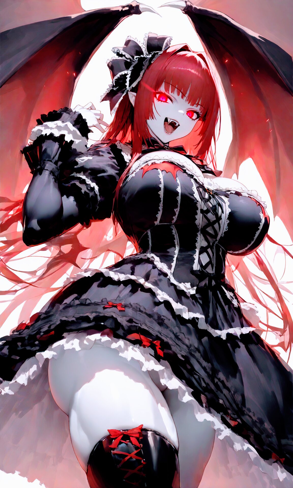 1girl, (((gothic lolita))), ((((lolita fashion)))), (((red hair))), red eyes, ((glowing eyes)), vampire, succubus, (pointed ear), (((non-human skin))), (((white skin))), large breasts, demon wings, wings on back, (large wings), ((bat wings)), headdress, fangs, muscular, curvy