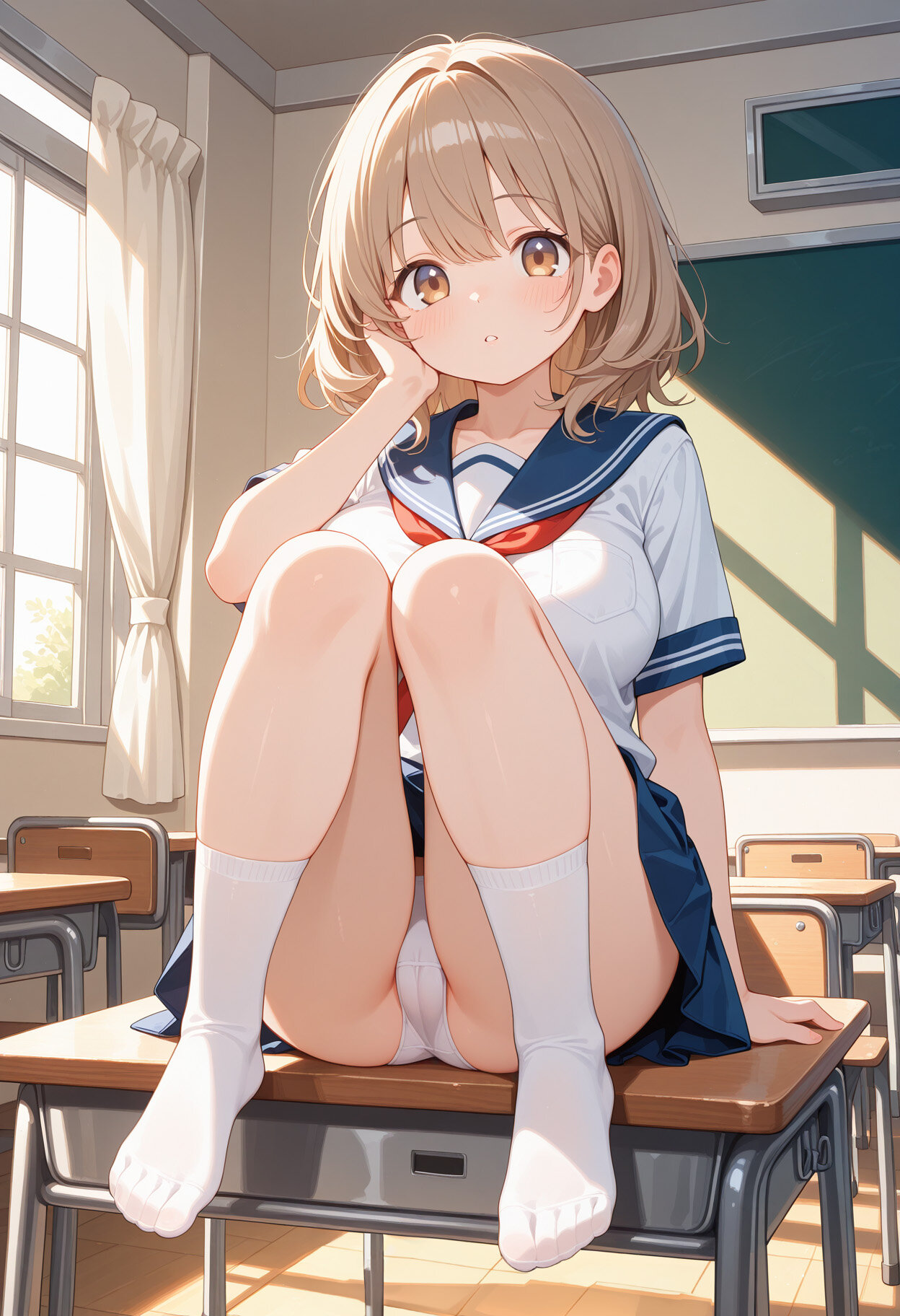 1girl, light_brown_hair, flipped_hair, medium_hair, hairpin, hazel_eyes, tareme, , parted_lips, serahuku, white_panties, white_socks, right_hand_on_cheek, sitting_on_desk, (cameltoe:0.8), large_breasts, classroom, high-key_lighting