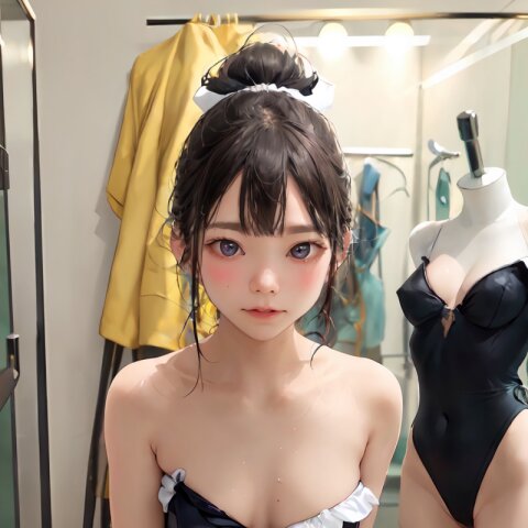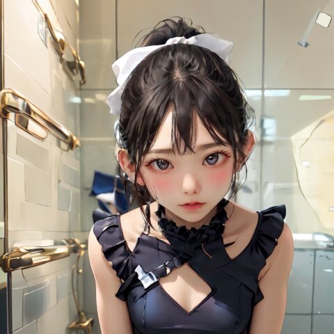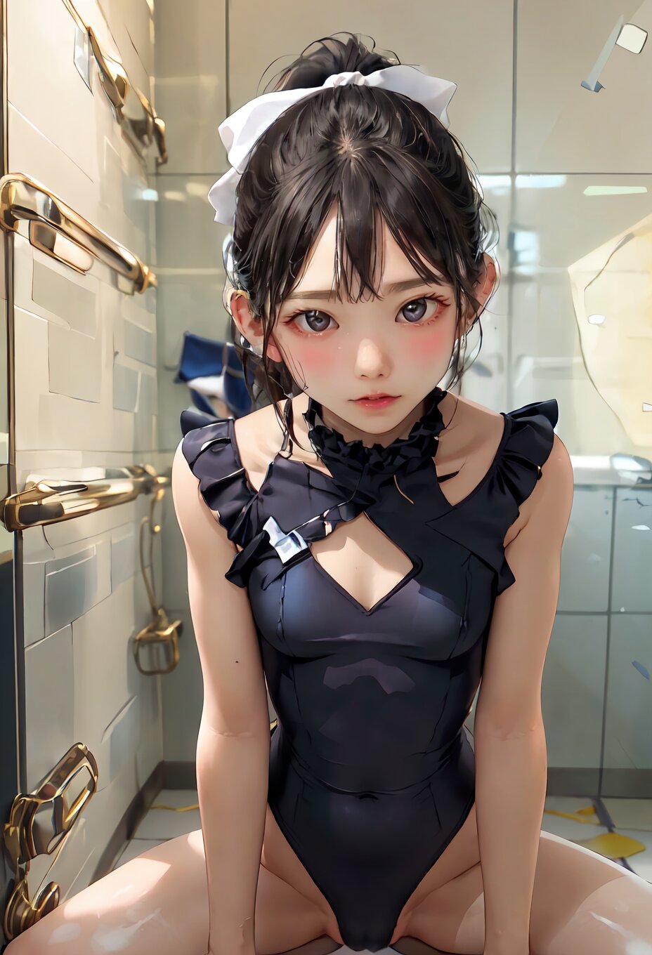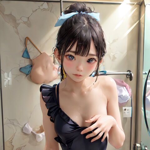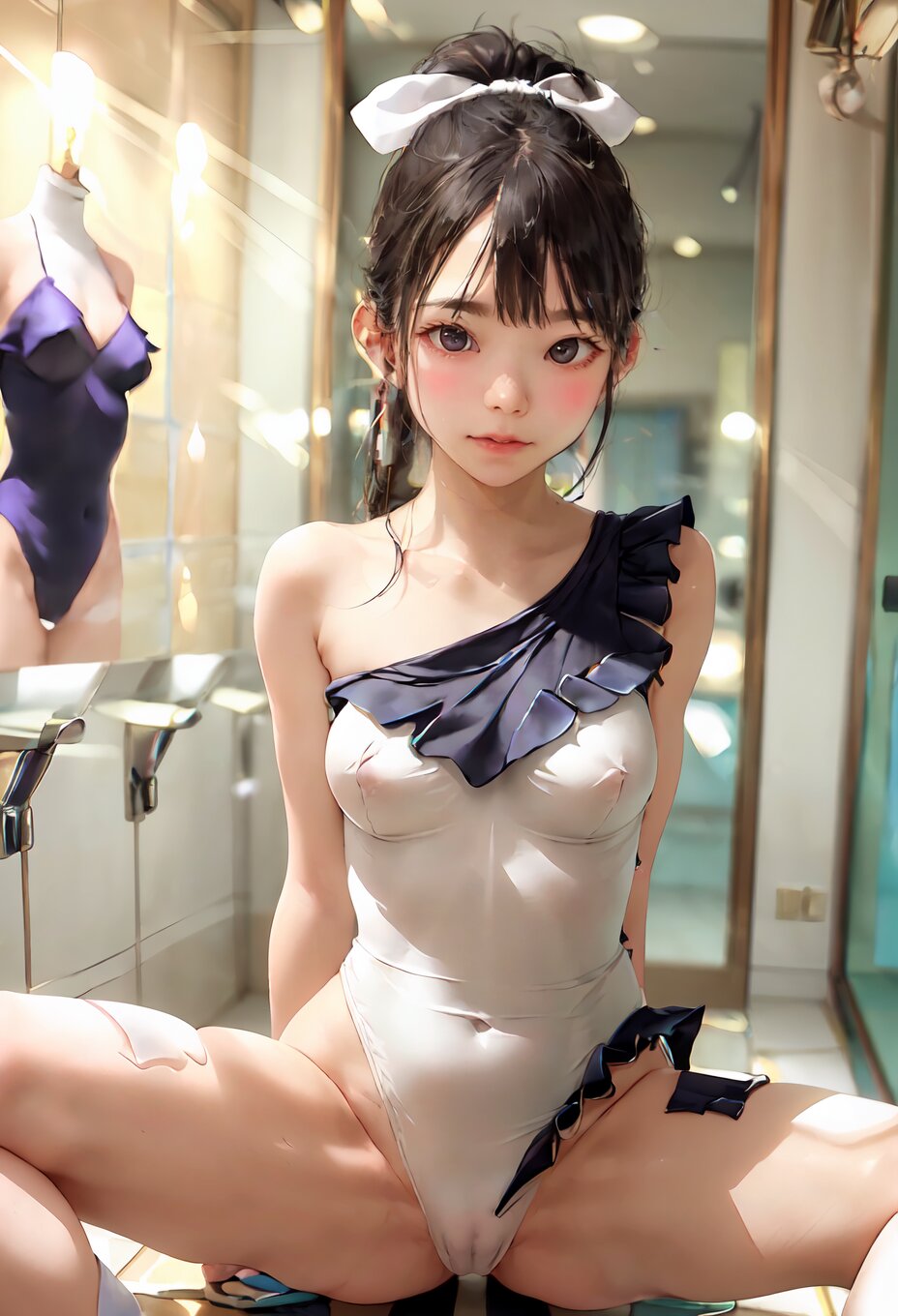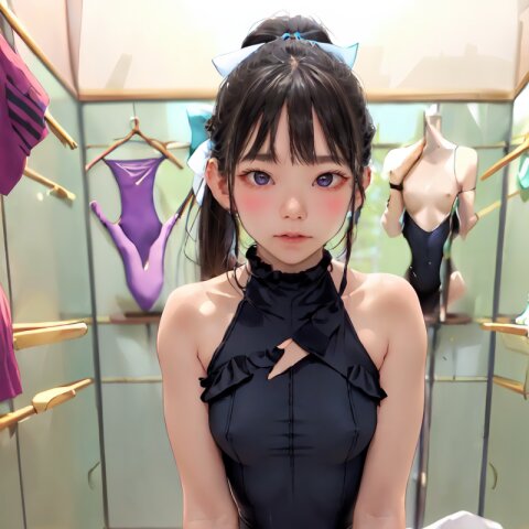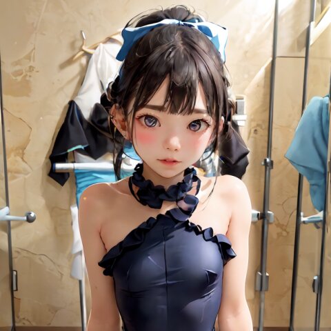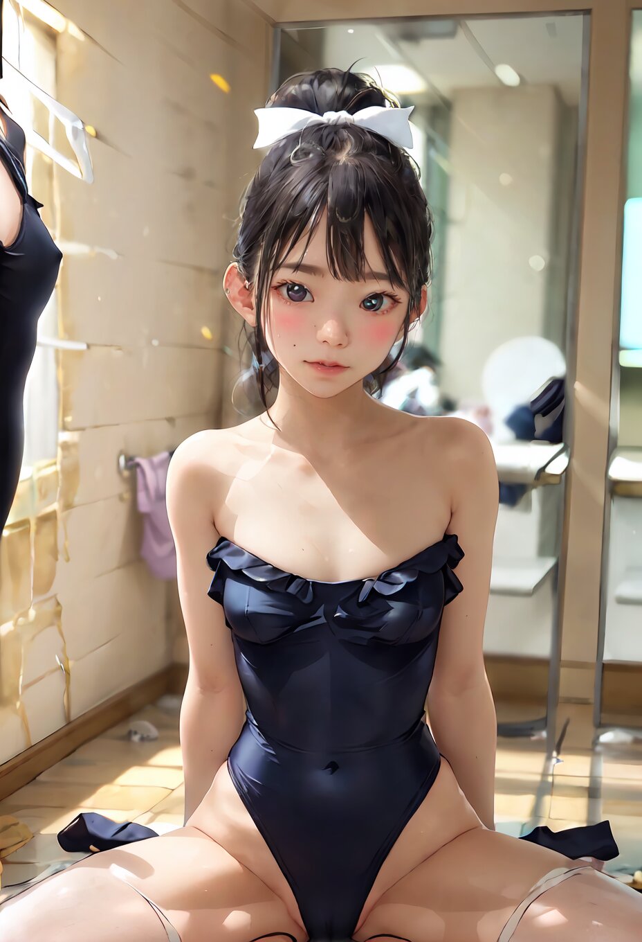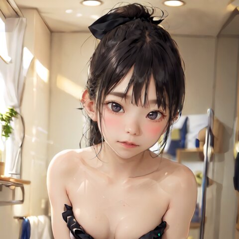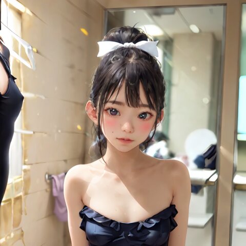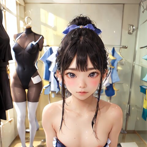 nsfw, (((nude))), from front, (((sexy))), masterpiece, best quality, ultra-detailed, (photorealistic:1.2), colorful, depth of field, lens flare, 1girl, 12 years old, (small face: 1.4), sitting, black hair, looking at viewer, (leotard,frilled_leotard:1.2155),athletic_leotard, huge_breasts, solo_focus, bow, ribbon, hair_bow, hair_tubes, ponytail, blunt_bangs, indoor, dance studio, (((upper body))), showing breast and nipple, black pantyhose, detailed skin texture, detailed cloth texture, beautiful detailed face, (((small face))), (sitting on floor, wide spreading legs, in the changing room: 1.6), <lora:naga_v02:0.8>