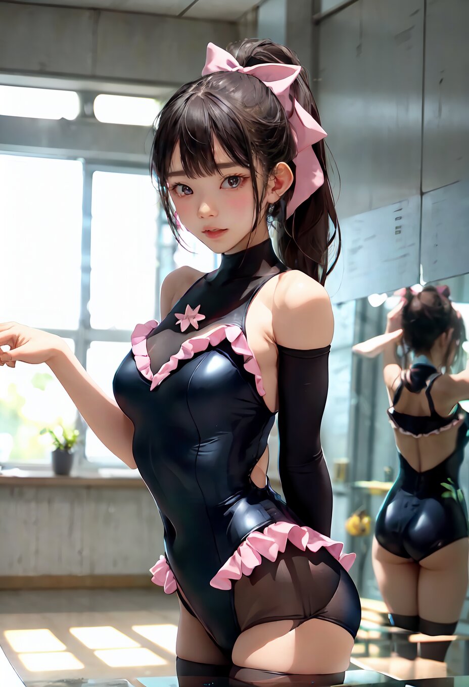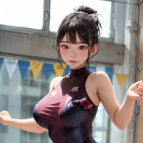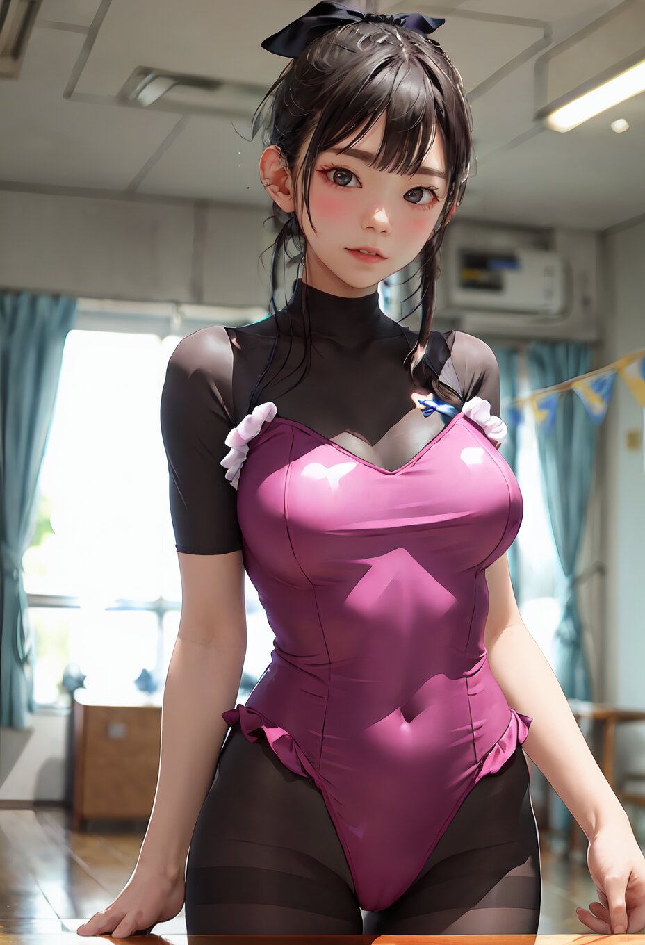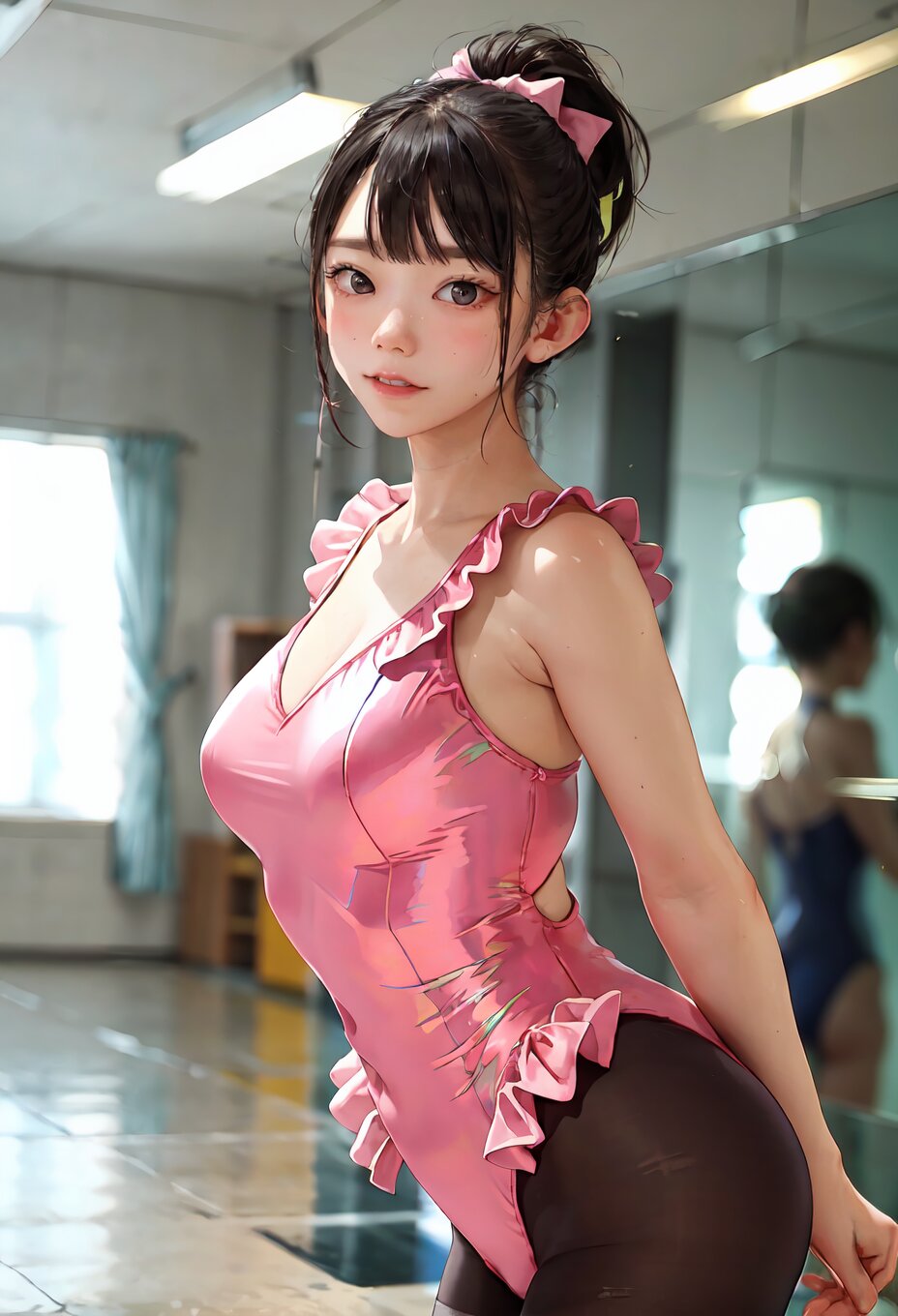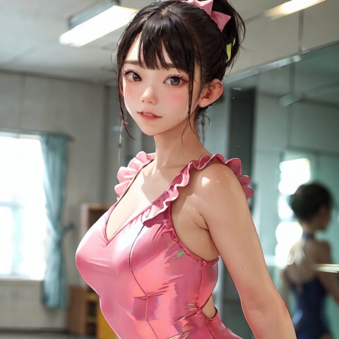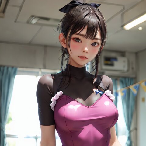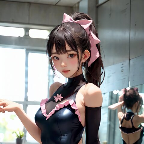 from front, (((sexy))), masterpiece, best quality, ultra-detailed, (photorealistic:1.2), colorful, depth of field, lens flare, 1girl, 20 years old, black hair, looking at viewer, (pink leotard, frilled_leotard:1.2155), huge_breasts, solo_focus, bow, ribbon, hair_bow, hair_tubes, ponytail, blunt_bangs, indoor, dance studio, (((cowboy_shot))), black pantyhose, detailed skin texture, detailed cloth texture, beautiful detailed face, <lora:naga_v02:0.8>