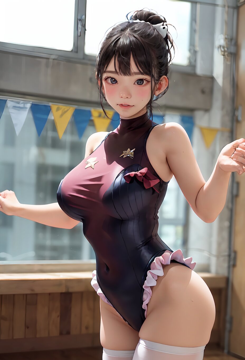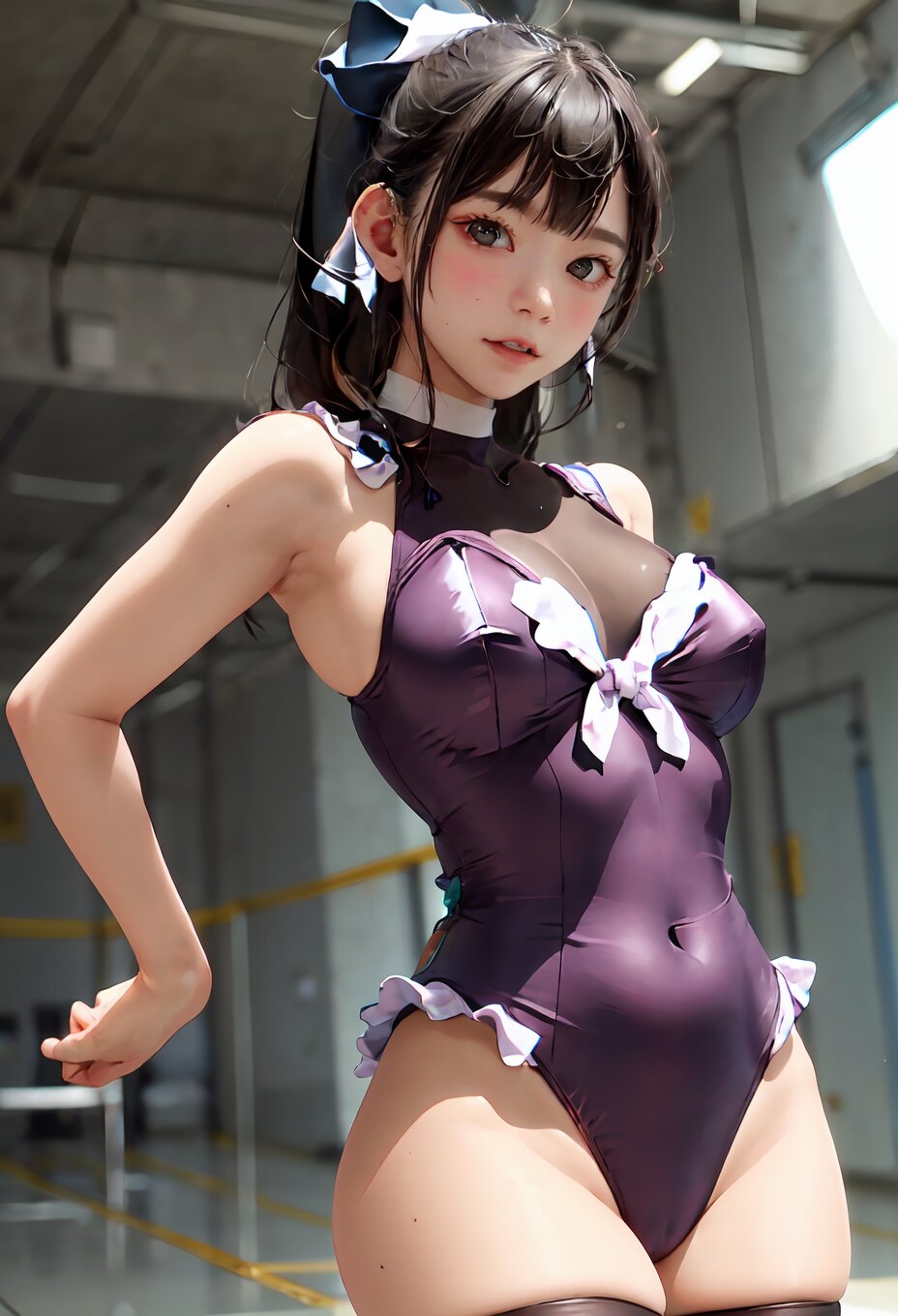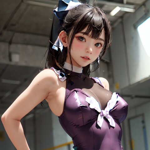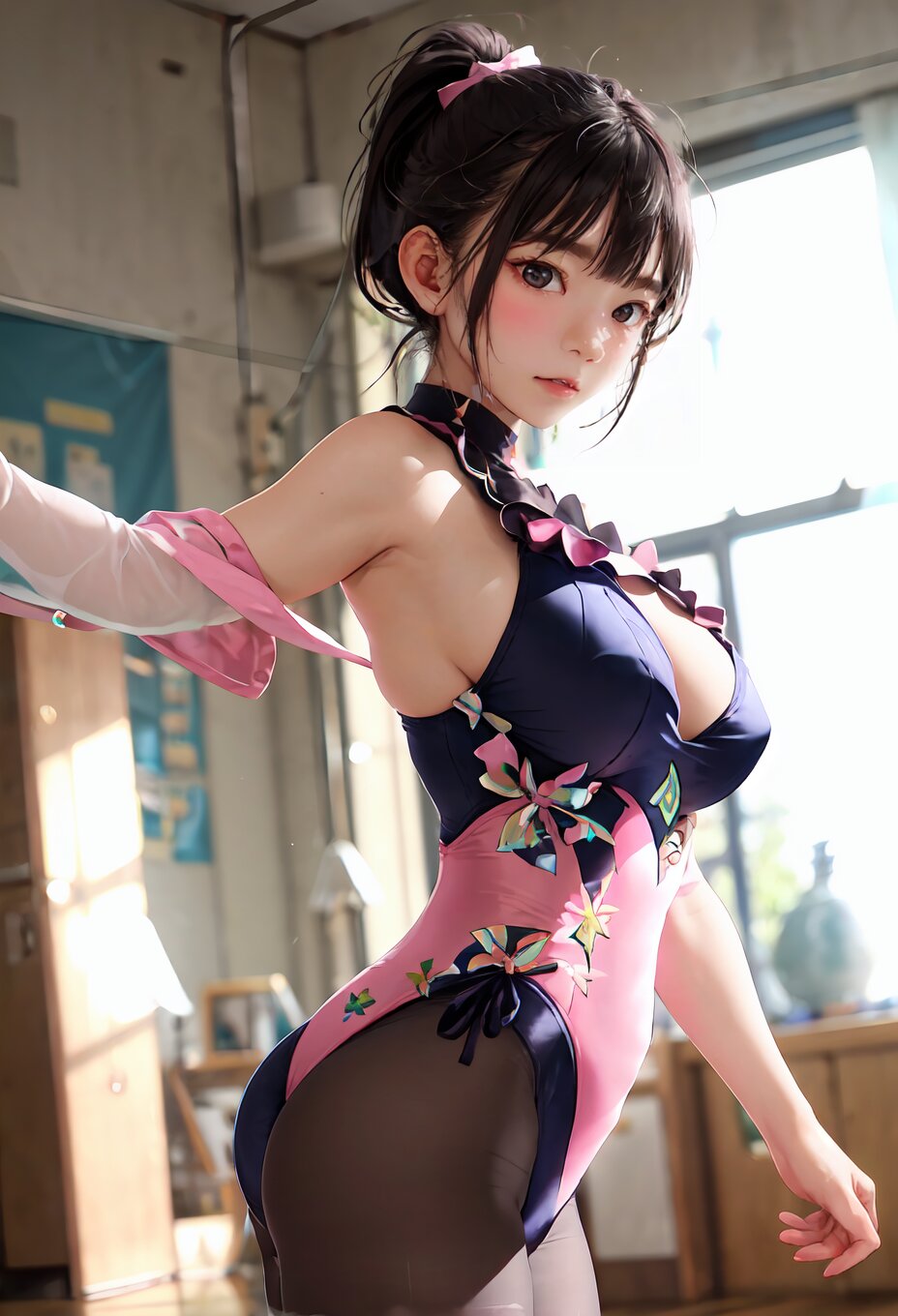 from front, (((sexy))), masterpiece, best quality, ultra-detailed, (photorealistic:1.2), colorful, depth of field, lens flare, 1girl, 20 years old, black hair, looking at viewer, (pink leotard, frilled_leotard:1.2155), huge_breasts, solo_focus, bow, ribbon, hair_bow, hair_tubes, ponytail, blunt_bangs, indoor, dance studio, (((cowboy_shot))), black pantyhose, detailed skin texture, detailed cloth texture, beautiful detailed face, <lora:naga_v02:0.8>