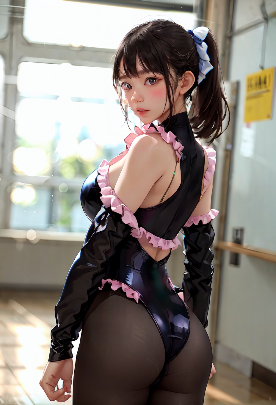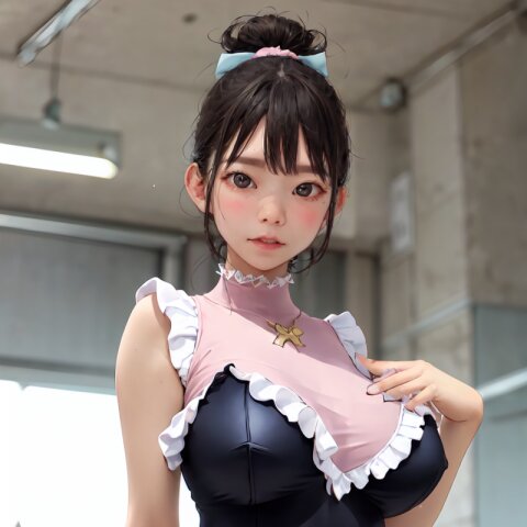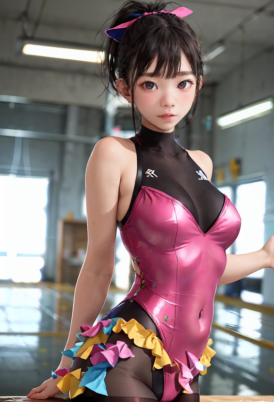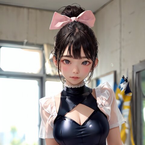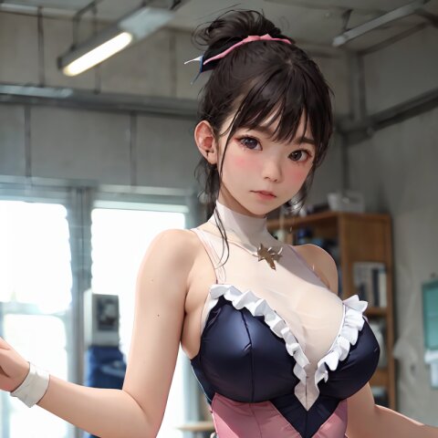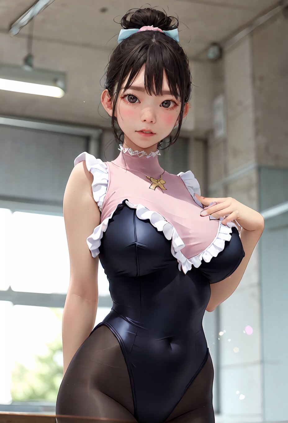 from front, (((sexy))), masterpiece, best quality, ultra-detailed, (photorealistic:1.2), colorful, depth of field, lens flare, 1girl, 20 years old, black hair, looking at viewer, (pink leotard, frilled_leotard:1.2155), huge_breasts, solo_focus, bow, ribbon, hair_bow, hair_tubes, ponytail, blunt_bangs, indoor, dance studio, (((cowboy_shot))), black pantyhose, detailed skin texture, detailed cloth texture, beautiful detailed face, <lora:naga_v02:0.8>