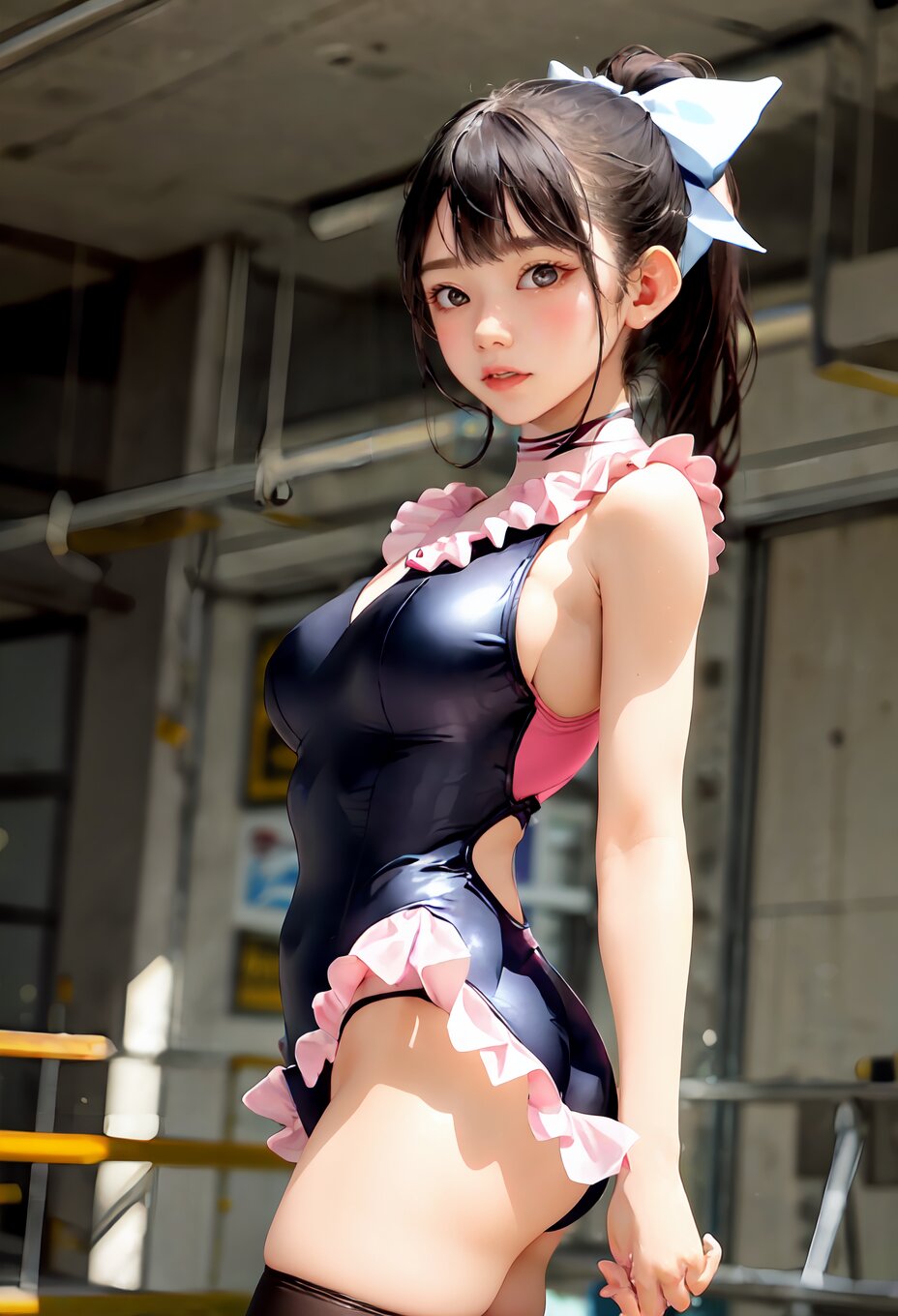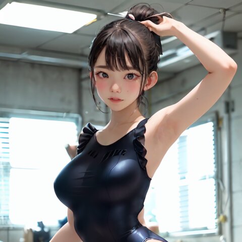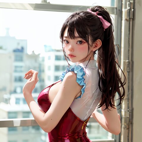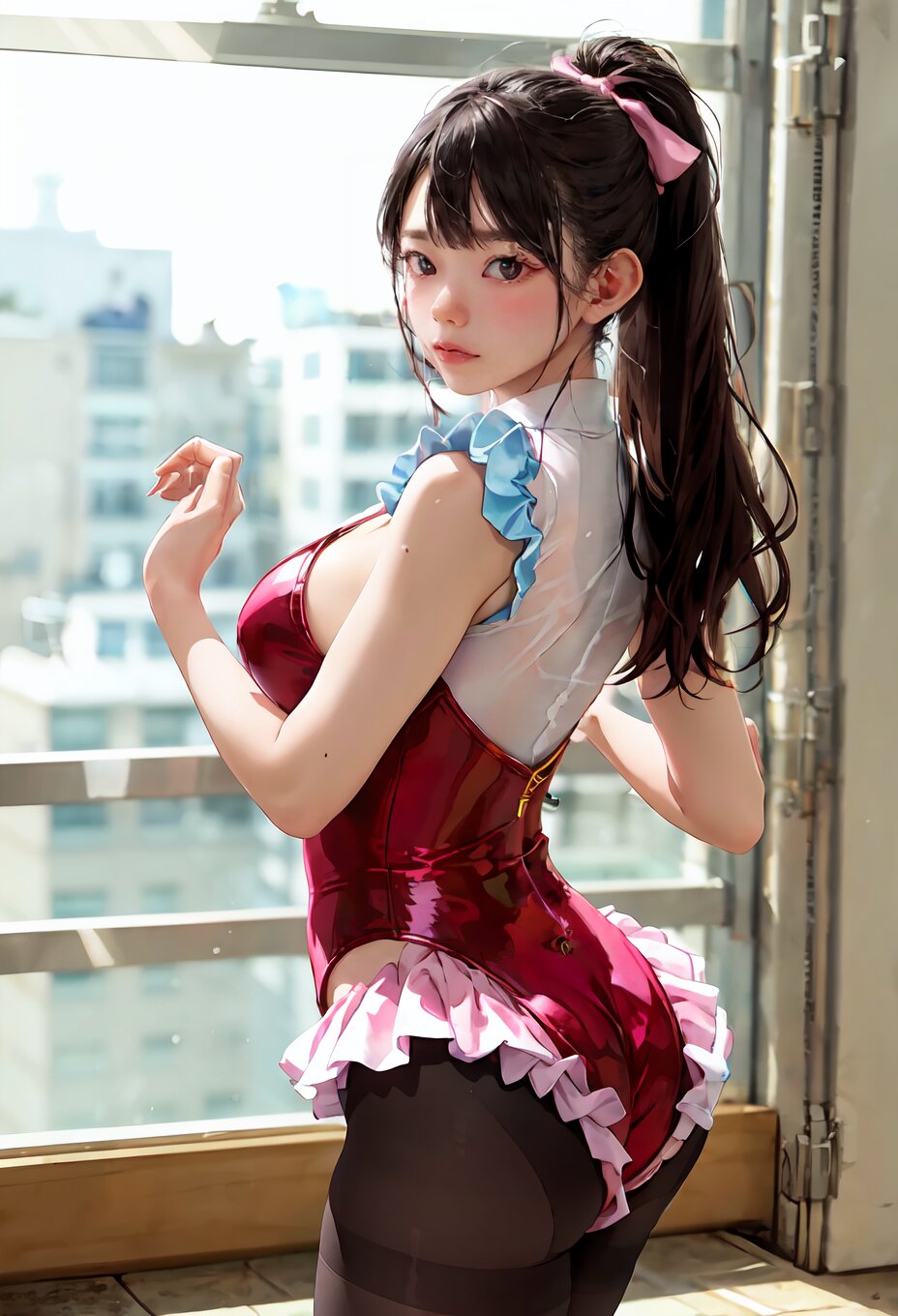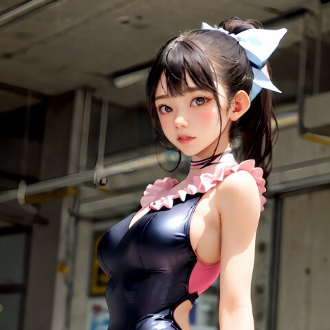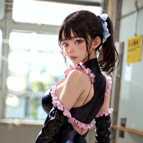 from front, (((sexy))), masterpiece, best quality, ultra-detailed, (photorealistic:1.2), colorful, depth of field, lens flare, 1girl, 20 years old, black hair, looking at viewer, (pink leotard, frilled_leotard:1.2155), huge_breasts, solo_focus, bow, ribbon, hair_bow, hair_tubes, ponytail, blunt_bangs, indoor, dance studio, (((cowboy_shot))), black pantyhose, detailed skin texture, detailed cloth texture, beautiful detailed face, <lora:naga_v02:0.8>