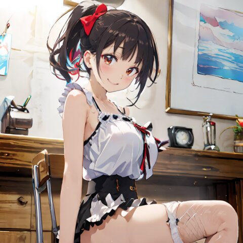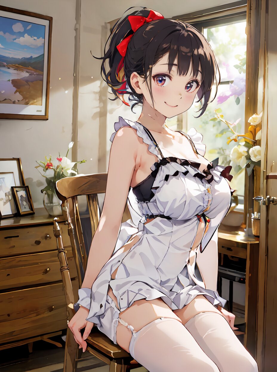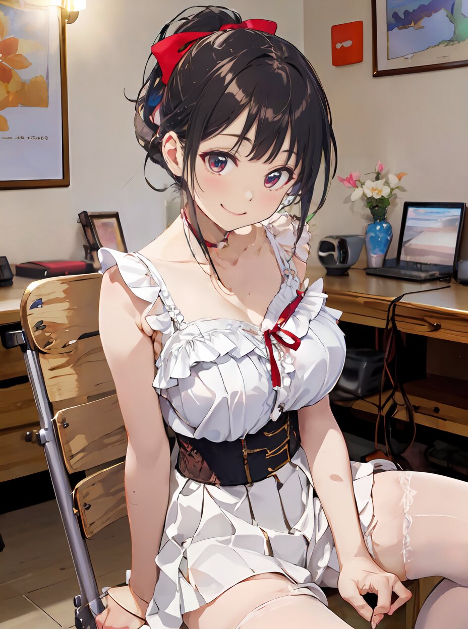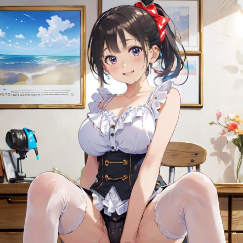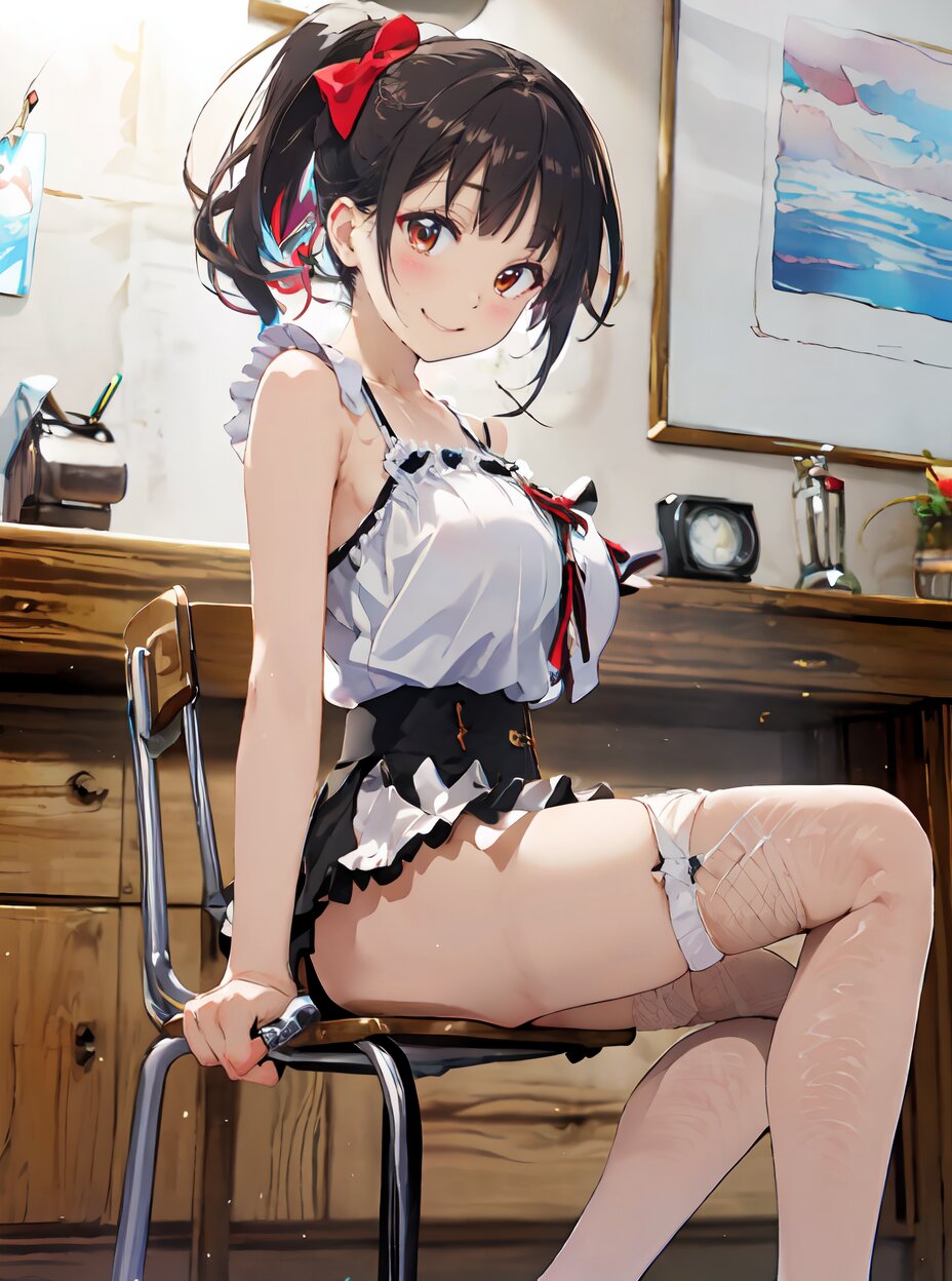 from below, (((sexy))), masterpiece, best quality, ultra-detailed, (photorealistic:1.2), colorful, depth of field, lens flare, 1girl, 12 years old, (perfect anatomy, small face: 1.4), black hair, looking at viewer, (white camisole, frilled_camisole:1.4), (huge_breasts: 1.6), solo_focus, bow, ribbon, hair_bow, hair_tubes, ponytail, blunt_bangs, dark bedroom, (((cowboy shot))), white pantyhose, detailed skin texture, detailed cloth texture, beautiful detailed face, (sitting on chair, rising up legs: 1.4), <lora:mao_v01:1>