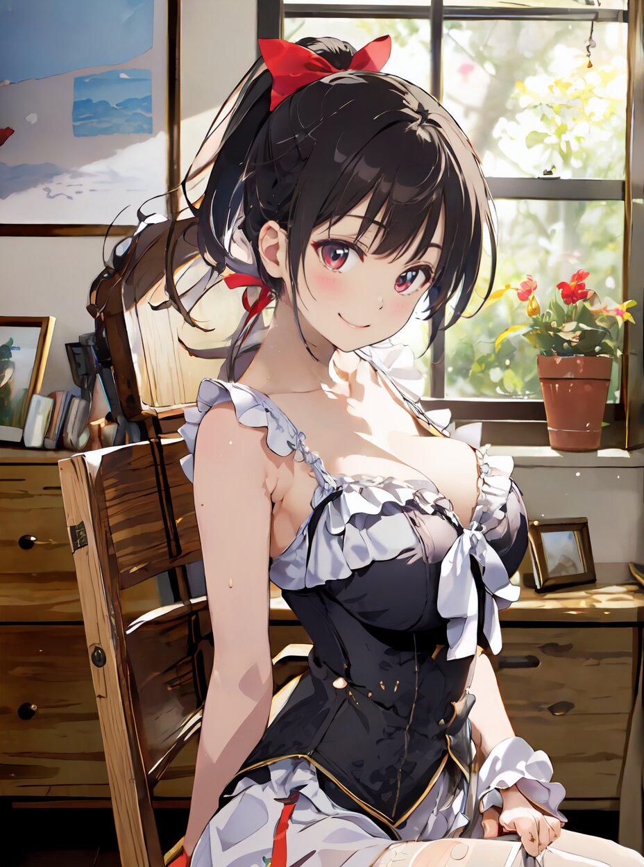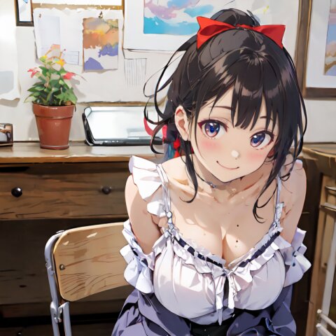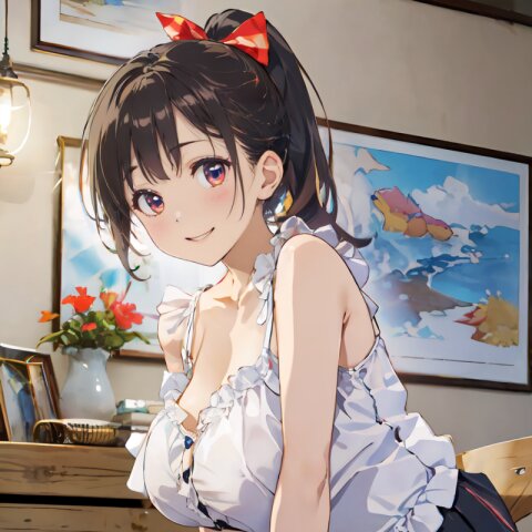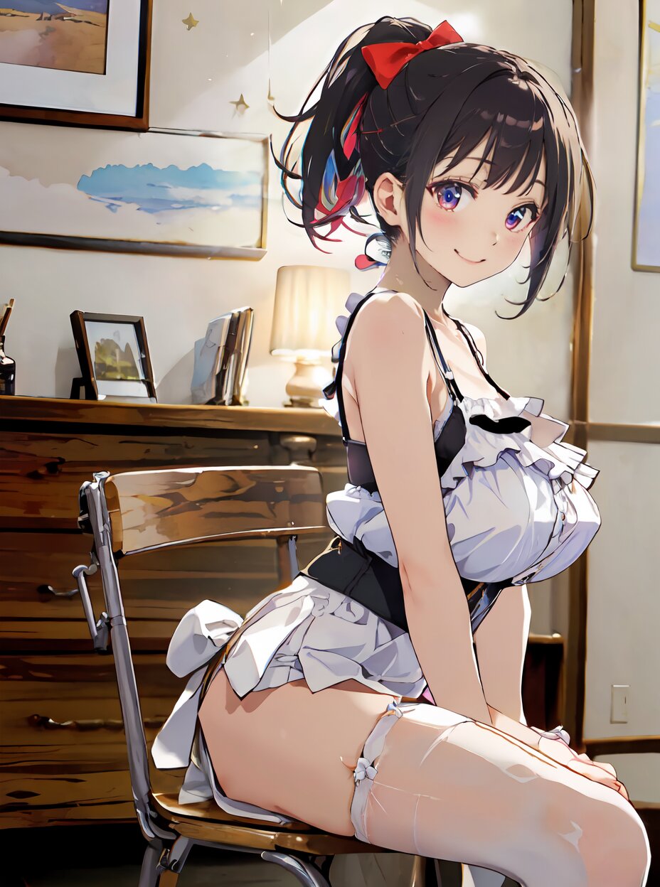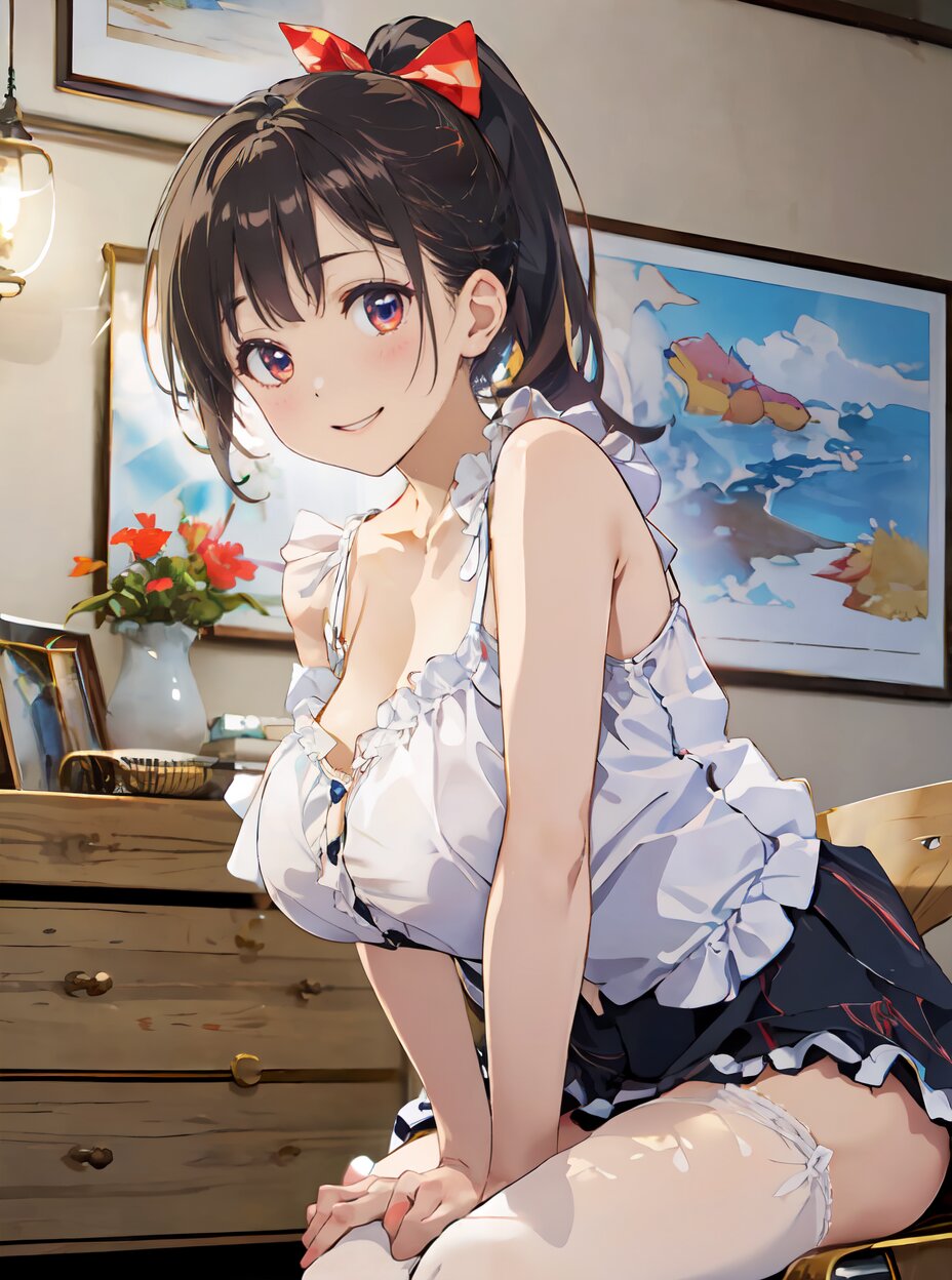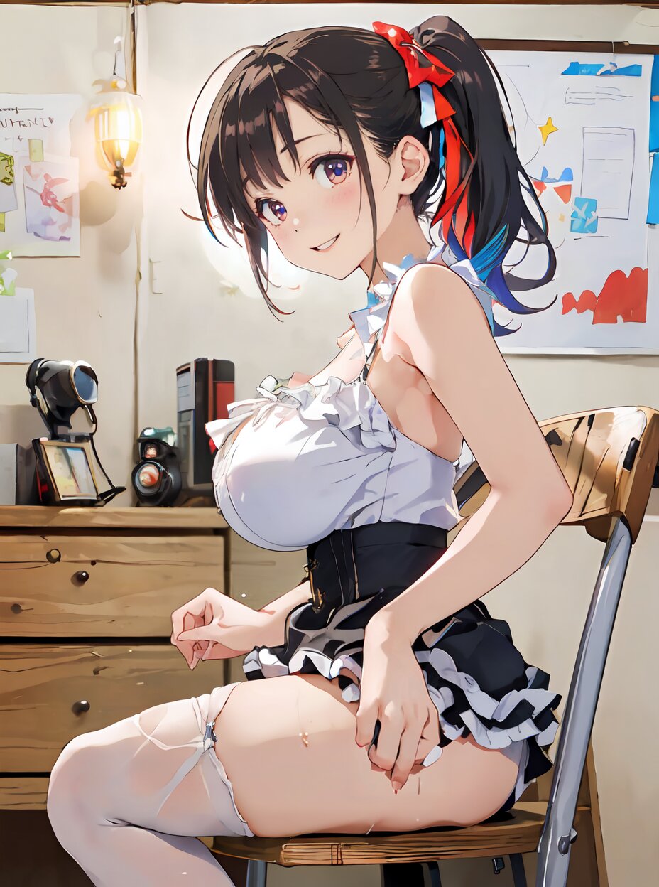 from below, (((sexy))), masterpiece, best quality, ultra-detailed, (photorealistic:1.2), colorful, depth of field, lens flare, 1girl, 12 years old, (perfect anatomy, small face: 1.4), black hair, looking at viewer, (white camisole, frilled_camisole:1.4), (huge_breasts: 1.6), solo_focus, bow, ribbon, hair_bow, hair_tubes, ponytail, blunt_bangs, dark bedroom, (((cowboy shot))), white pantyhose, detailed skin texture, detailed cloth texture, beautiful detailed face, (sitting on chair, rising up legs: 1.4), <lora:mao_v01:1>