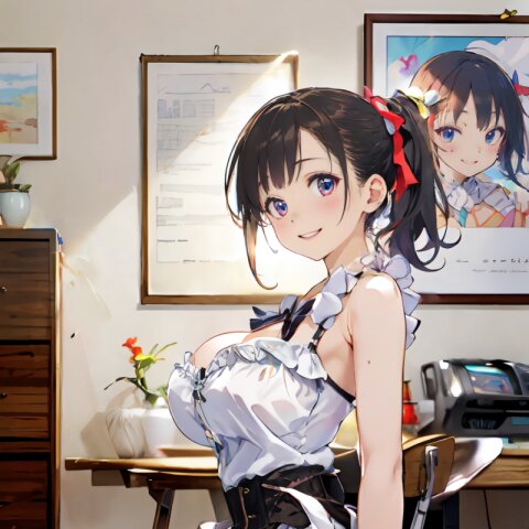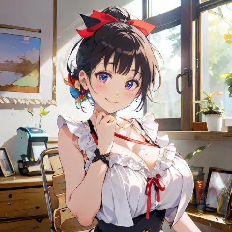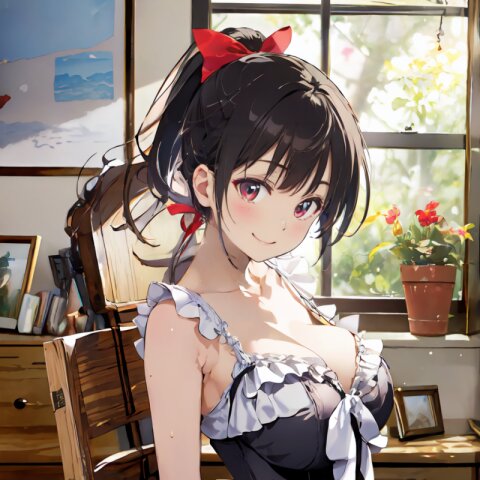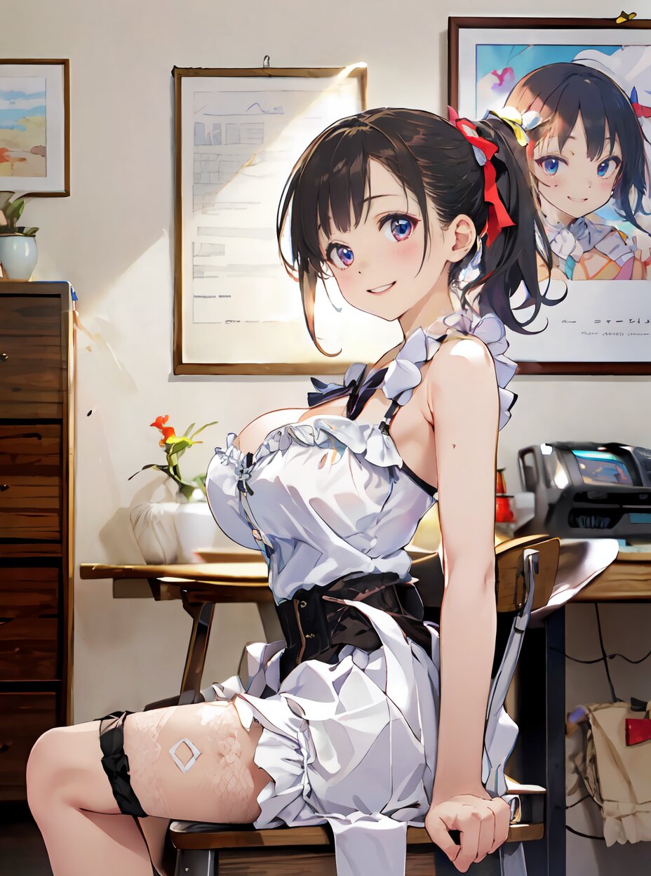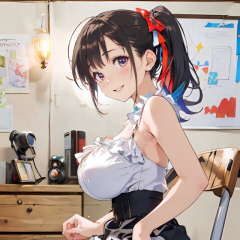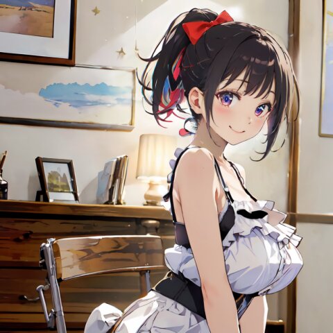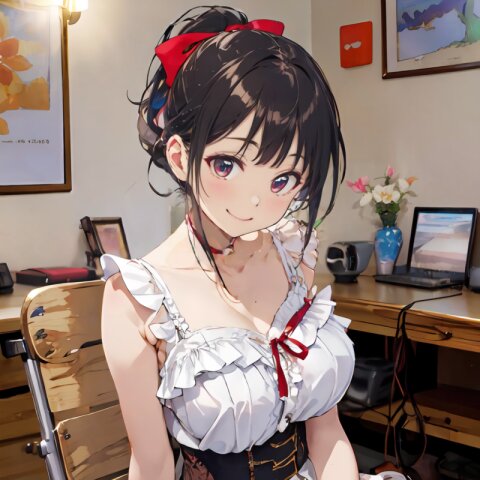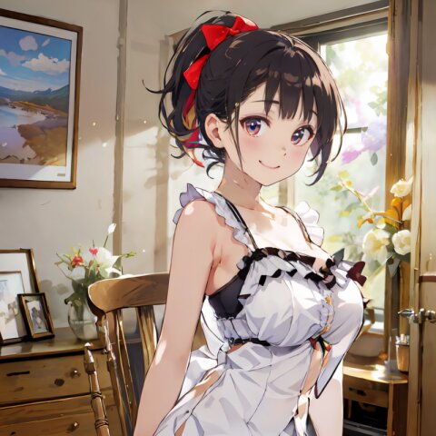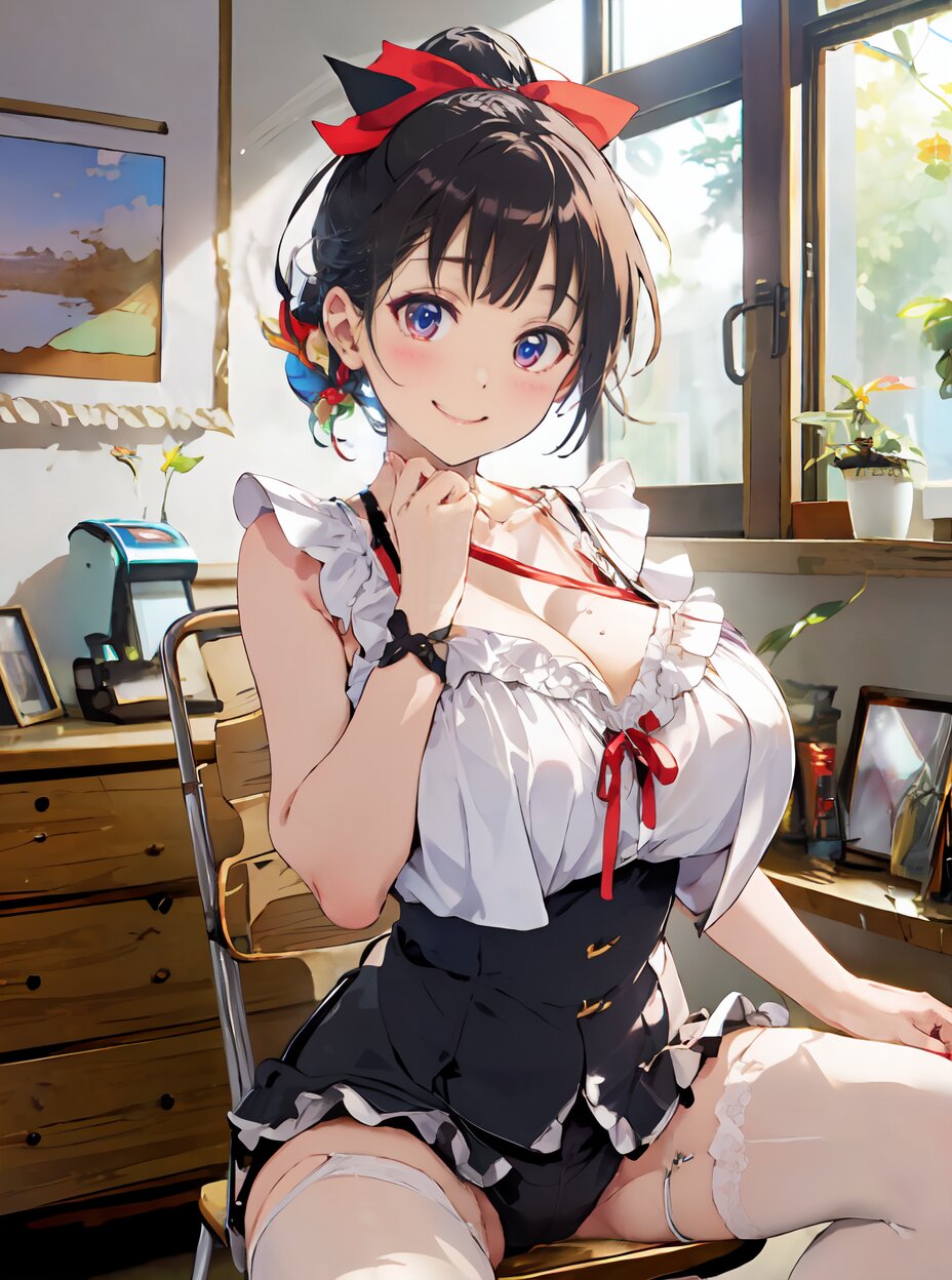 from below, (((sexy))), masterpiece, best quality, ultra-detailed, (photorealistic:1.2), colorful, depth of field, lens flare, 1girl, 12 years old, (perfect anatomy, small face: 1.4), black hair, looking at viewer, (white camisole, frilled_camisole:1.4), (huge_breasts: 1.6), solo_focus, bow, ribbon, hair_bow, hair_tubes, ponytail, blunt_bangs, dark bedroom, (((cowboy shot))), white pantyhose, detailed skin texture, detailed cloth texture, beautiful detailed face, (sitting on chair, rising up legs: 1.4), <lora:mao_v01:1>