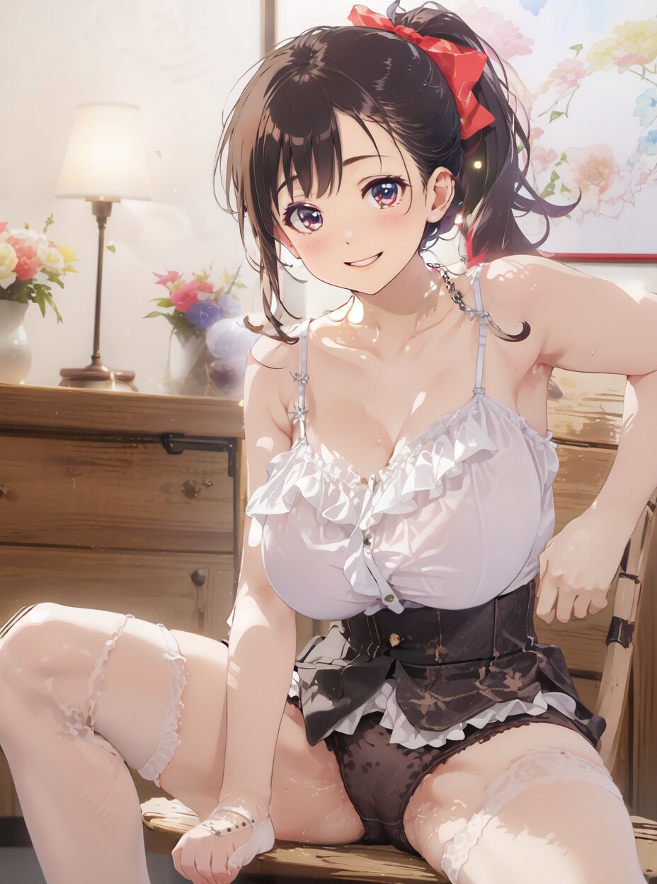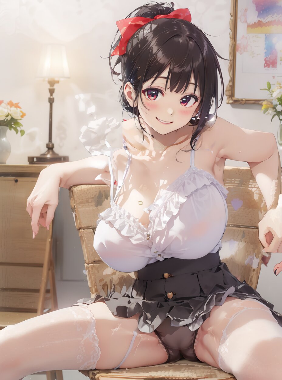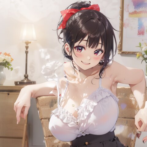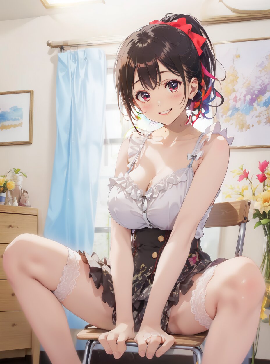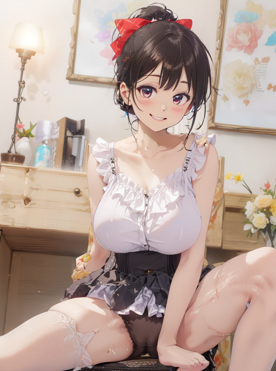 from below, (((sexy))), masterpiece, best quality, ultra-detailed, (photorealistic:1.2), colorful, depth of field, lens flare, 1girl, 12 years old, (perfect anatomy, small face: 1.4), black hair, looking at viewer, (white camisole, frilled_camisole:1.4), (huge_breasts: 1.6), solo_focus, bow, ribbon, hair_bow, hair_tubes, ponytail, blunt_bangs, dark bedroom, (((cowboy shot))), white pantyhose, detailed skin texture, detailed cloth texture, beautiful detailed face, (sitting on chair, wide spreading legs: 1.4), <lora:mao_v01:1>