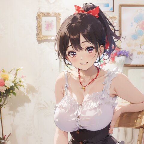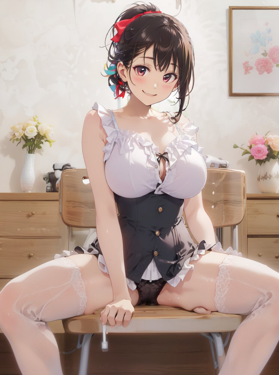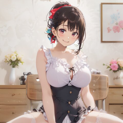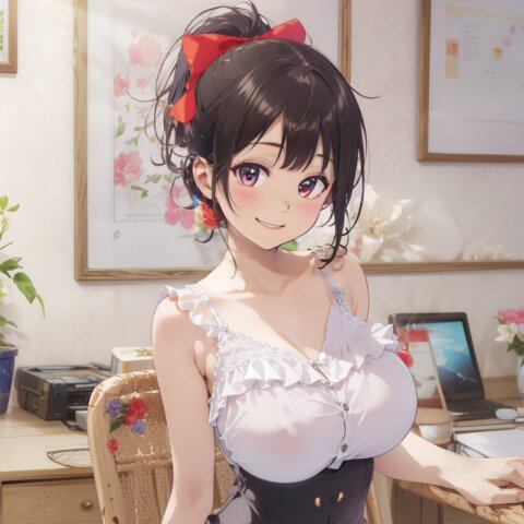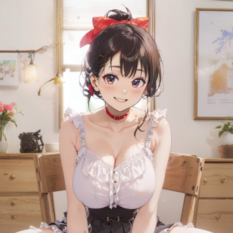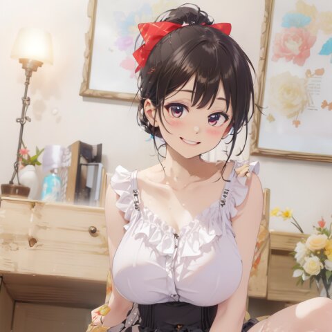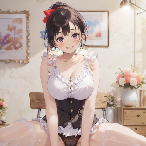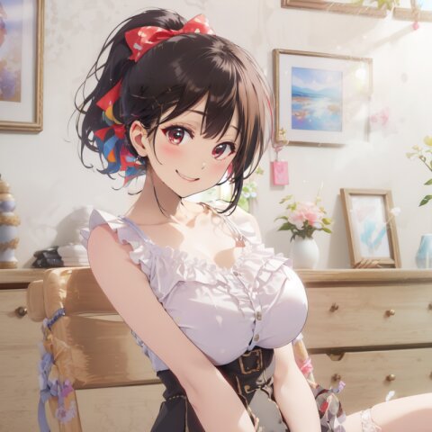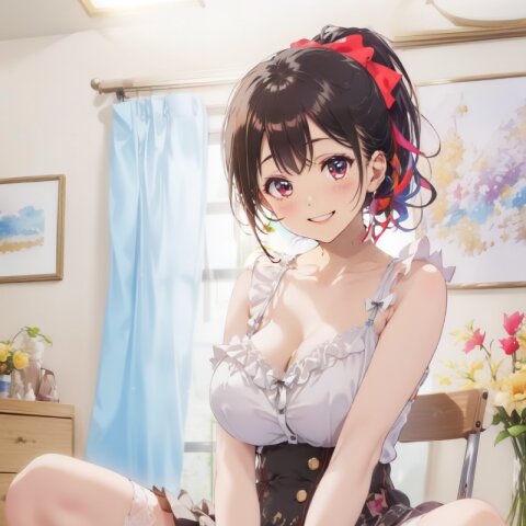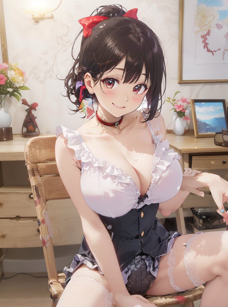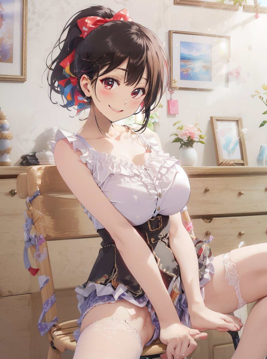 from below, (((sexy))), masterpiece, best quality, ultra-detailed, (photorealistic:1.2), colorful, depth of field, lens flare, 1girl, 12 years old, (perfect anatomy, small face: 1.4), black hair, looking at viewer, (white camisole, frilled_camisole:1.4), (huge_breasts: 1.6), solo_focus, bow, ribbon, hair_bow, hair_tubes, ponytail, blunt_bangs, dark bedroom, (((cowboy shot))), white pantyhose, detailed skin texture, detailed cloth texture, beautiful detailed face, (sitting on chair, wide spreading legs: 1.4), <lora:mao_v01:1>