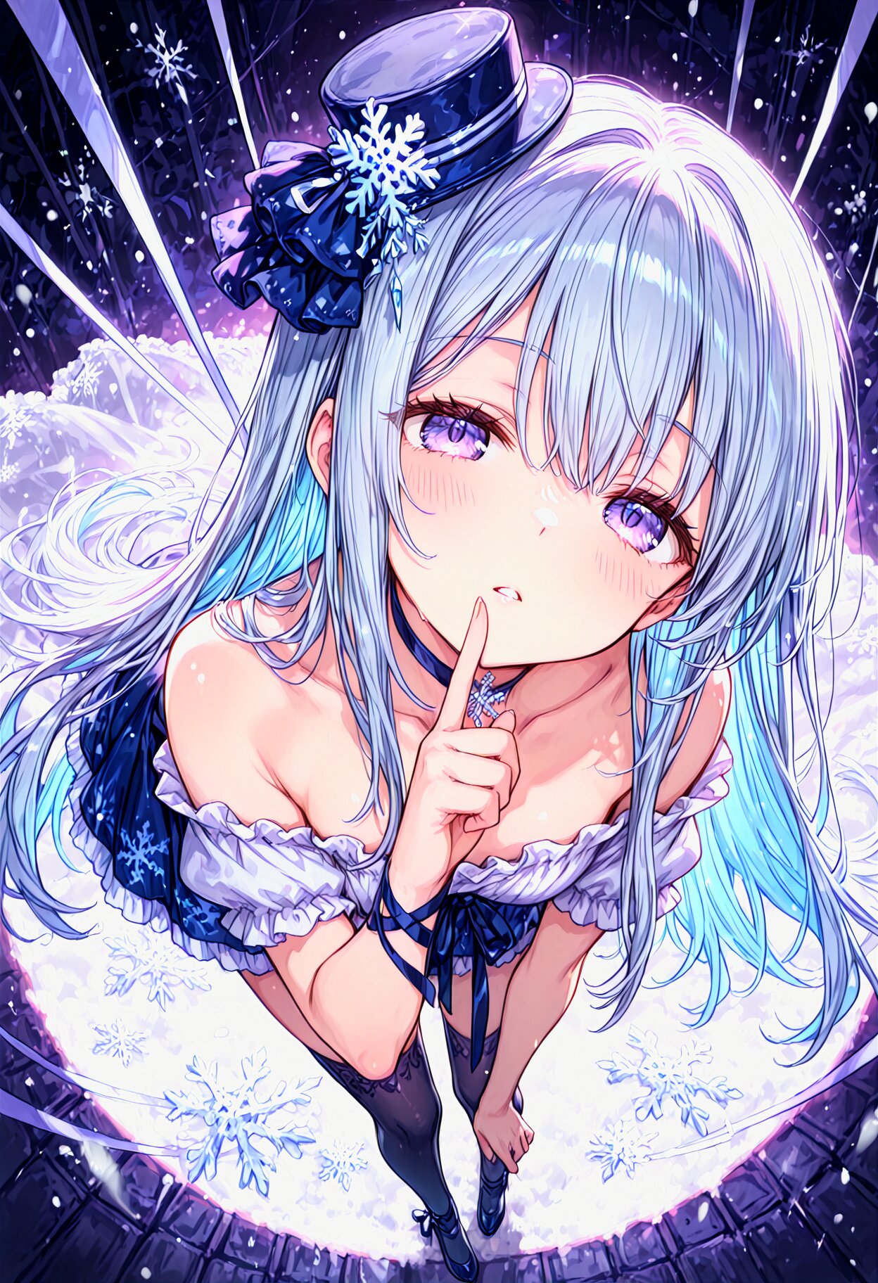 amazing quality,best quality,ultra-detailed,ultra-detailed-eyes, beautiful detailed background, pale colors,pastel colors, (dark theme,:0.9),(purple theme:0.8), full body, wide shot, portrait, collarbone, parted lips,(Expressionless:0.8), big eyes,half-closed eyes, tareme, pale purple eyes, thighhighs, (silver hair:1.1), (dark blue hair colored inner hair:0.8), long hair,very long hair eyebrows visible through hair, high angle, snowflake, clarity, (white off-shoulder:1.1) and dark blue skirt, see-through veil, mini hat, blue strapping ribbon and bow, frills, strapping ribbon, choker, round lighting, temptation, below wind,, looking at viewer, bent over,,looking up, index finger raised,head tilt, from above, patterned, <lora:sdxl2-flat2-512b:-1.0> <lora:noline-16oa:-1.5>