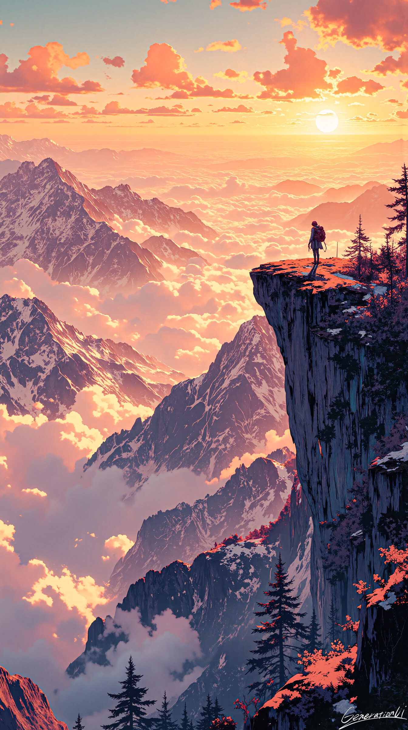 太陽がゆっくりと山々の向こうから顔を出し、雲海は金色と桃色の光をまといながら静かに波打っていた。