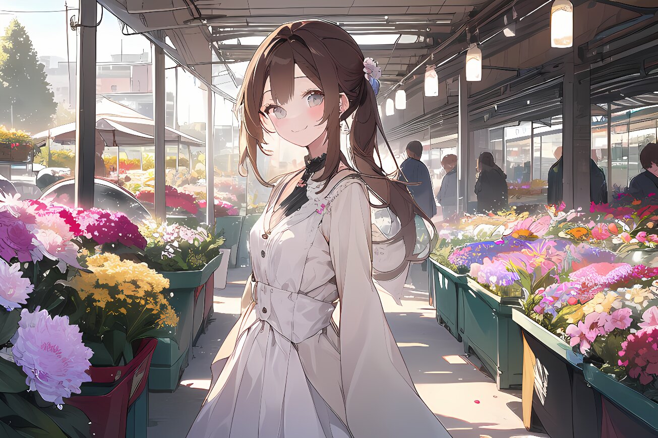 1 lady, long ponytail, brown hair, (flower market), smile, walking, (date), ,Art Style 2.0,pastellio, pastel, kawaii pastels