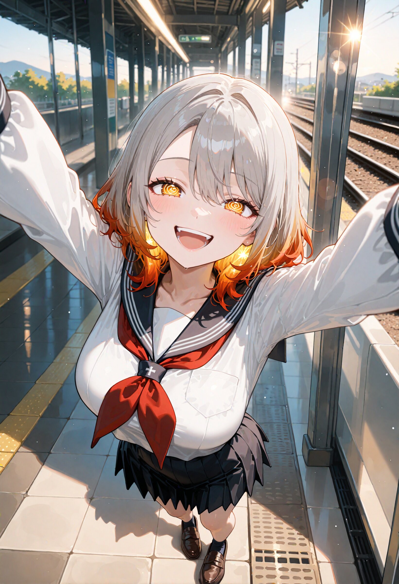 from front hip focus (from above,looking up:1.2) looking at viewer, Line art is drawn in a warm brown tone instead of black. The outlines have a soft, earthy feel, adding a gentle and nostalgic atmosphere to the illustration. 1girl, beautiful detailed eyes, cute face, cool, shiny skin, skindentation, beautiful burnt sienna eyes, @ @ , grey hair, crimson colored tips cute, medium hair, senegalese twists curtained hair , glowing hair, first-rate female body perfect body beautiful large breasts, smart hips,, warm comfy (laughing:1.5) and thinking and ^_^, seductive smile indigo serafuku, long sleeves, neckerchief , long sleeves, long plated skirt, , loafers , (mischievous smile:1.0), depth of field, bokeh, morning street, sidewalk, pavement, In front of the train station, ,, spring sunlight, morning, sunshine, direct lighting, spring morning sunlight, morning, sunshine, light particles, armpits, standing morning masterpiece, best quality, amazing quality, very aesthetic, absurdres, you can add scenery, (volumetric lighting), To make the background more distinctive. professional art lots of details, , overexposure, shiny-glistening, (watercolor style:0.0), (pastel color style:0.0) <lora:noline (1):-0.5> <lora:sdxl2-flat2-512b:0.0> <lora:facelightup_xl_v10:0.5>