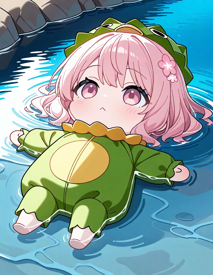 rating_safe,(comical and deformed illustrations),stone riverbed,clear river,daytime,1girl,solo,(chibi),light pink hair,light pink eyes,loose wavy hair,short bob cut hair,floral hair accessory,:<,(kappa costume),floating the river,lying on water,lying on back,((masterpiece, best quality, extremely detailed, absurdres)),