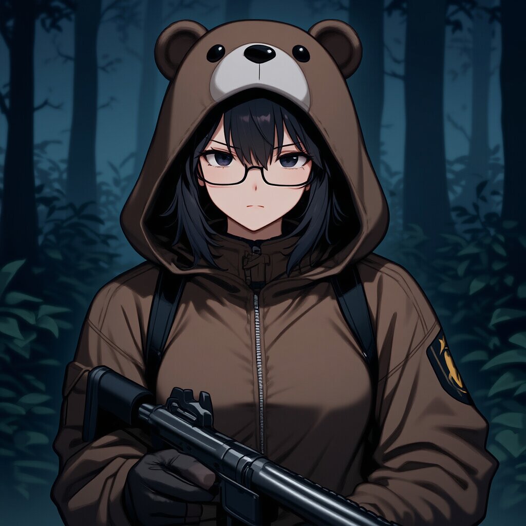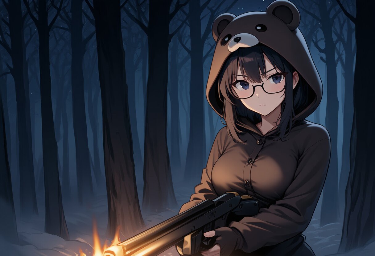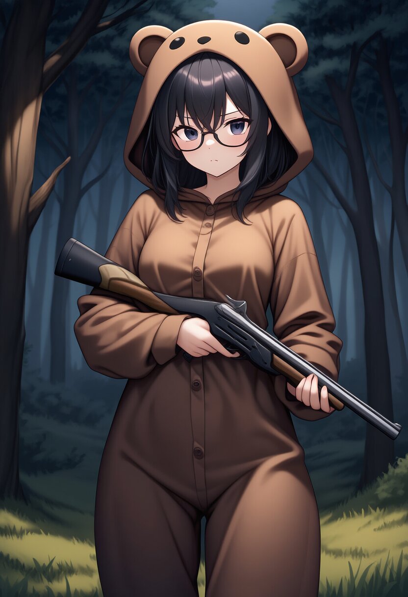 {{{highly detailed}}}, {{{interspecies}}}, {{{beautiful detailed}}}, style of ai-generated, {{slender}}, 1girl, solo, black eyes, glasses, medium hair, black hair, hair between eyes, large breasts, {{serious}}, {{{hold a sportsgun}}}, outdoor, animal costume, {{bear costume}}, forest, night, outdoors, {{{masterpiece}}}, {{{best quality}}}, {{{very aesthetic}}}, {{{ultra-detailed}}}, {illustration}, {{{extremely detailed}}}, {{{an extremely delicate and beautiful}}}