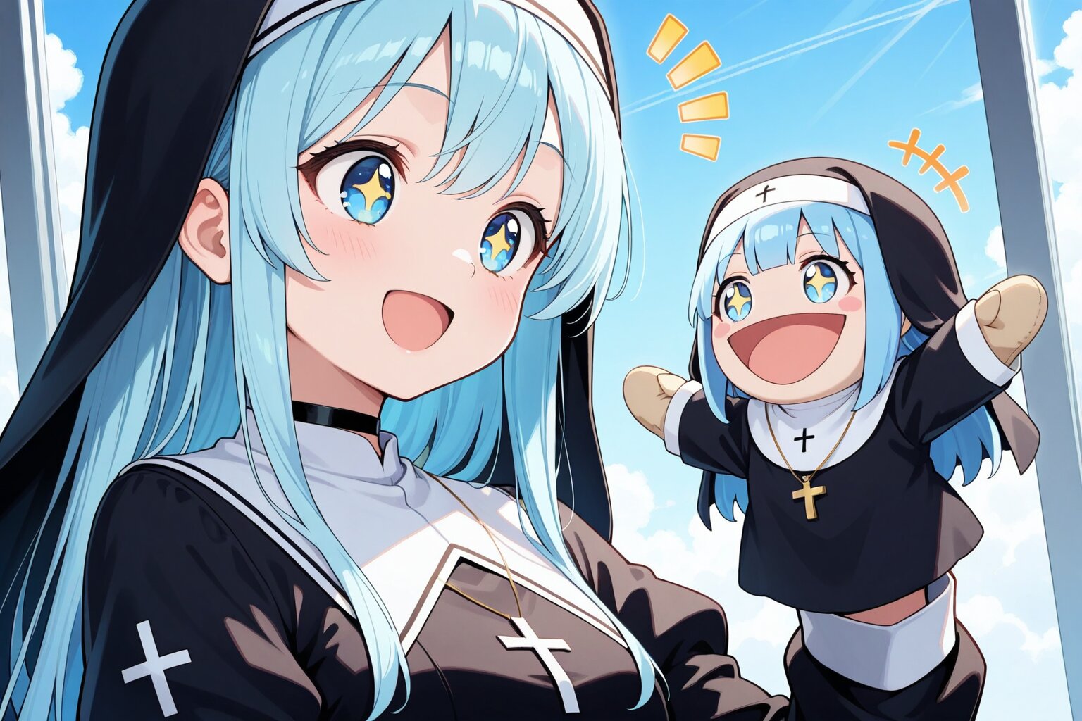 1 little girl, solo, diagonal angle, upper body, masterpiece, best quality, amazing quality, very aesthetic, sky blue hair, long hair, straight hair, blue eyes, +_+, open mouth, smile, cheerful, +++, notice lines, choker, nun outfit, hand puppet,