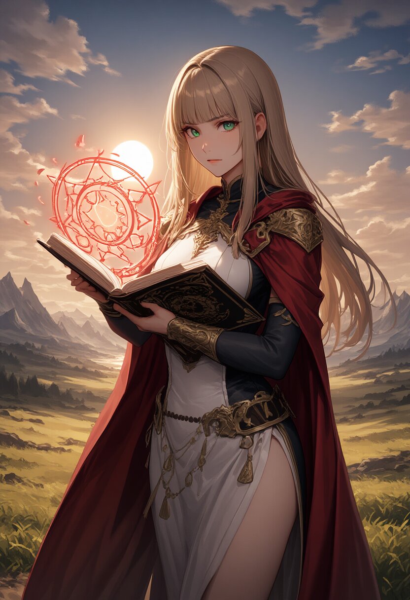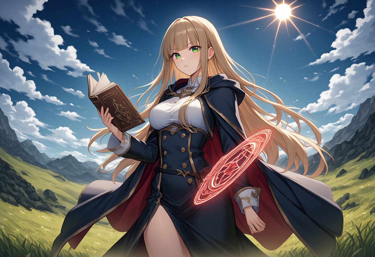 {{{highly detailed}}}, {{{interspecies}}}, {{{beautiful detailed}}}, style of ai-generated, 1girl, solo, green eyes, long hair, blunt bangs, straight hair, light brown hair, large breasts, serious, {{{magician's robe}}}, {{{hold a book}}}, red magic circle, cowboy shot, blue sky, sun, grasslands, no humans, {{{masterpiece}}}, {{{best quality}}}, {{{very aesthetic}}}, {{{ultra-detailed}}}, {illustration}, {{{extremely detailed}}}, {{{an extremely delicate and beautiful}}}