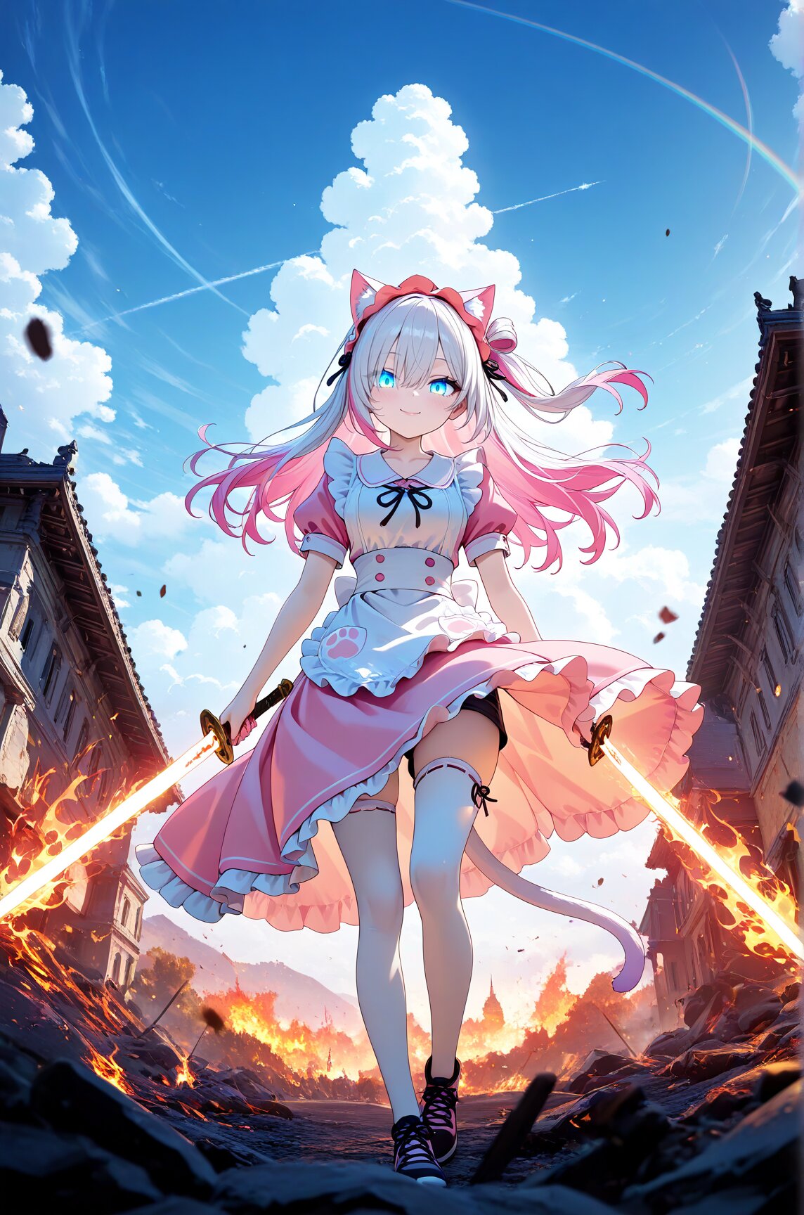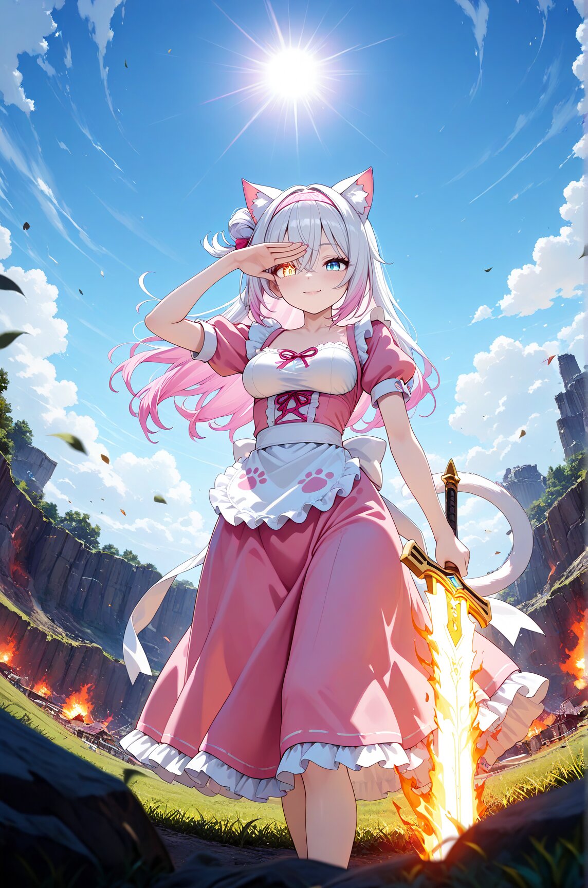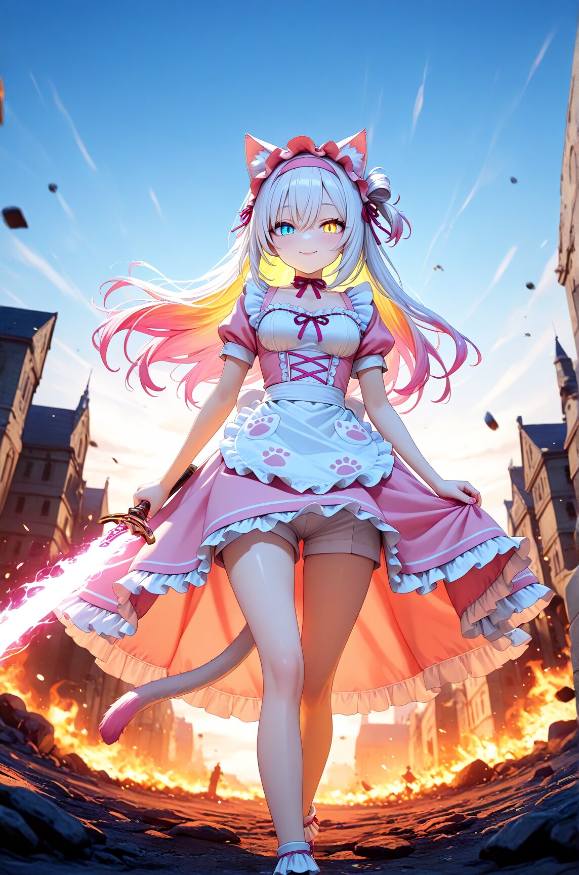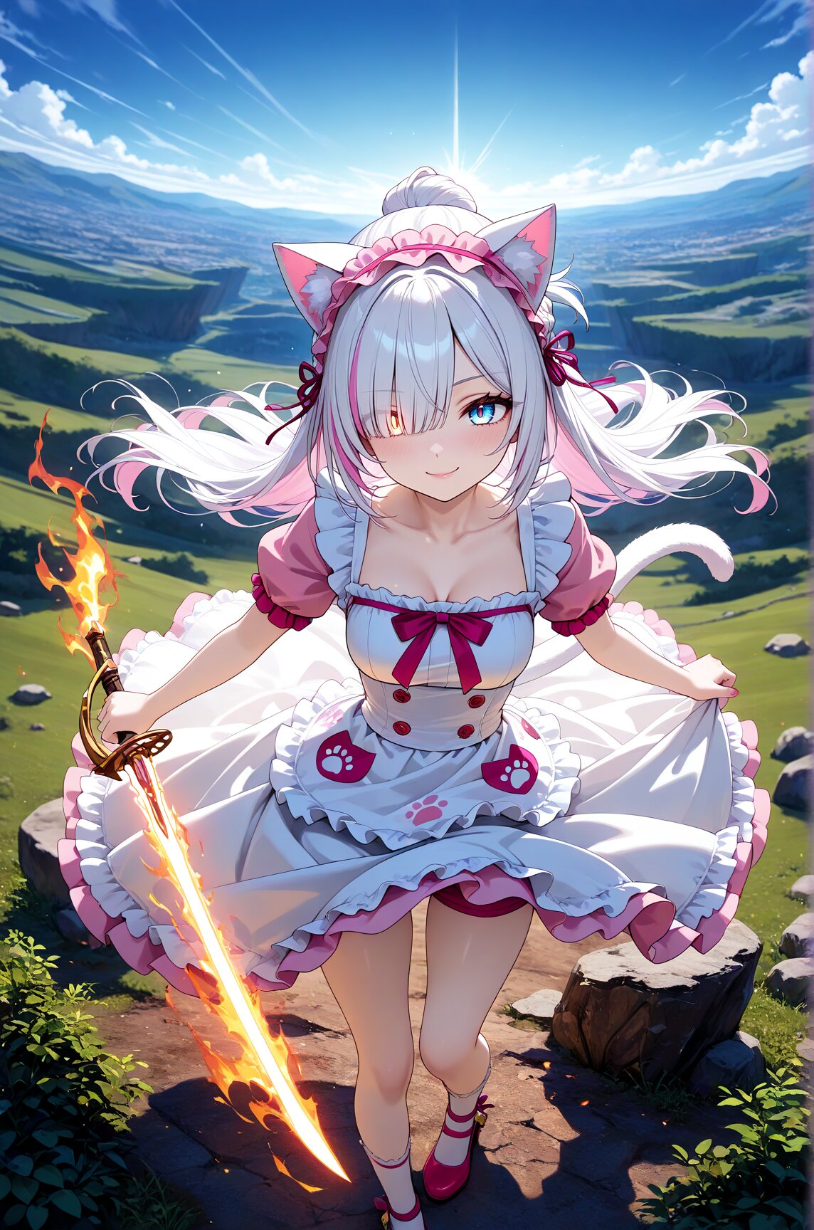Anime illustration, CG art, 3D model, 3D rendering, 3D skin texture, high detail, depth of field, 1 person, cat ears, cat tail, hime cut, side ponytail, slanted eyes, sky blue eyes, white skin, gothic lolita, 8K, masterpiece, best quality, amazing quality, very aesthetic, (volumetric lighting), overexposed,