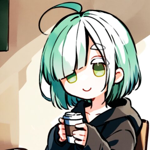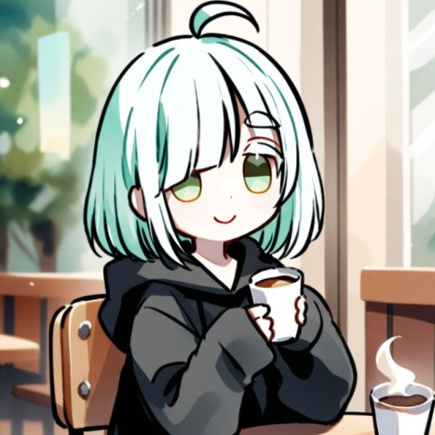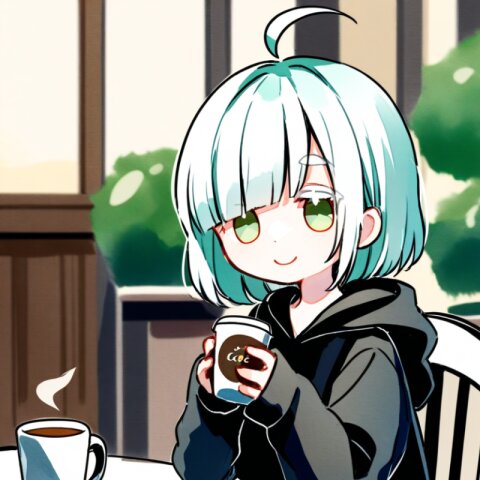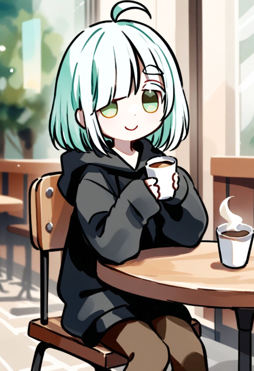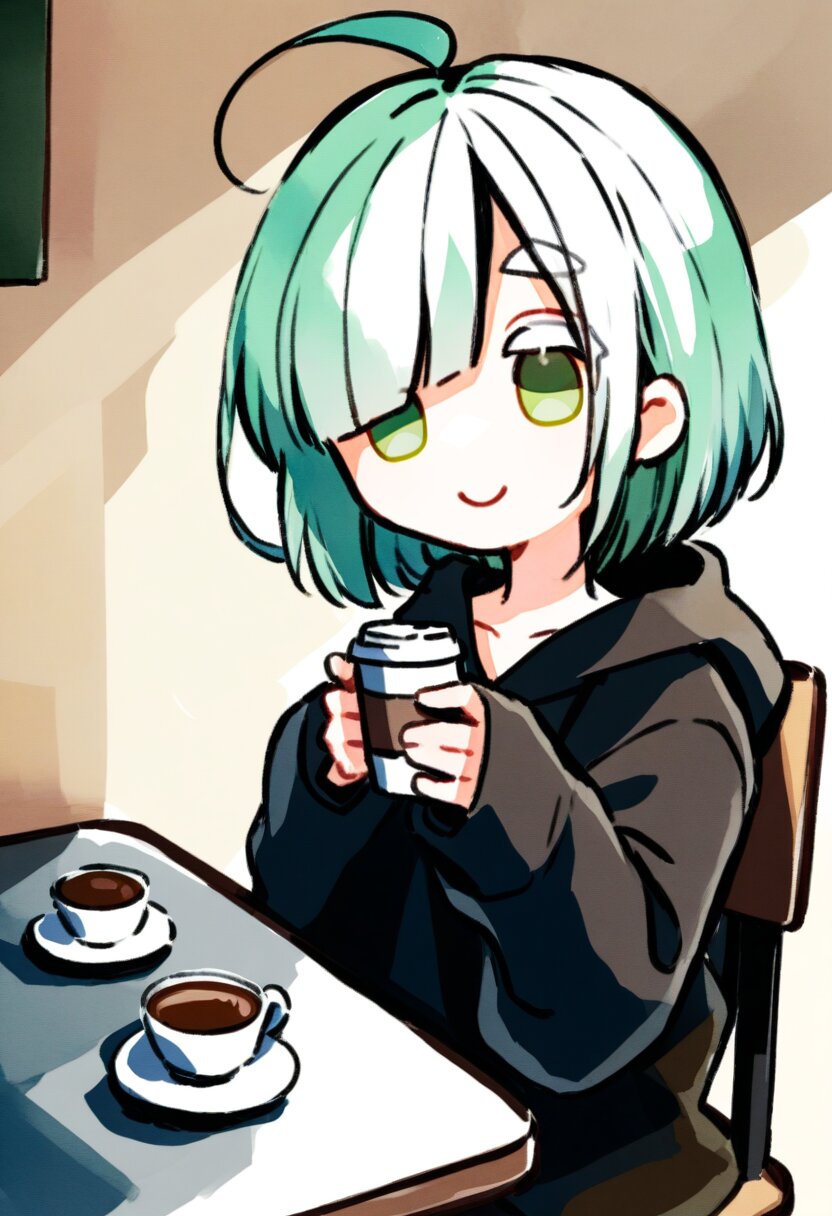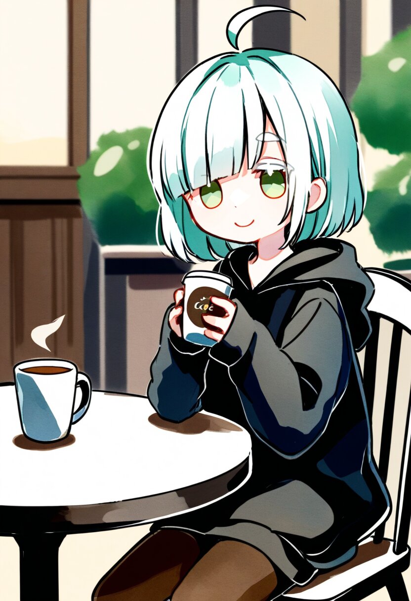 <lora:inmnstylexl:1>, best quality, masterpiece, very aesthetic, watercolor painting, general, chibi, 1girl, 10 years old, (bright white hair), short hair, blunt bangs, white thick eyebrow, white colored eyelashes, (hair over one eye), ahoge, oversize black hoodie, sleeves past wrists, brown tights, smile, holding espresso, cafe, table, sitting chair, mint green eyes