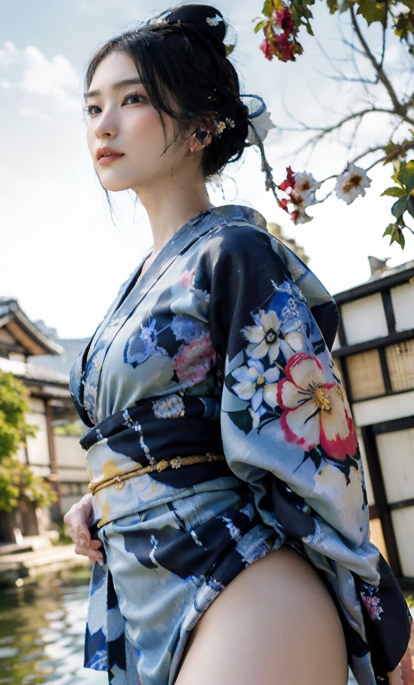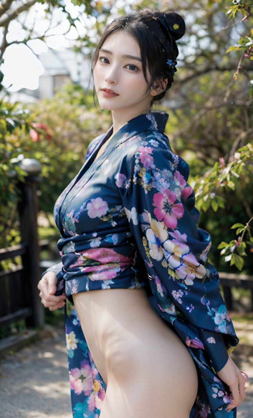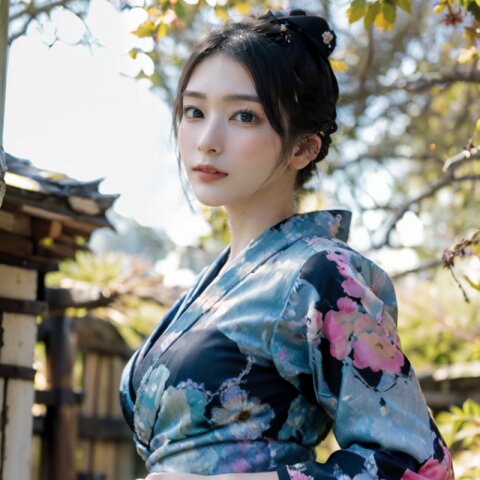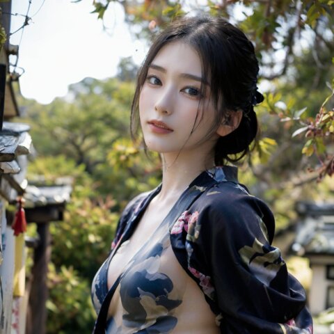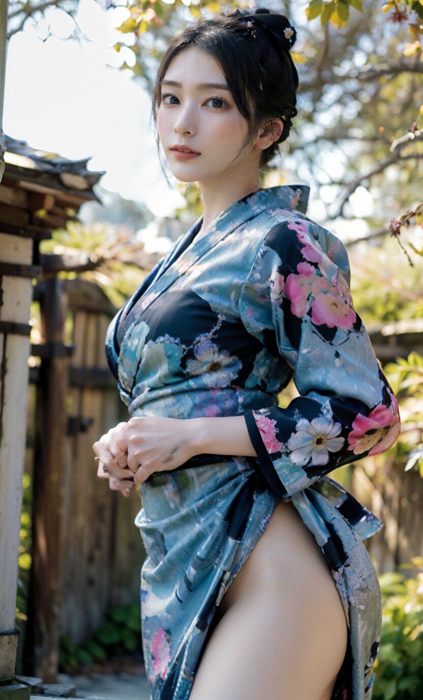 (8k, best quality, masterpiece:1.4), (realistic, photo-realistic:1.6), ultra-detailed, (sexy pose, random angle: 1.6), 1girl, solo, 22 years old, (slender: 1.6), long hair, (cowboy shot: 1.6), perfect body, highly detailed, shiny skin, shiny hair, looking at viewer, (floral printed kimono, japanese style hair bun: 1.6), (temple garden: 1.2), <lora:rin_v01:1>