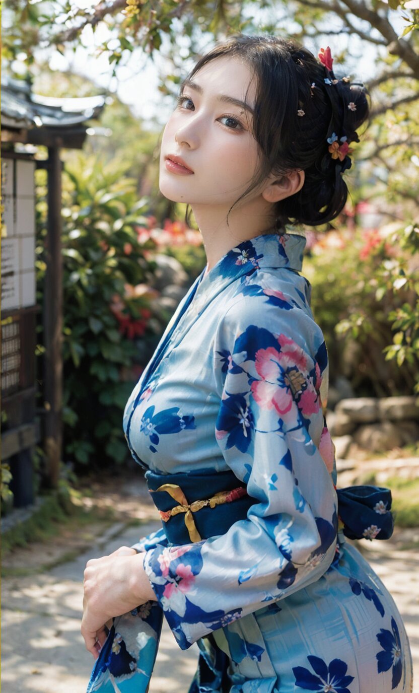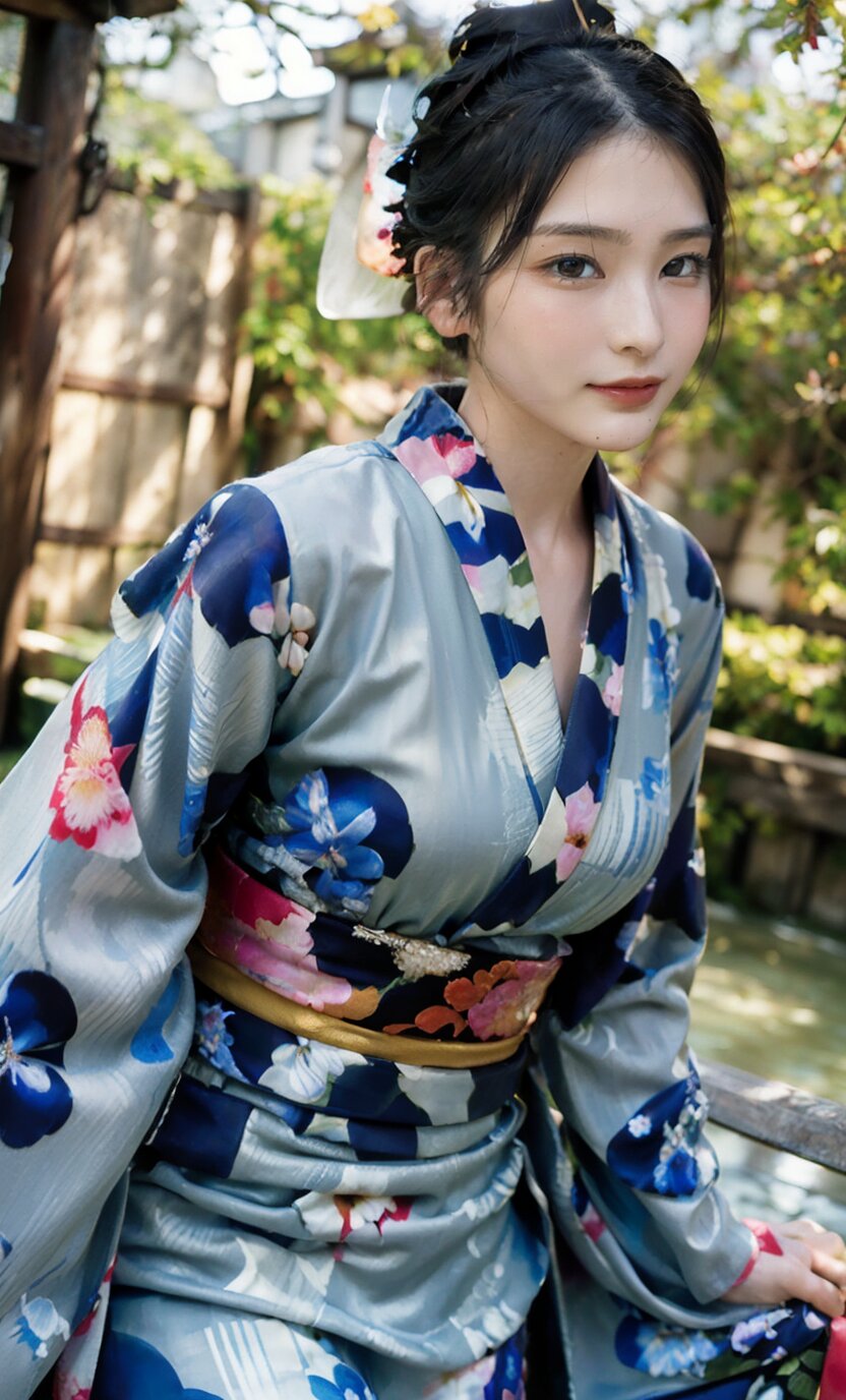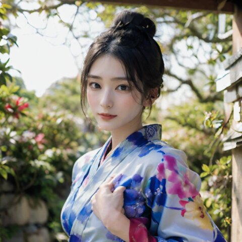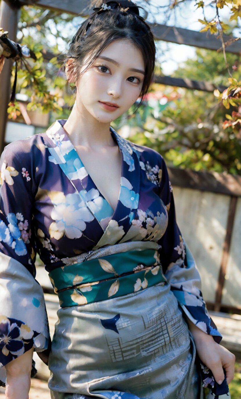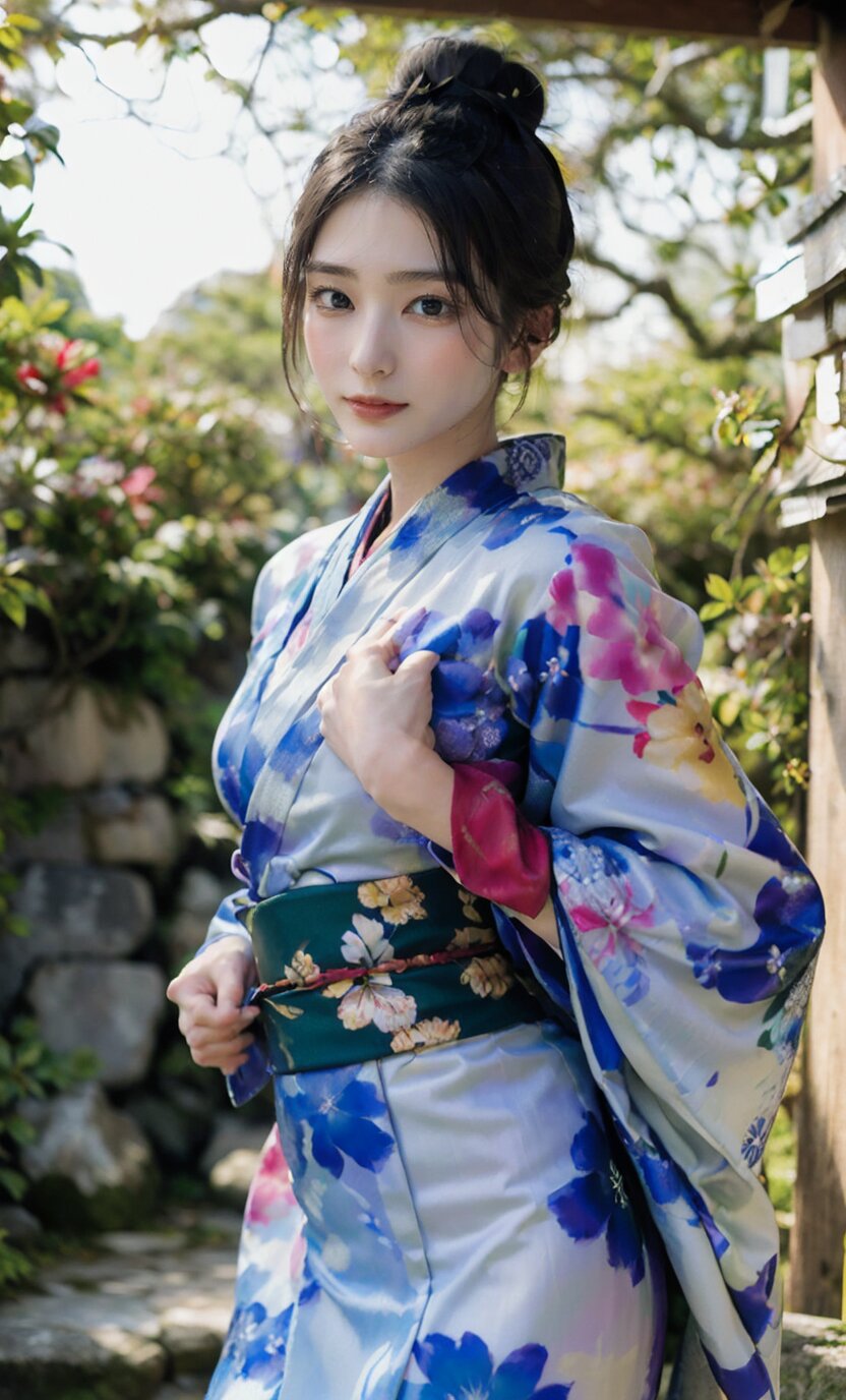 (8k, best quality, masterpiece:1.4), (realistic, photo-realistic:1.6), ultra-detailed, (sexy pose, random angle: 1.6), 1girl, solo, 22 years old, (slender: 1.6), long hair, (cowboy shot: 1.6), perfect body, highly detailed, shiny skin, shiny hair, looking at viewer, (floral printed kimono, japanese style hair bun: 1.6), (temple garden: 1.2), <lora:rin_v01:1>