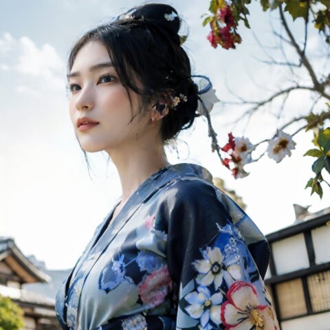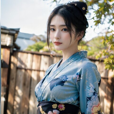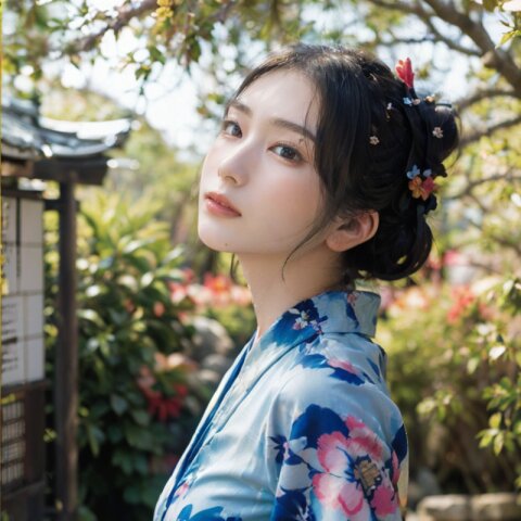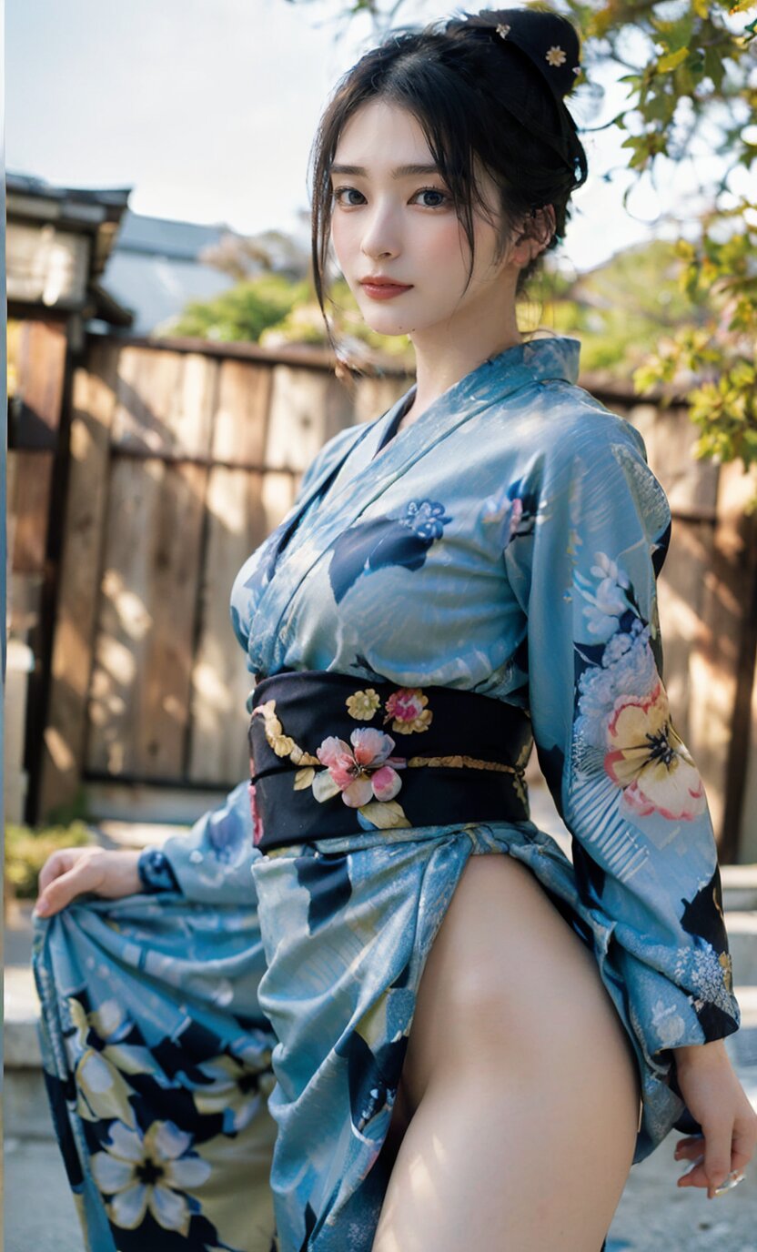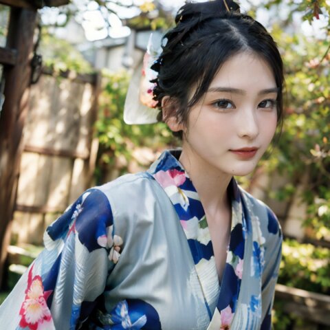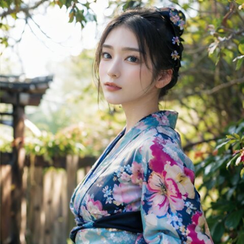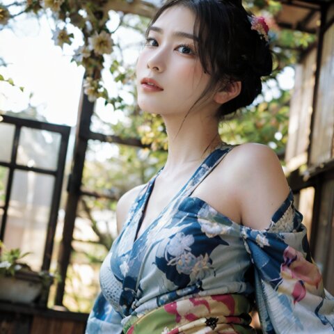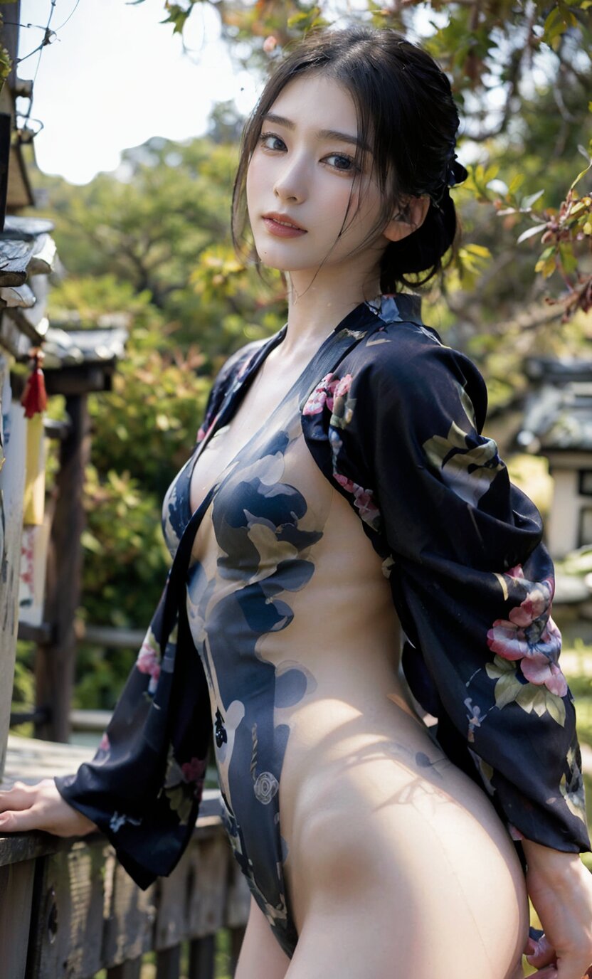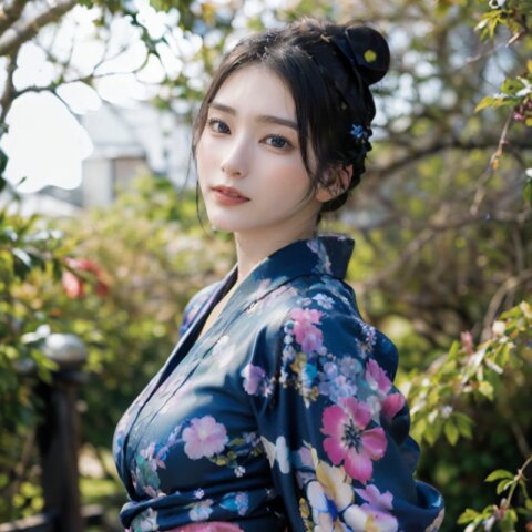 (8k, best quality, masterpiece:1.4), (realistic, photo-realistic:1.6), ultra-detailed, (sexy pose, random angle: 1.6), 1girl, solo, 22 years old, (slender: 1.6), long hair, (cowboy shot: 1.6), perfect body, highly detailed, shiny skin, shiny hair, looking at viewer, (floral printed kimono, japanese style hair bun: 1.6), (temple garden: 1.2), <lora:rin_v01:1>