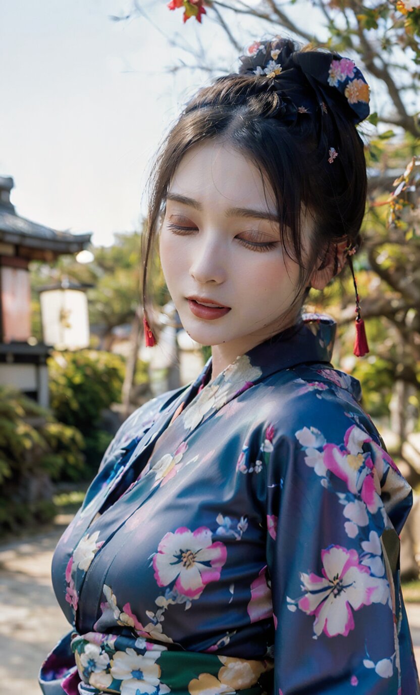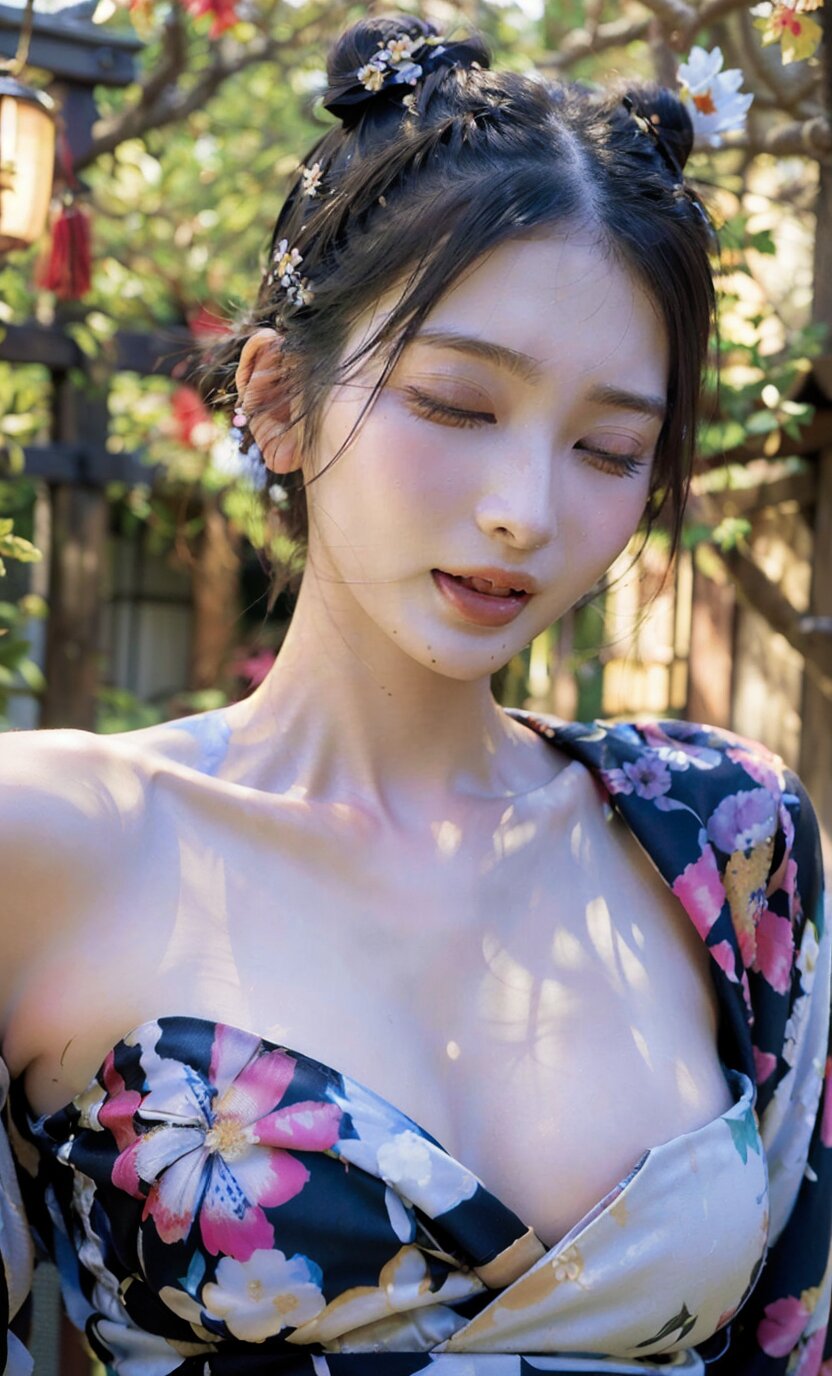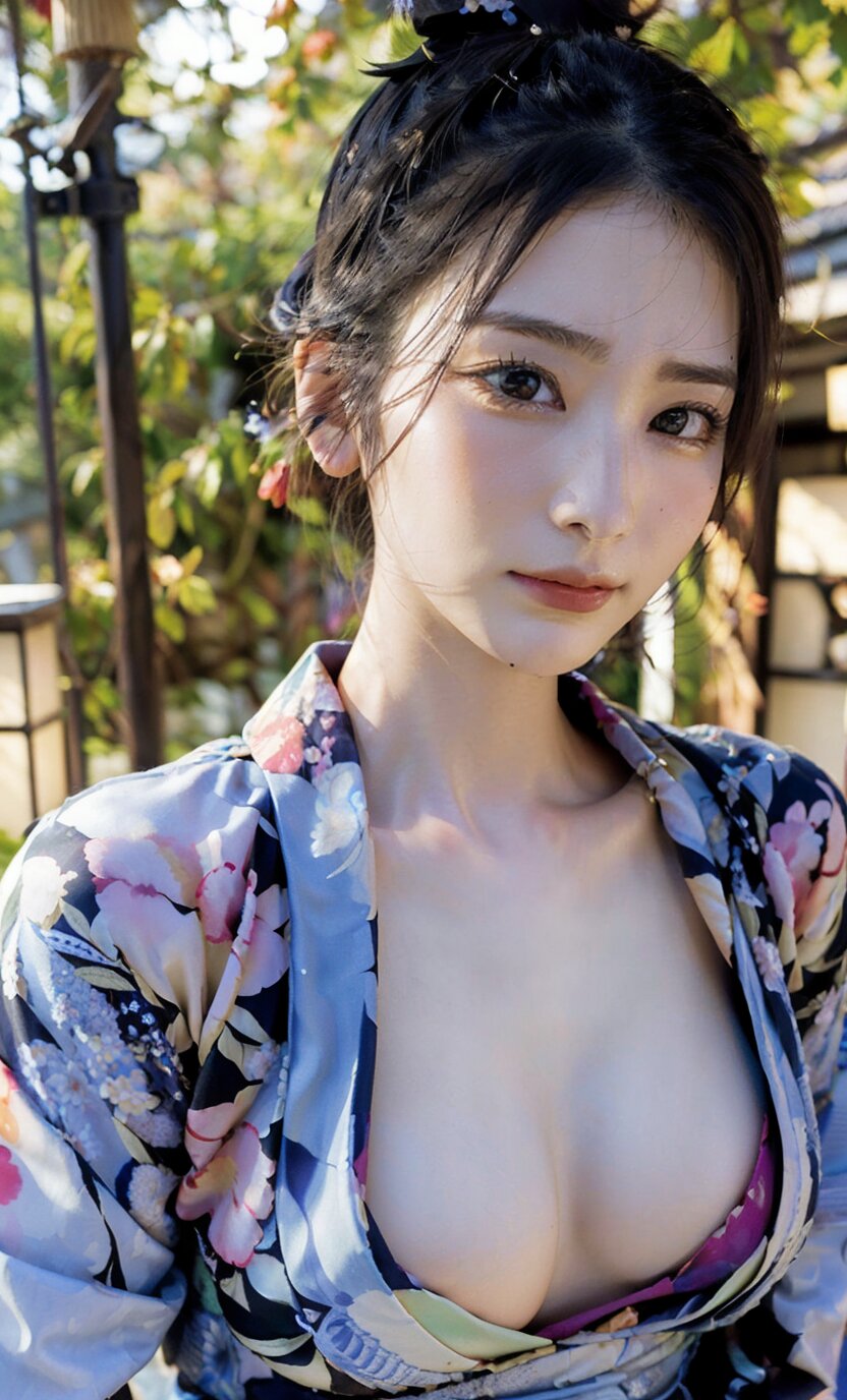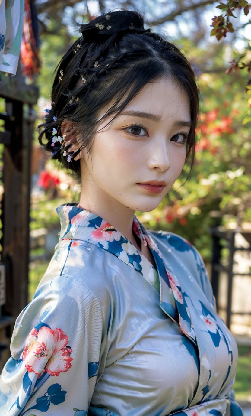 (8k, best quality, masterpiece:1.4), (realistic, photo-realistic:1.6), ultra-detailed, (sexy pose, from front: 1.8), 1girl, solo, 22 years old, (slender: 1.6), long hair, (upper body, face: 1.6), perfect body, highly detailed, shiny skin, shiny hair, looking away, (floral printed kimono, japanese style hair bun: 1.6), (temple garden: 1.2), <lora:rin_v01:1>