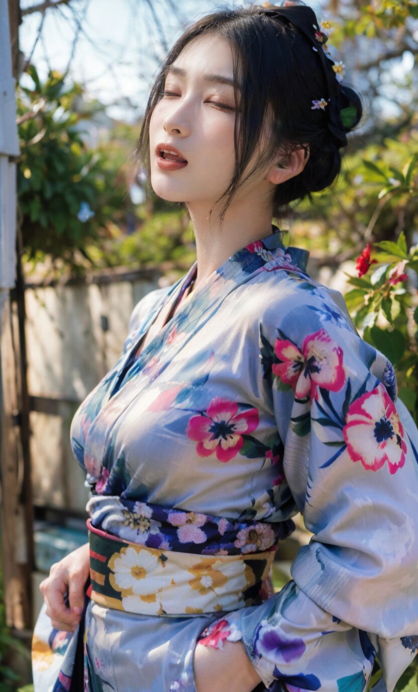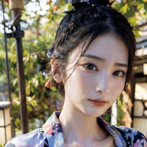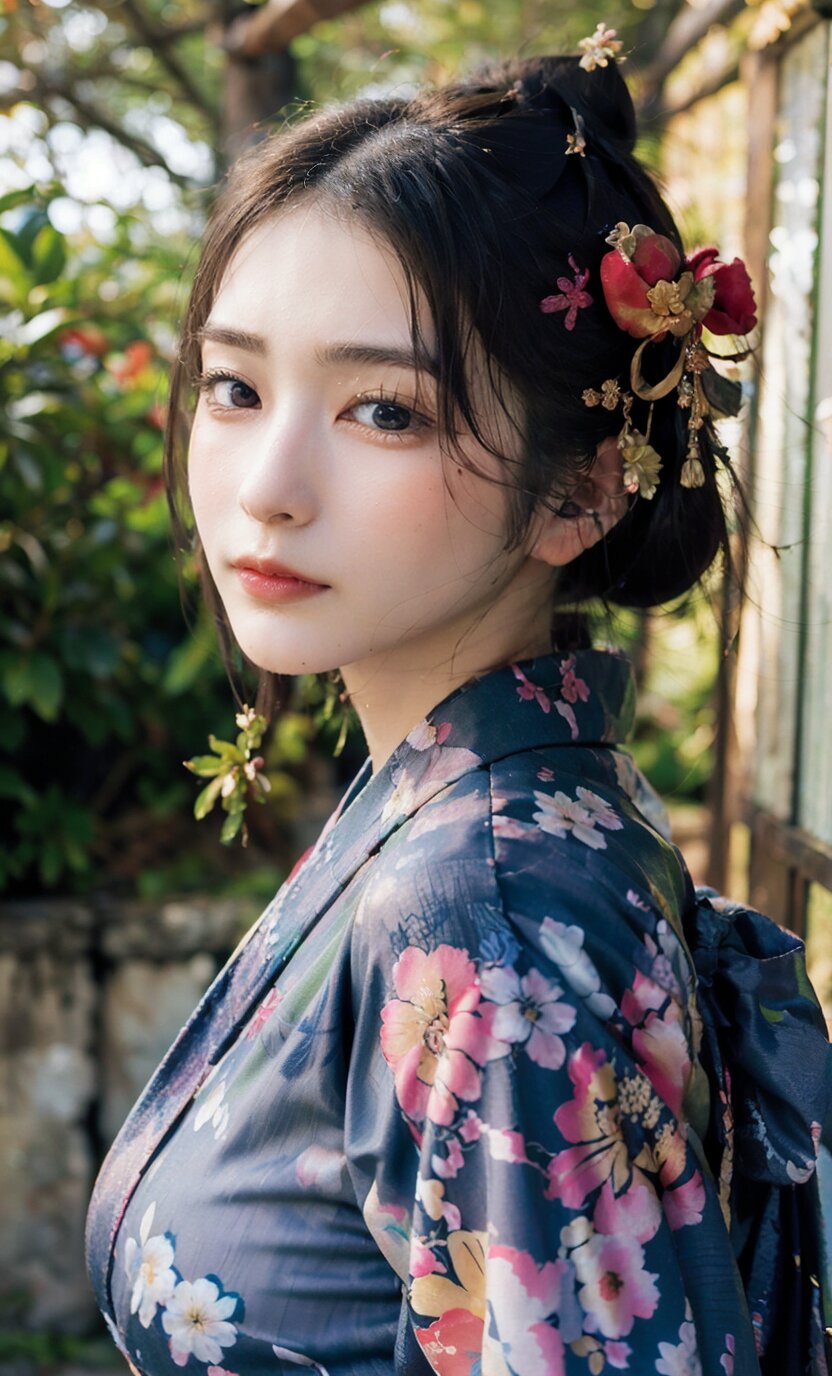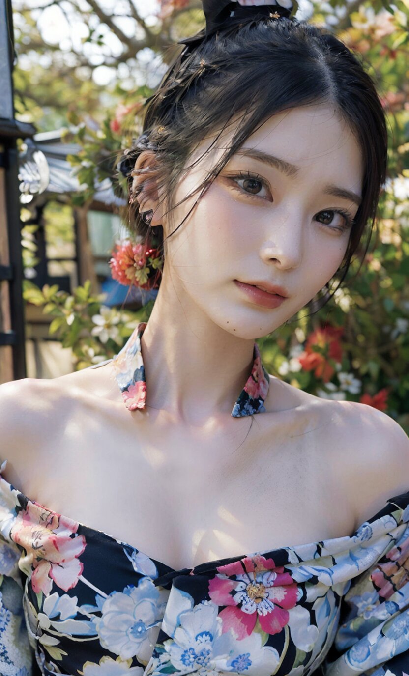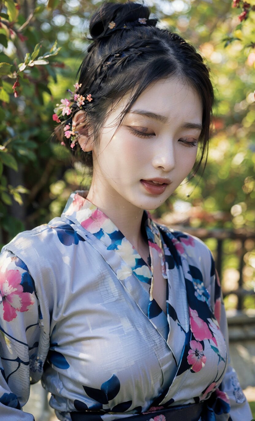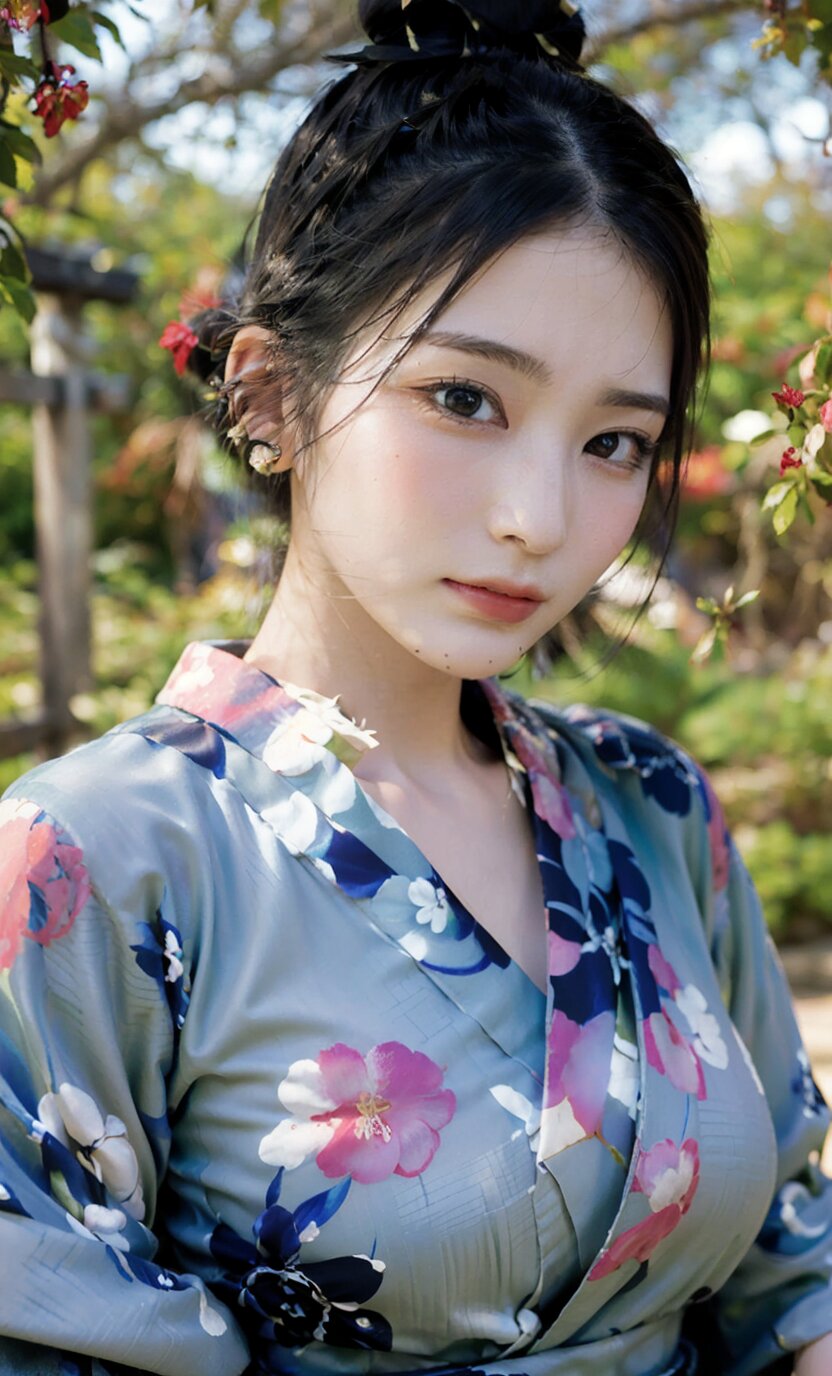 (8k, best quality, masterpiece:1.4), (realistic, photo-realistic:1.6), ultra-detailed, (sexy pose, from front: 1.8), 1girl, solo, 22 years old, (slender: 1.6), long hair, (upper body, face: 1.6), perfect body, highly detailed, shiny skin, shiny hair, looking away, (floral printed kimono, japanese style hair bun: 1.6), (temple garden: 1.2), <lora:rin_v01:1>