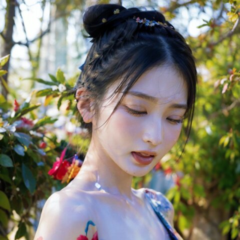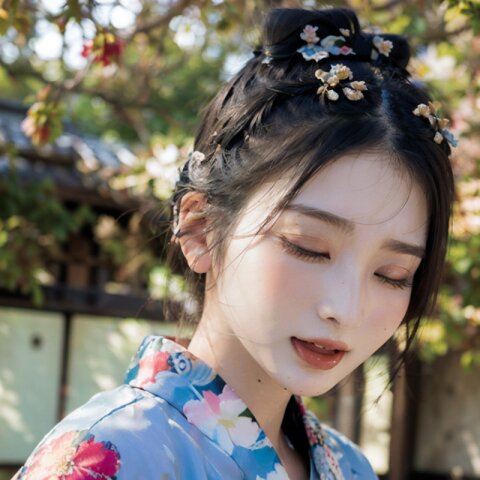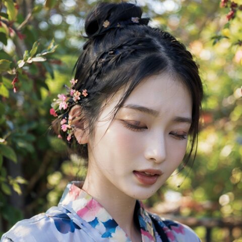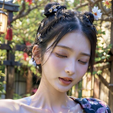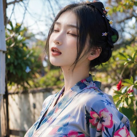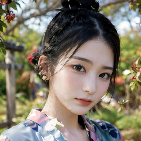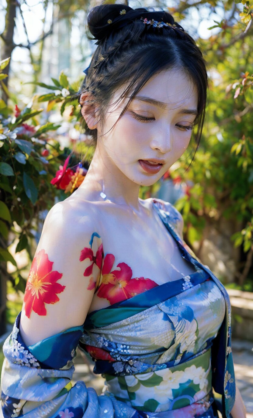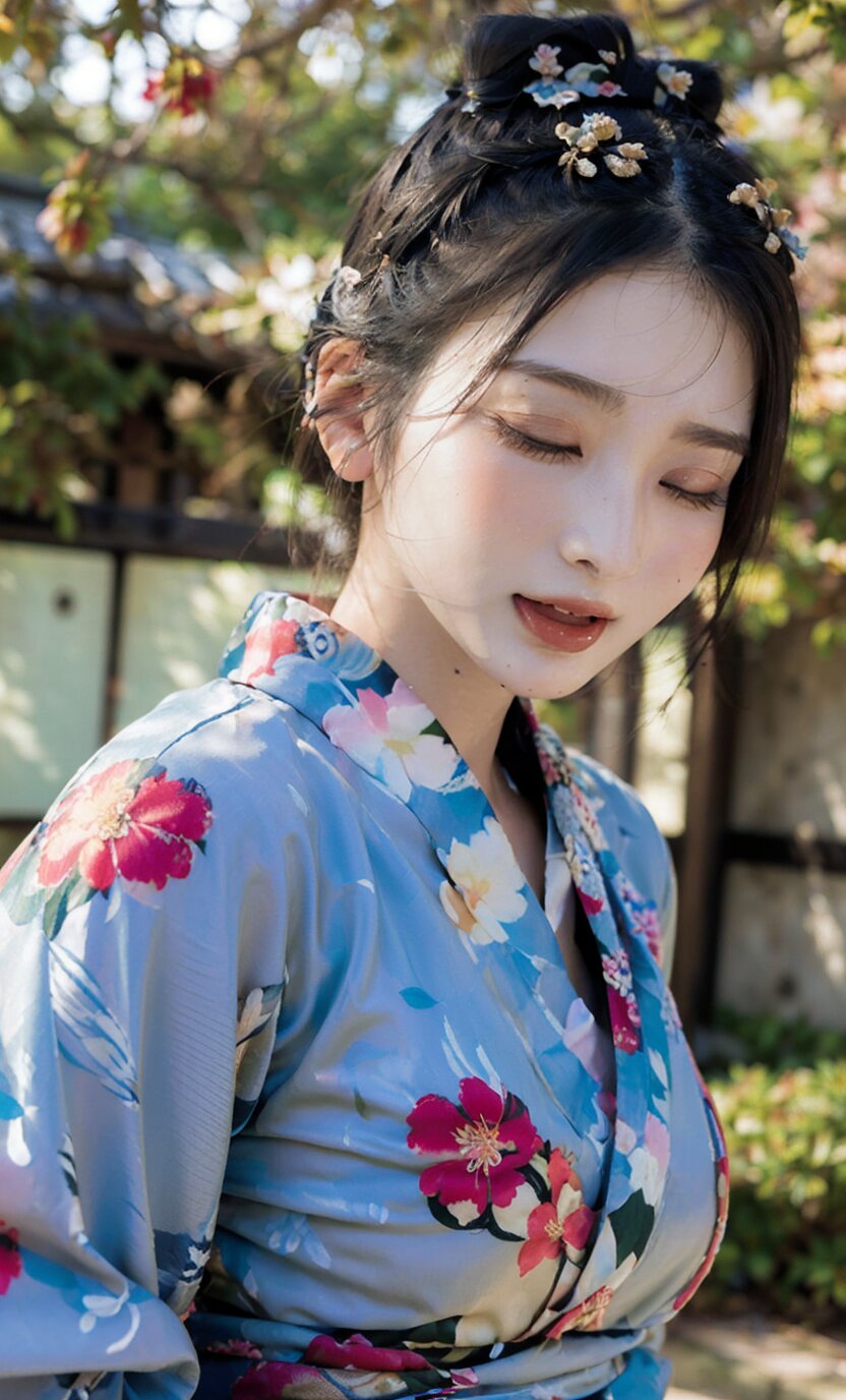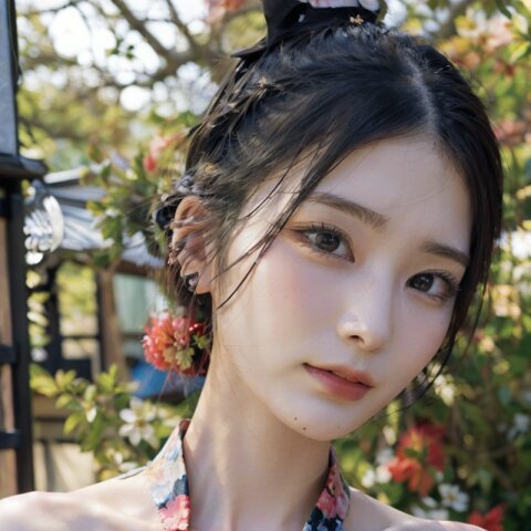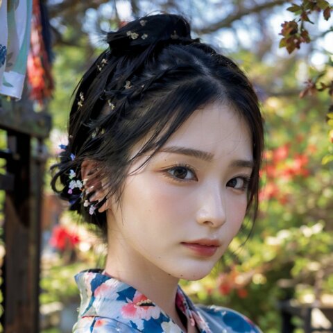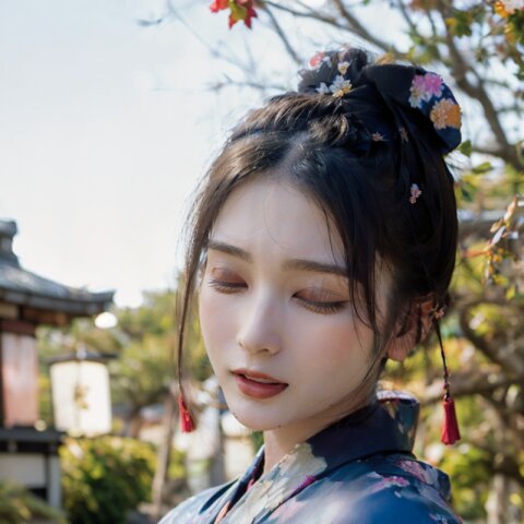 (8k, best quality, masterpiece:1.4), (realistic, photo-realistic:1.6), ultra-detailed, (sexy pose, from front: 1.8), 1girl, solo, 22 years old, (slender: 1.6), long hair, (upper body, face: 1.6), perfect body, highly detailed, shiny skin, shiny hair, looking away, (floral printed kimono, japanese style hair bun: 1.6), (temple garden: 1.2), <lora:rin_v01:1>