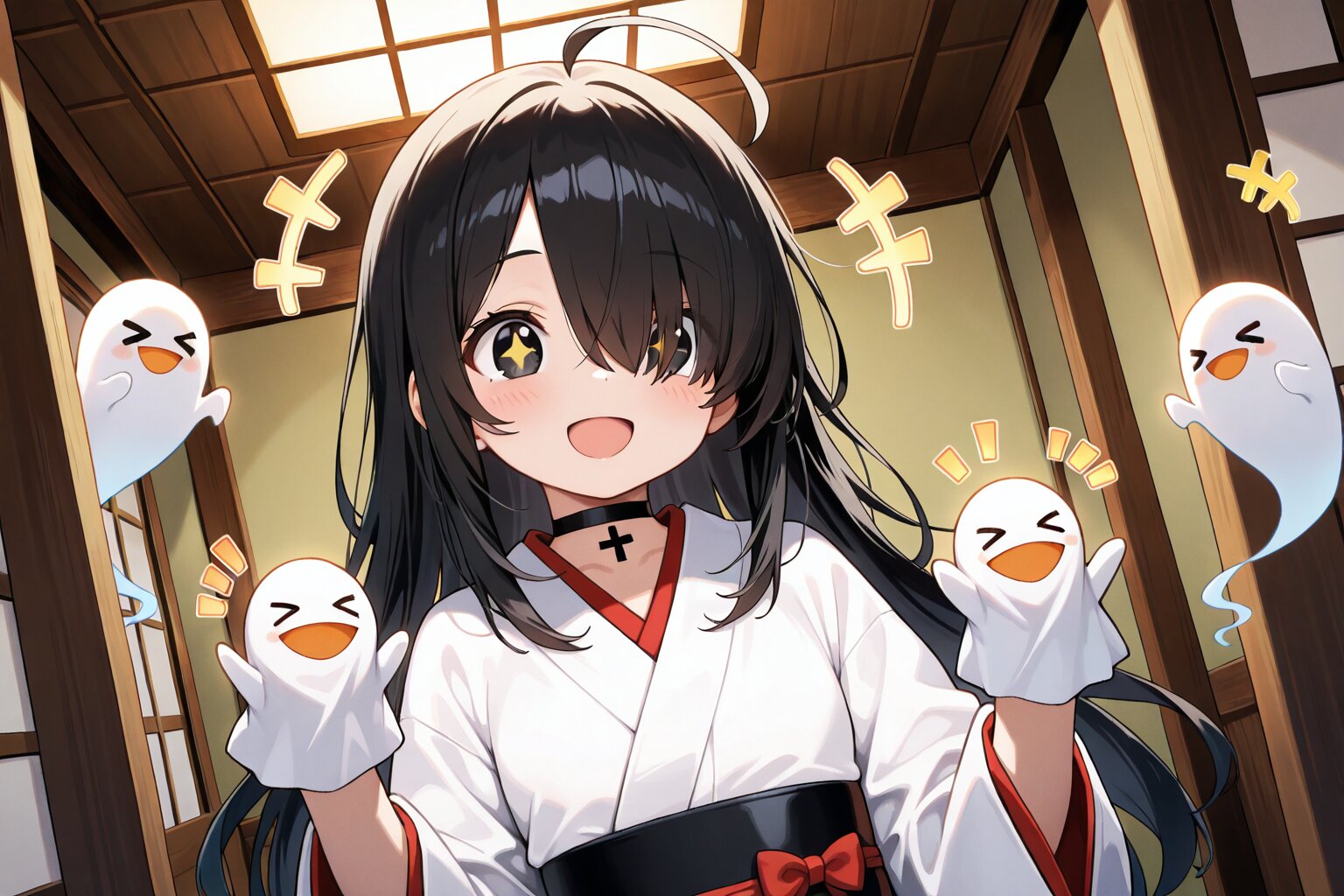 1 little girl, solo, diagonal angle, upper body, masterpiece, best quality, amazing quality, very aesthetic, black hair, long hair, ahoge, (hair over one eyes:1.2), black eyes, +_+, open mouth, smile, cheerful, +++, notice lines, choker, white kimono, ghost, ghost hand puppet, > <, in japanese room,