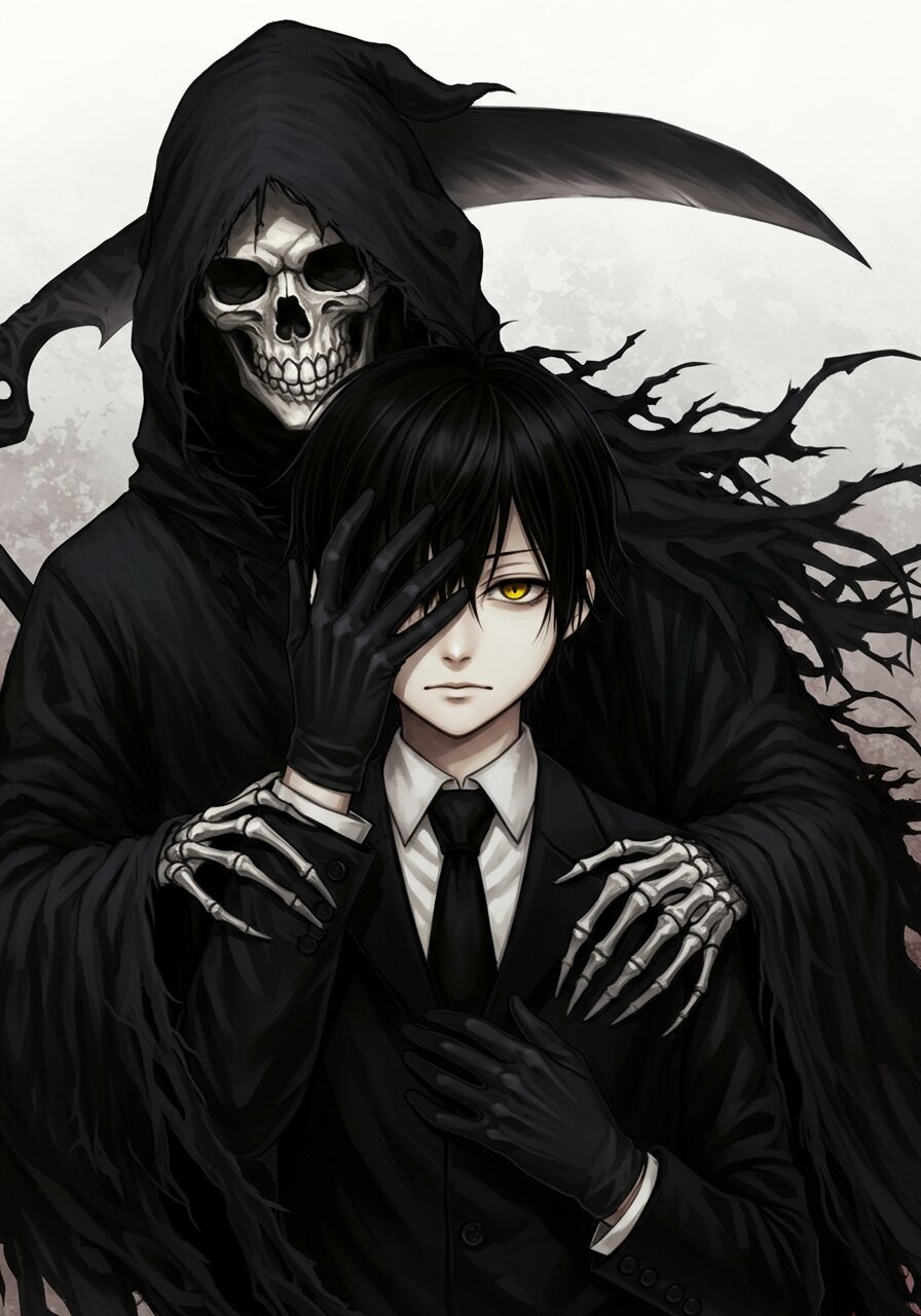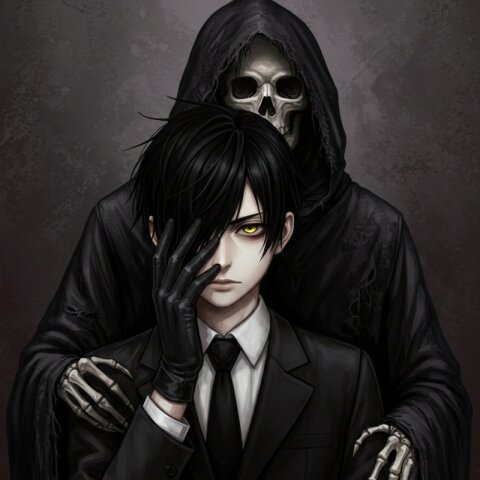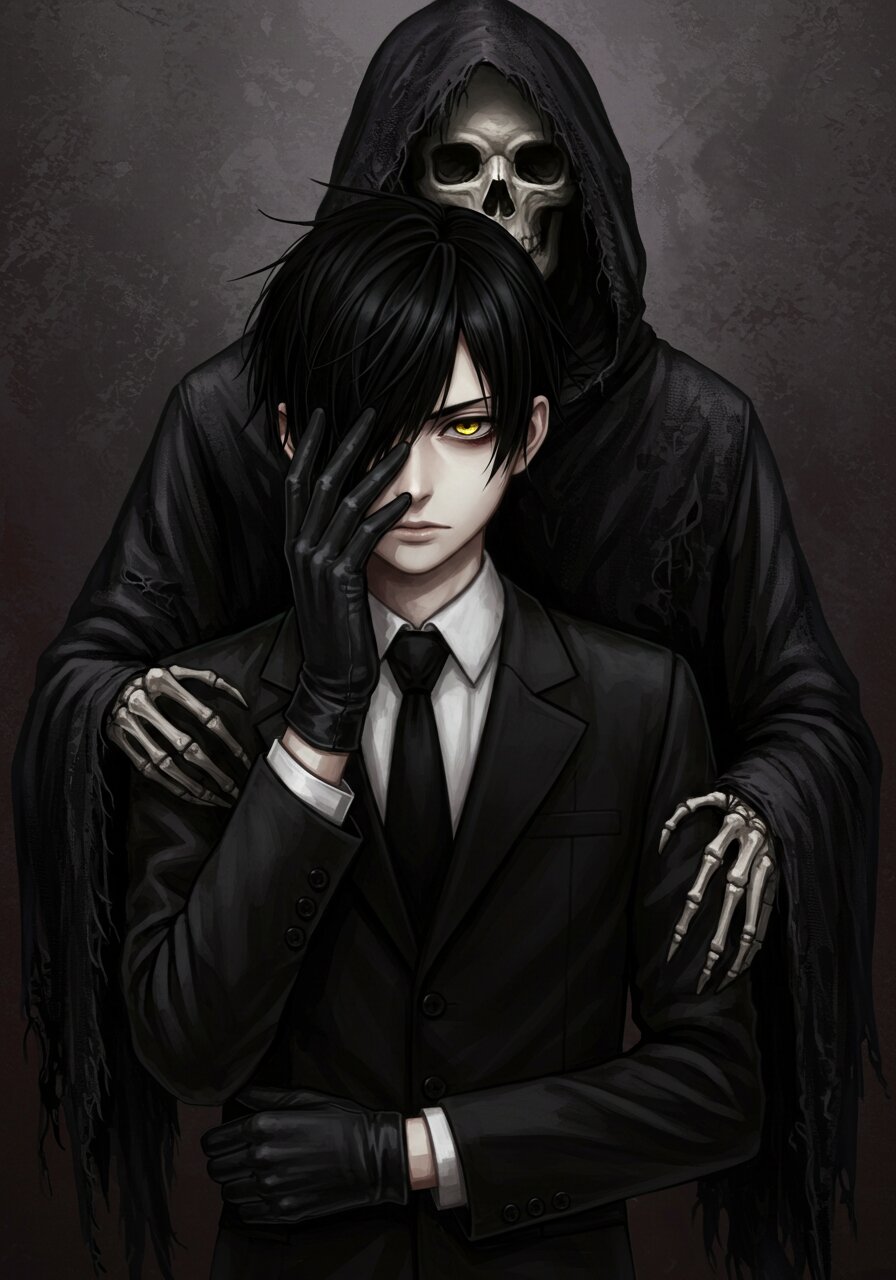 A realistic illustration of a boy with black hair, with hair completely covering one of his eyes, yellow eyes, wearing a black suit and black gloves, with a serious and expressionless face. Standing close beside him is a grim reaper, cloaked in tattered black robes, their presence ominous yet silent, as if watching over him like a shadow.